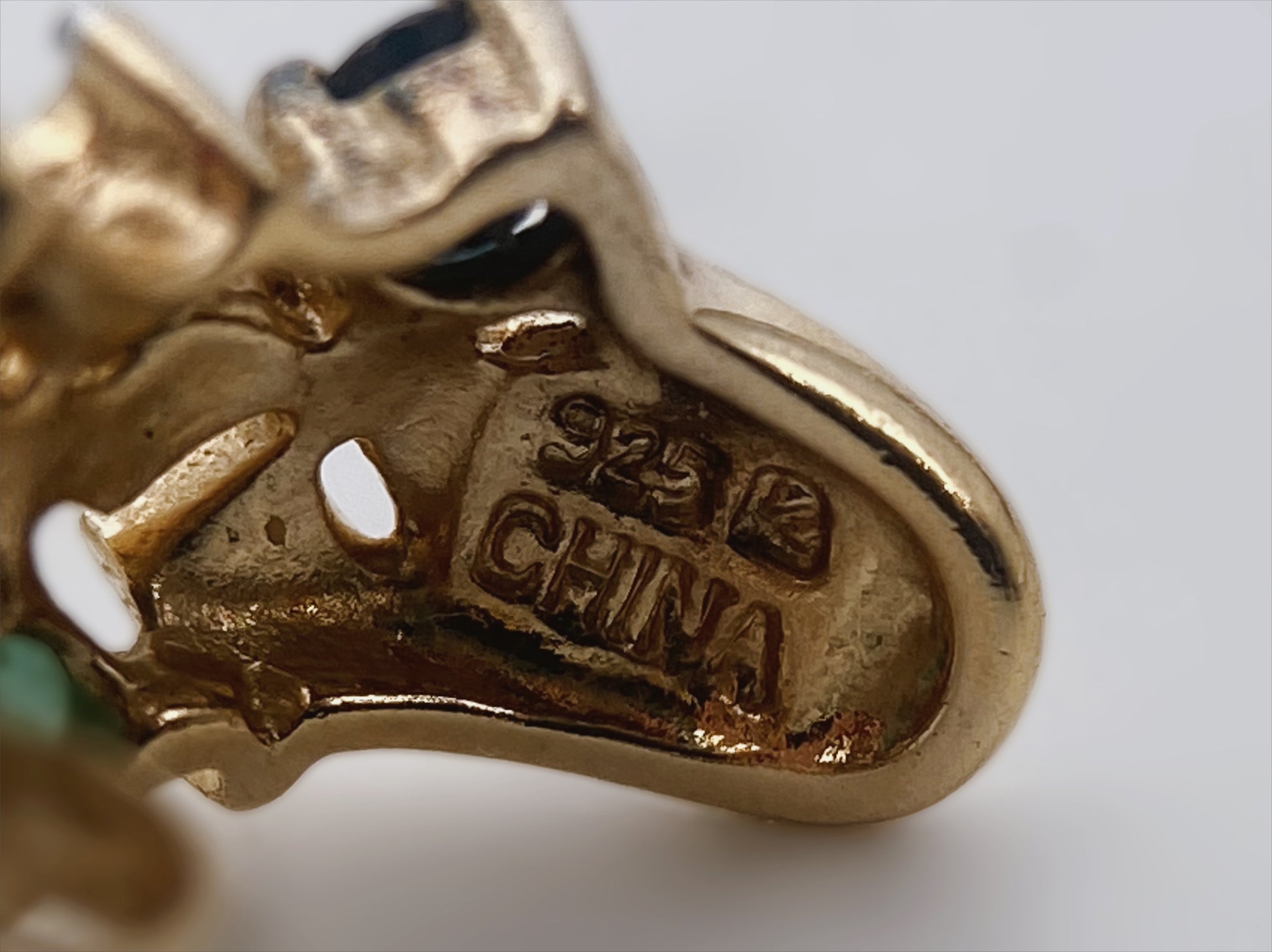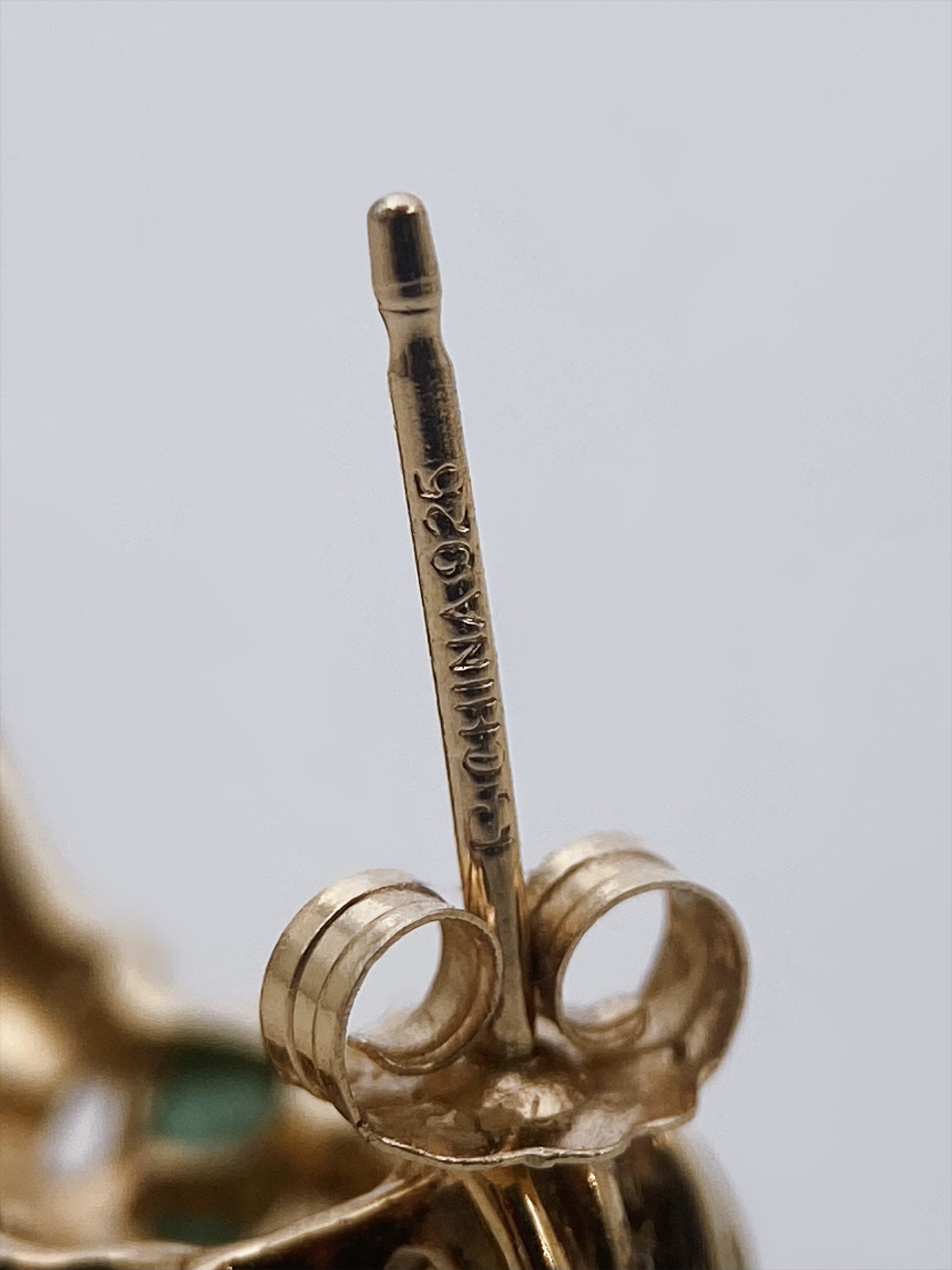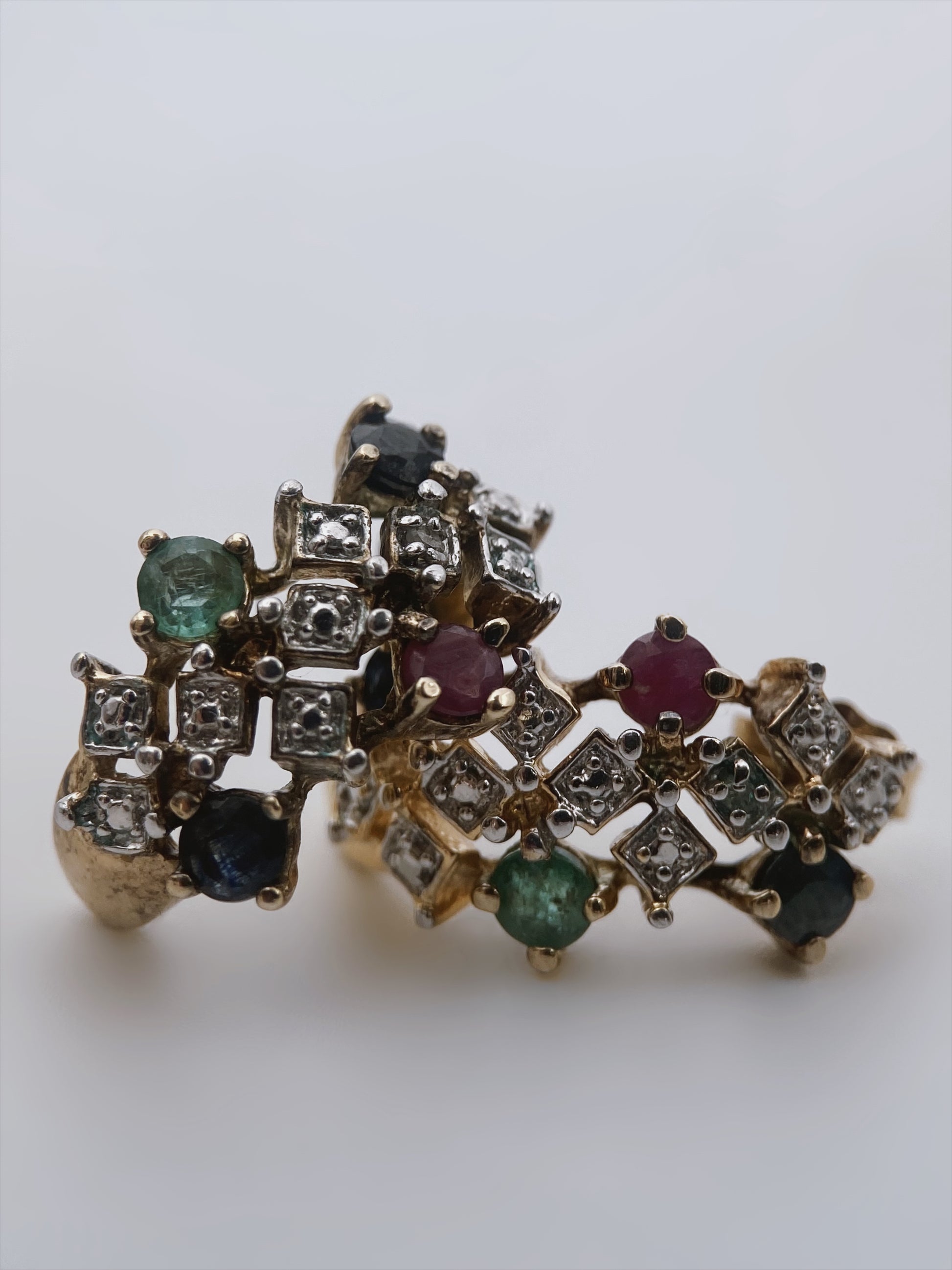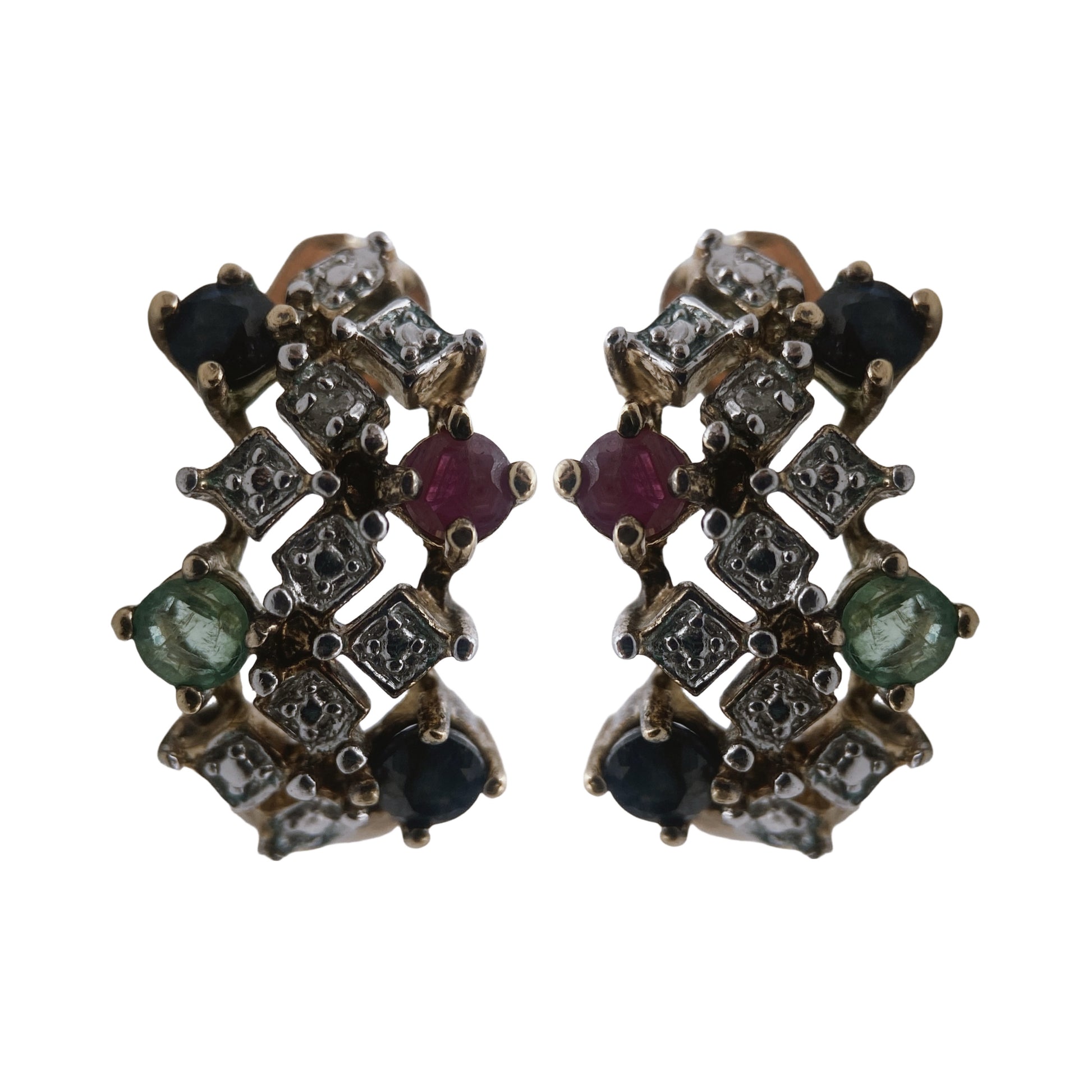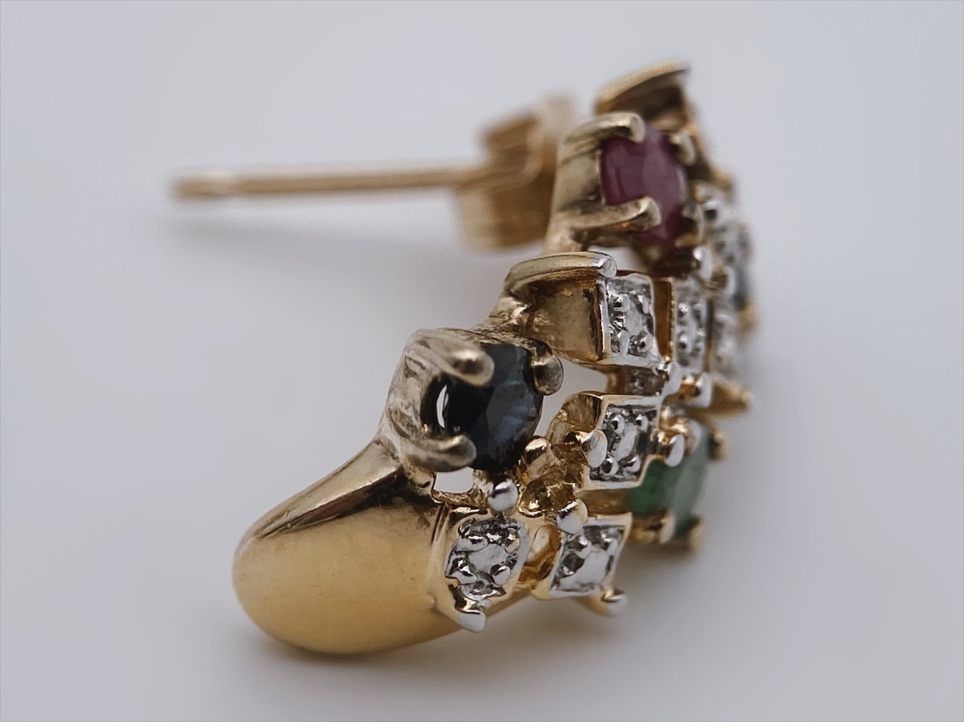 Stilingi ir elegantiški auskarai, pagaminti iš 925 prabos sidabro, padengti aukso sluoksniu. Puslankio formos auskarai dekoruoti mėlynos, žalios, raudonos ir skaidrios spalvų akmenimis, primenančiais brangakmenius – safyrus, smaragdus, rubinus ir deimantus. Geometrinis dizainas suteikia prabangos įspūdį, o aukso spalva subtiliai išryškina kiekvieną detalę. Tikėtina, kad žali akmenukai yra smaragdų imitacijos, audoni – rubinų imitacijos, mėlyni – safyrų imitacijos, skaidrūs – mažyčiai dirbtiniai deimantai.