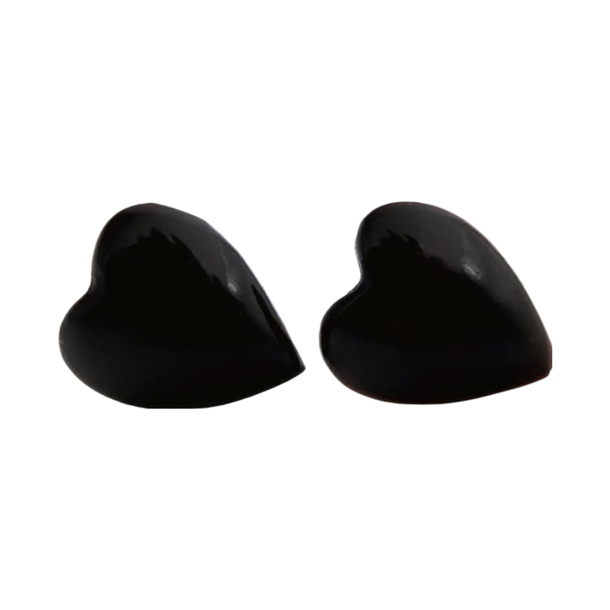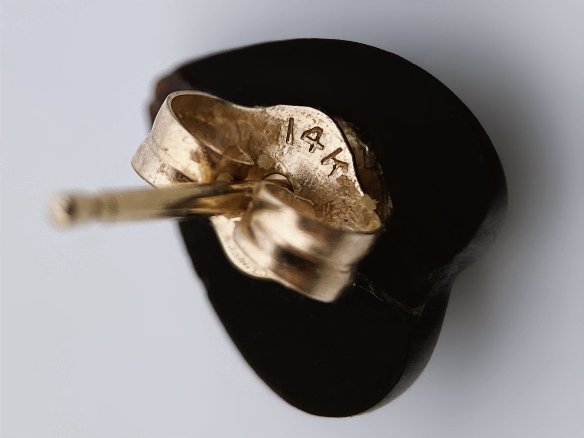 Juodo onikso širdelės formos auskarai su 14K aukso smeigtuku. Užsegimas pažymėtas 14K – tai reiškia 14 karatų auksą (58,5 % gryno aukso). Nugarelė priklijuota prie akmens, kas būdinga rankų darbo ar mažos gamybos auskarams. Greičiausiai pagaminti XX a. pab. – XXI a. pr. (1980–2000 m.), remiantis minimalistiniu dizainu ir konstrukcija.