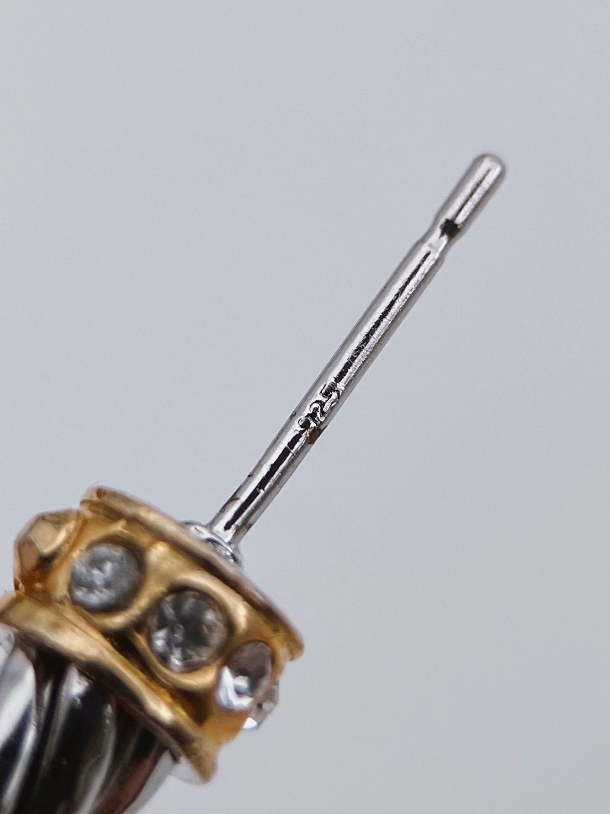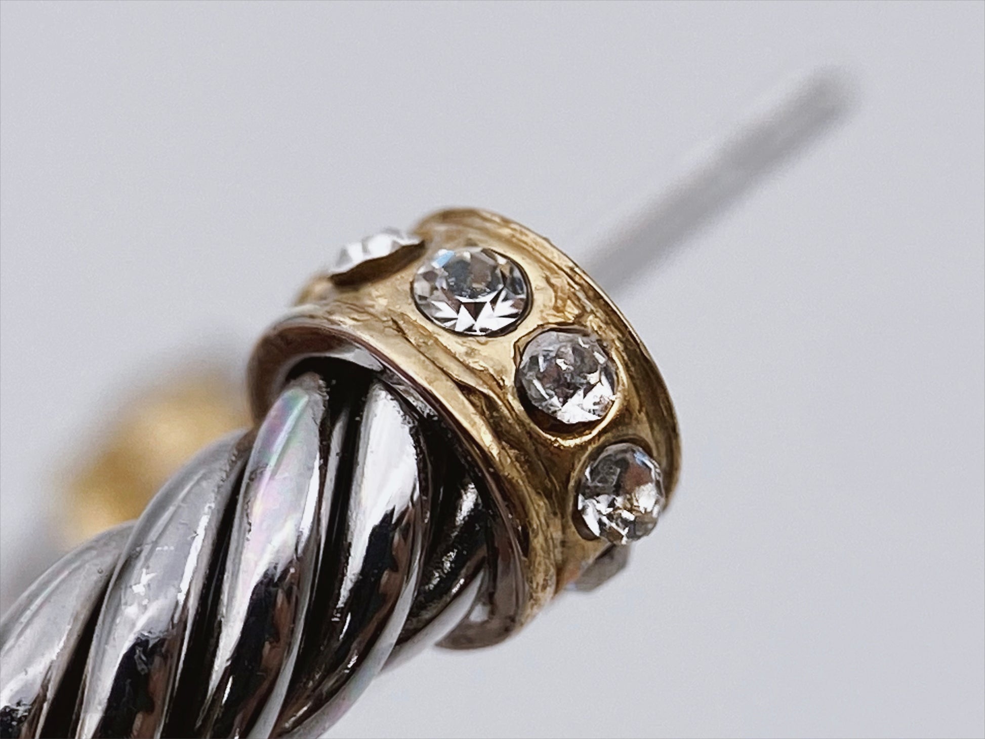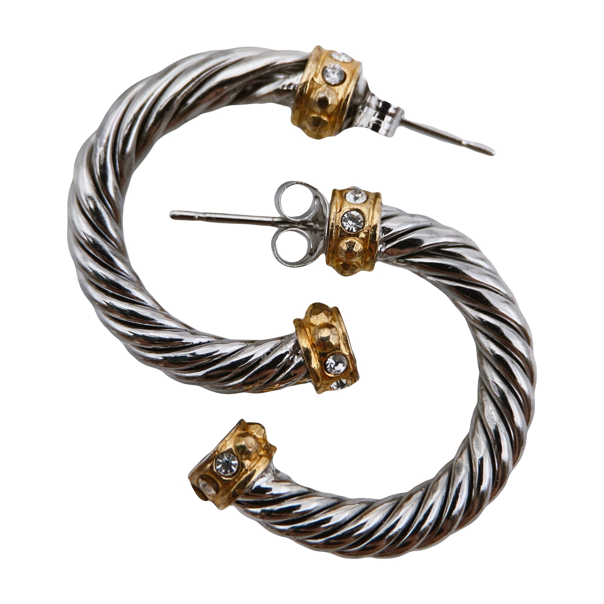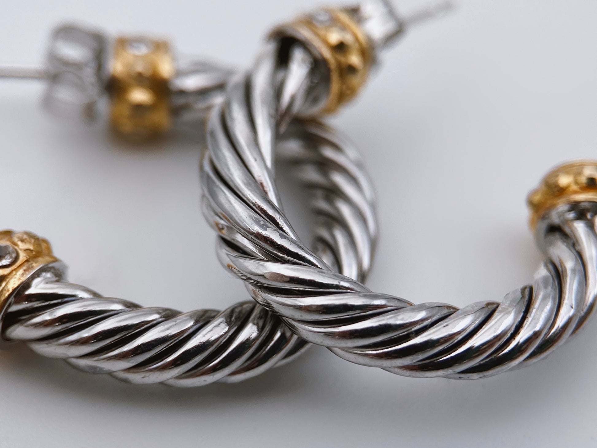 Elegantiški 925 prabos sidabro lankelio formos auskarai, sukurti klasikiniu „cable twist“ (susukto lyno) raštu. Auskarų galai dekoruoti paauksuotais žiedais, į kuriuos įstatyti skaidrūs kristalai, suteikiantys švytėjimo ir prabangos įspūdį. Šis dizainas įkvėptas garsaus „David Yurman“ stiliaus – derinant sidabro „twist“ tekstūrą su aukso ir kristalų akcentais.