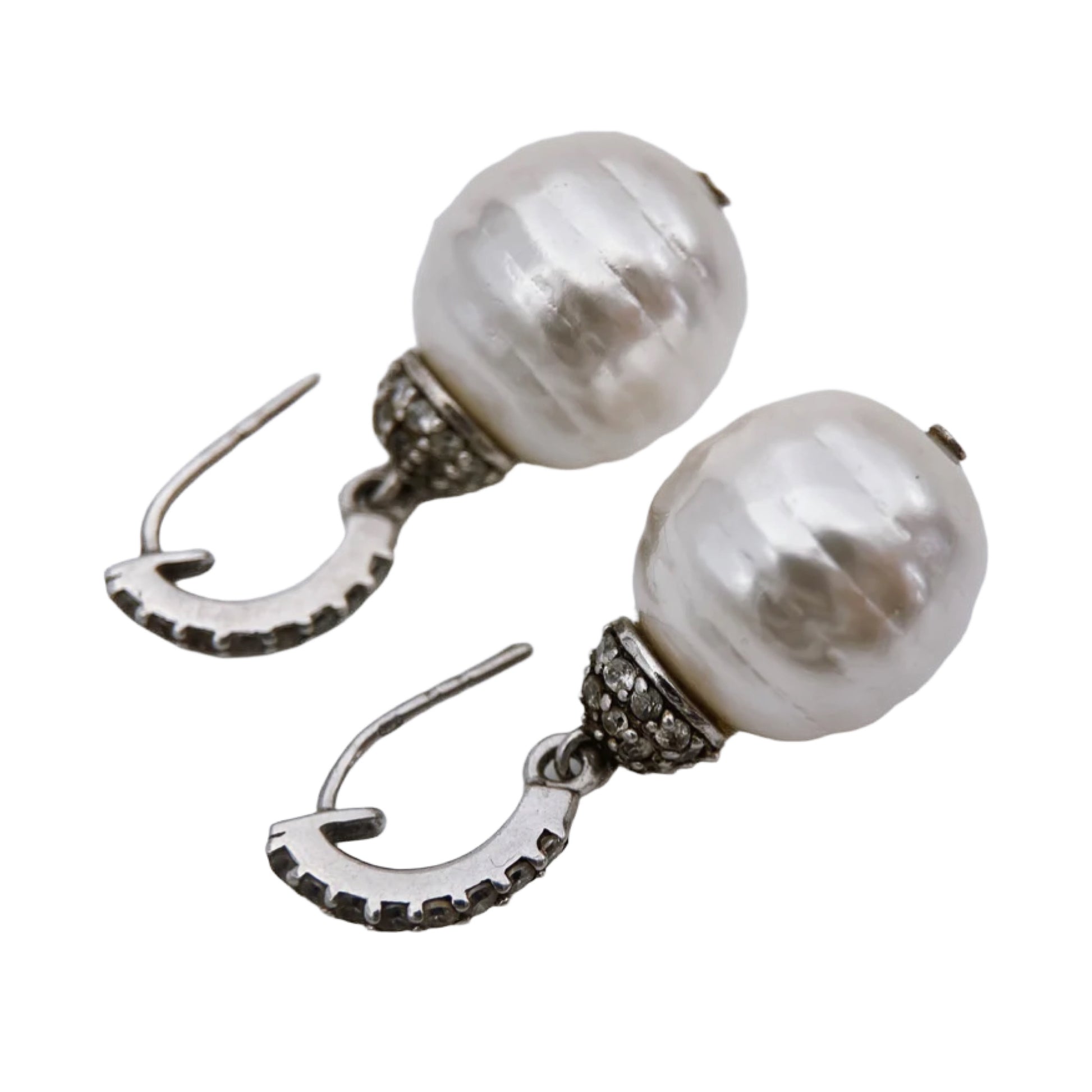 Sidabro auskarai papuošti didelėmis, nelygaus paviršiaus perlų imitacijomis ir smulkiais skaidriais akmenukais – cirkoniais. Kabliuko forma ir dantytas kraštelis rodo modernų dizainą.