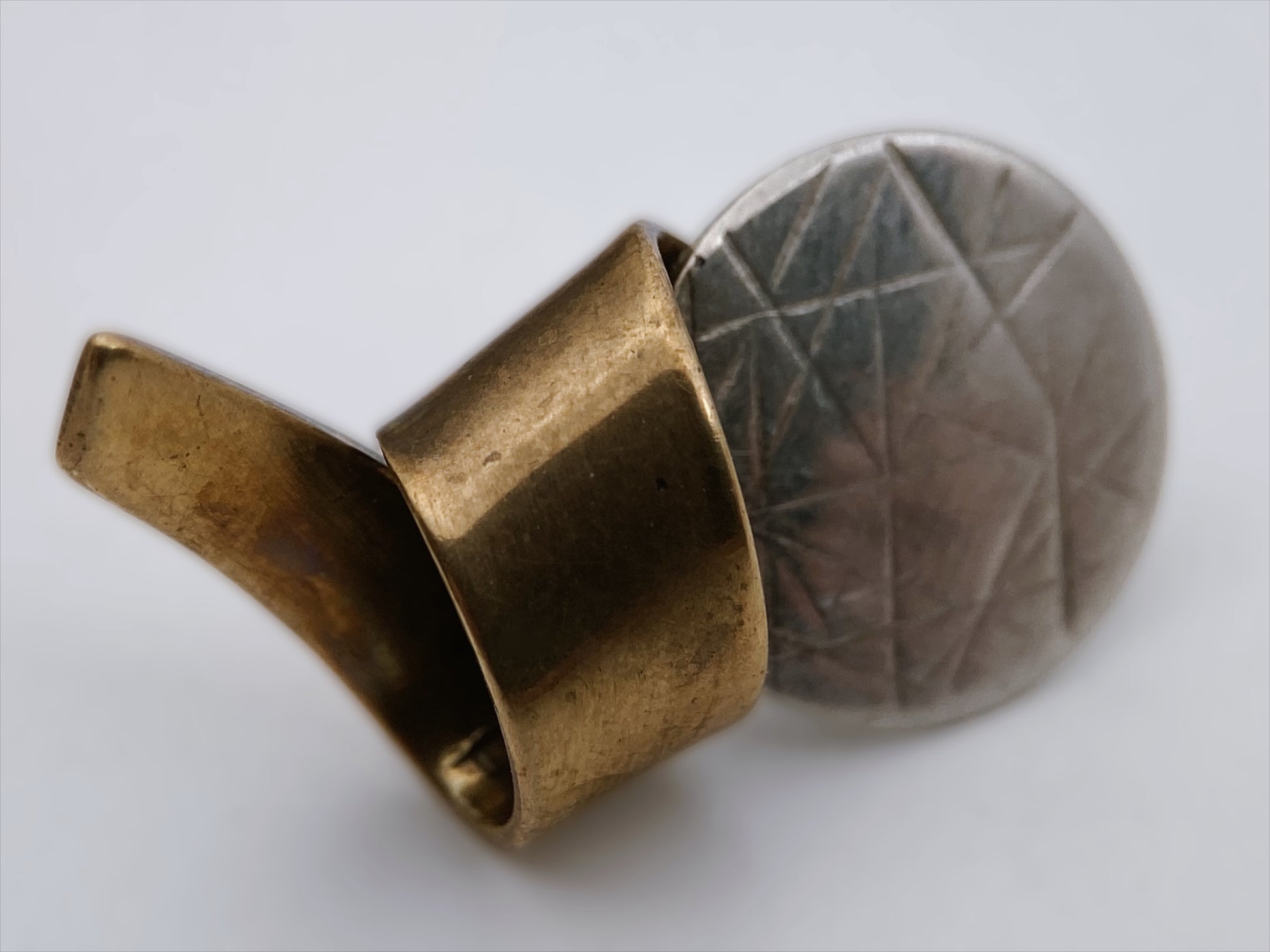 Sudėtis: sidabras, varis Gamybos būdas: rankų darbas Būklė: labai gera Išmatavimai: 2,6 x 1,7 cm Spalva: sidabro, bronzos Žymėjimas: “STERLING”, “Hall McFall” (rankinis graviravimas) Šalis: JAV Laikotarpis: 1975-1990 metai Kolekcinė vertė: 150-350 EUR