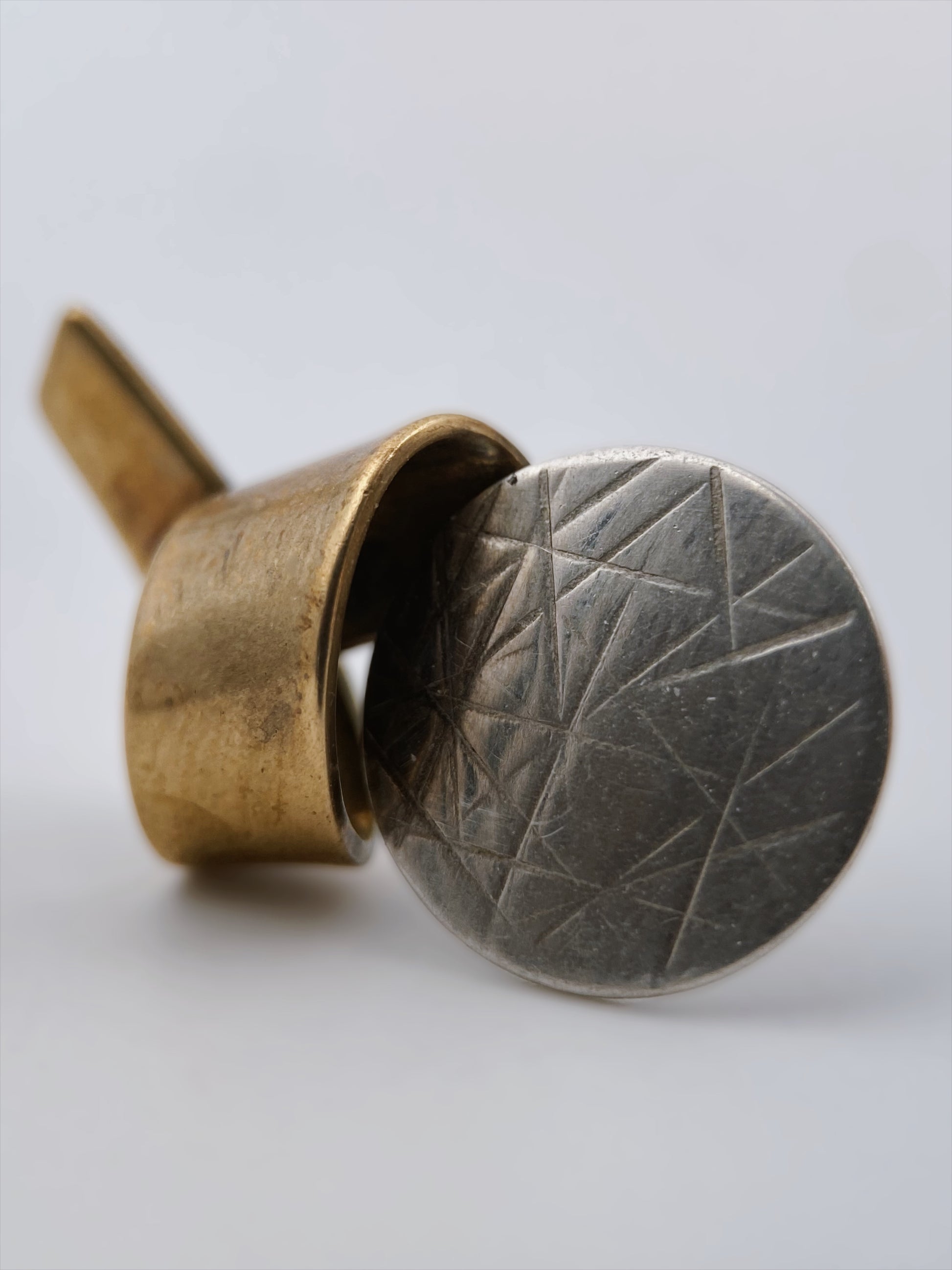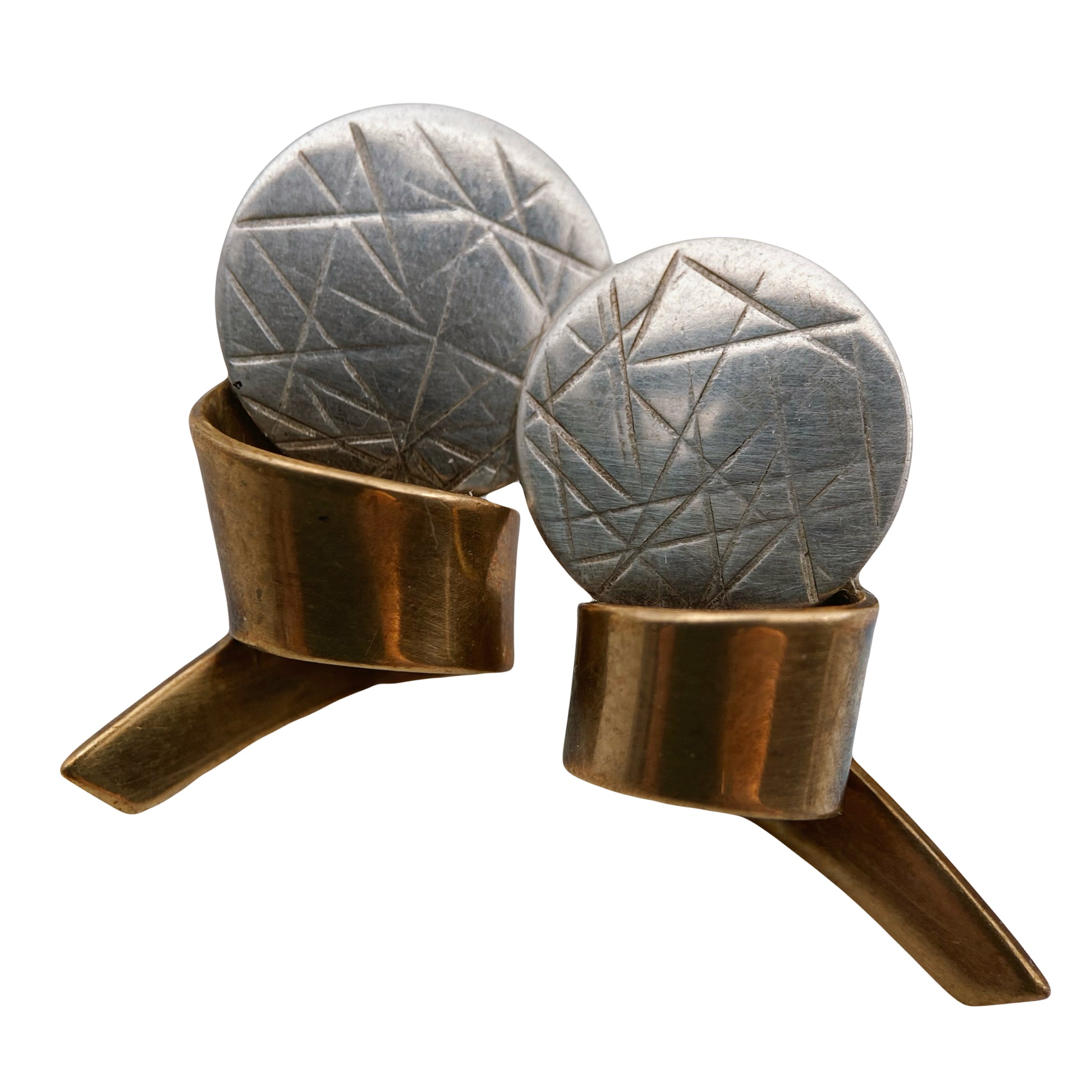 Retas ir kolekcinis Hall McFall juvelyrikos pavyzdys – modernistiniai auskarai, sukurti iš sterlingo sidabro ir vario, pasižymintys architektūrine forma ir subtiliu geometriniu graviravimu. Sidabriniai diskai dekoruoti linijiniu raštu, o šiltas vario paviršius suteikia kontrasto bei gylio. Tai klasikinis Hall McFall „mixed metal“ dizainas, vertinamas dėl savo minimalistinės estetikos ir meistriško metalo derinimo.