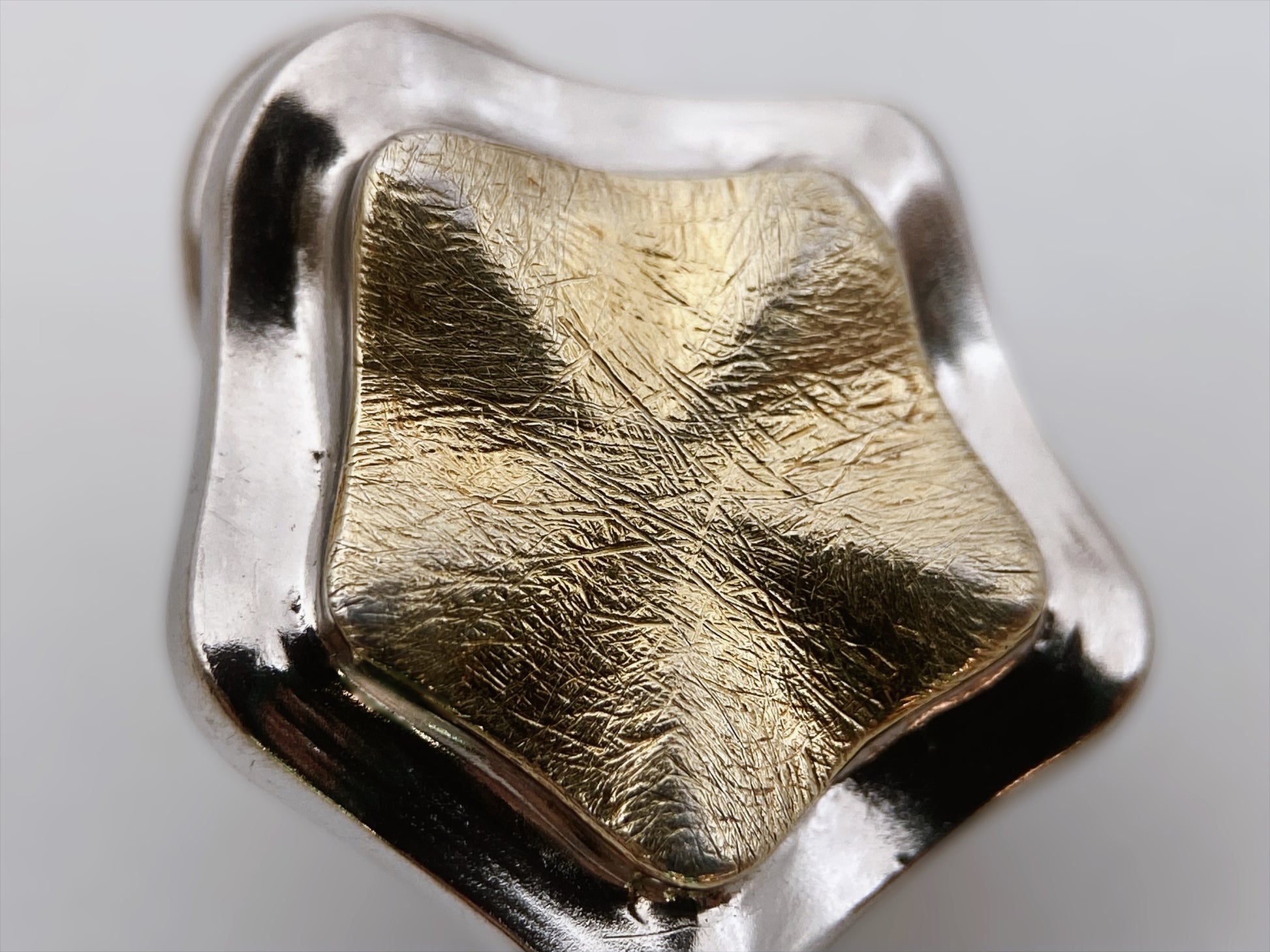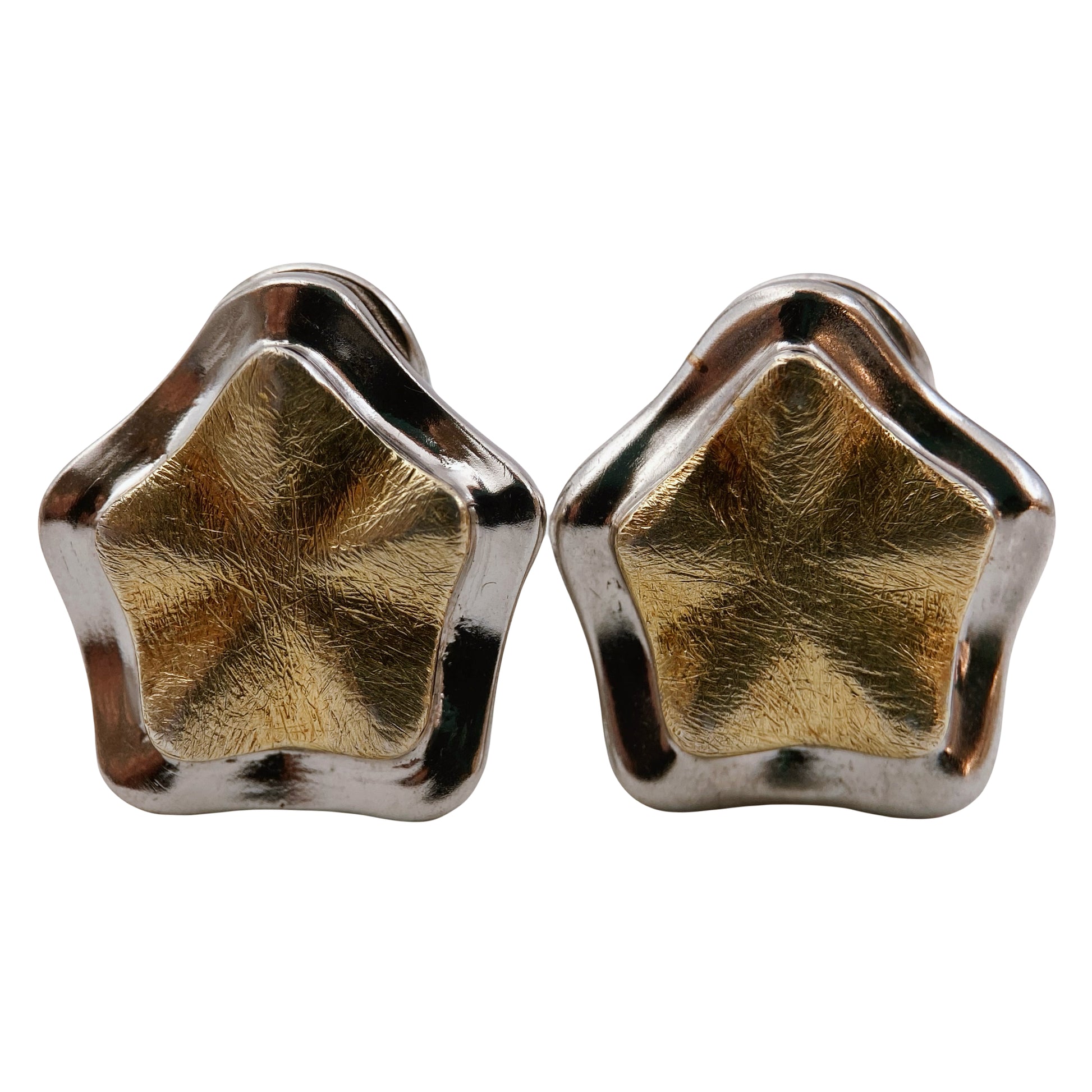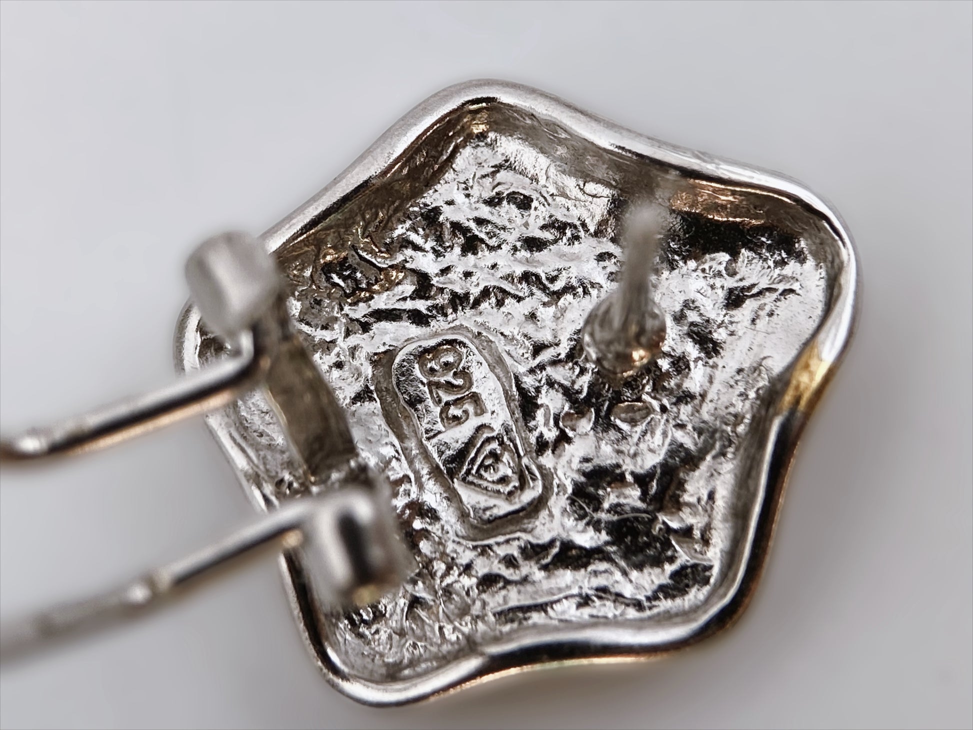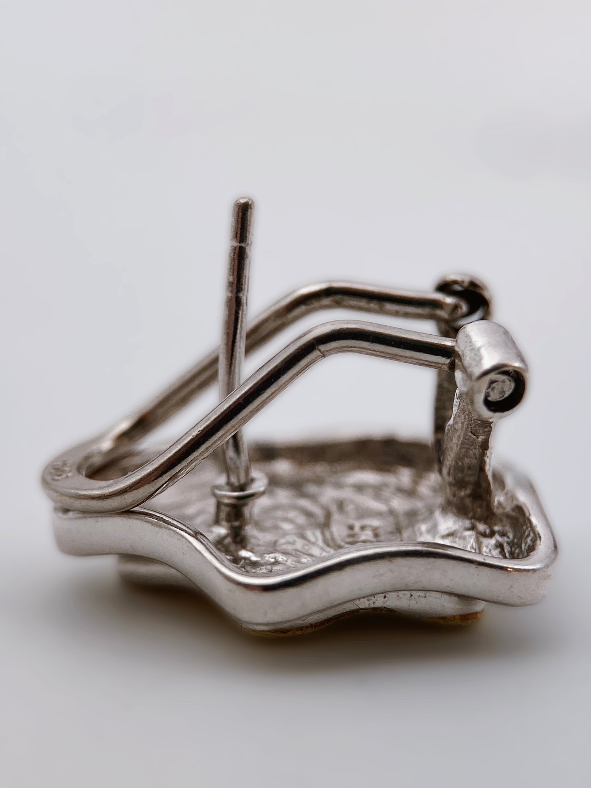 Vintažiniai rankų darbo auskarai, pagaminti iš 925 prabos sterlingo sidabro, dekoruoti subtiliu aukso spalvos pentagramos formos centru. Dviejų spalvų paviršius – šviesiai auksinis vidus ir sidabriniai kraštai – sukuria elegantišką kontrastą. Užsegimas – vinuko (post) tipo su tvirtu metaliniu fiksatoriumi. Ant nugarėlės įspaustas žymėjimas „925“ su širdelės formos simboliu, būdingu Amerikos studijinei juvelyrikai (mažoms dirbtuvėms). Panašų stilių kūrė Relios/Carolyn Pollack, Kim Craftsmen, Danecraft, tačiau šie auskarai pasižymi savitu, labiau skulptūriniu apdirbimu.