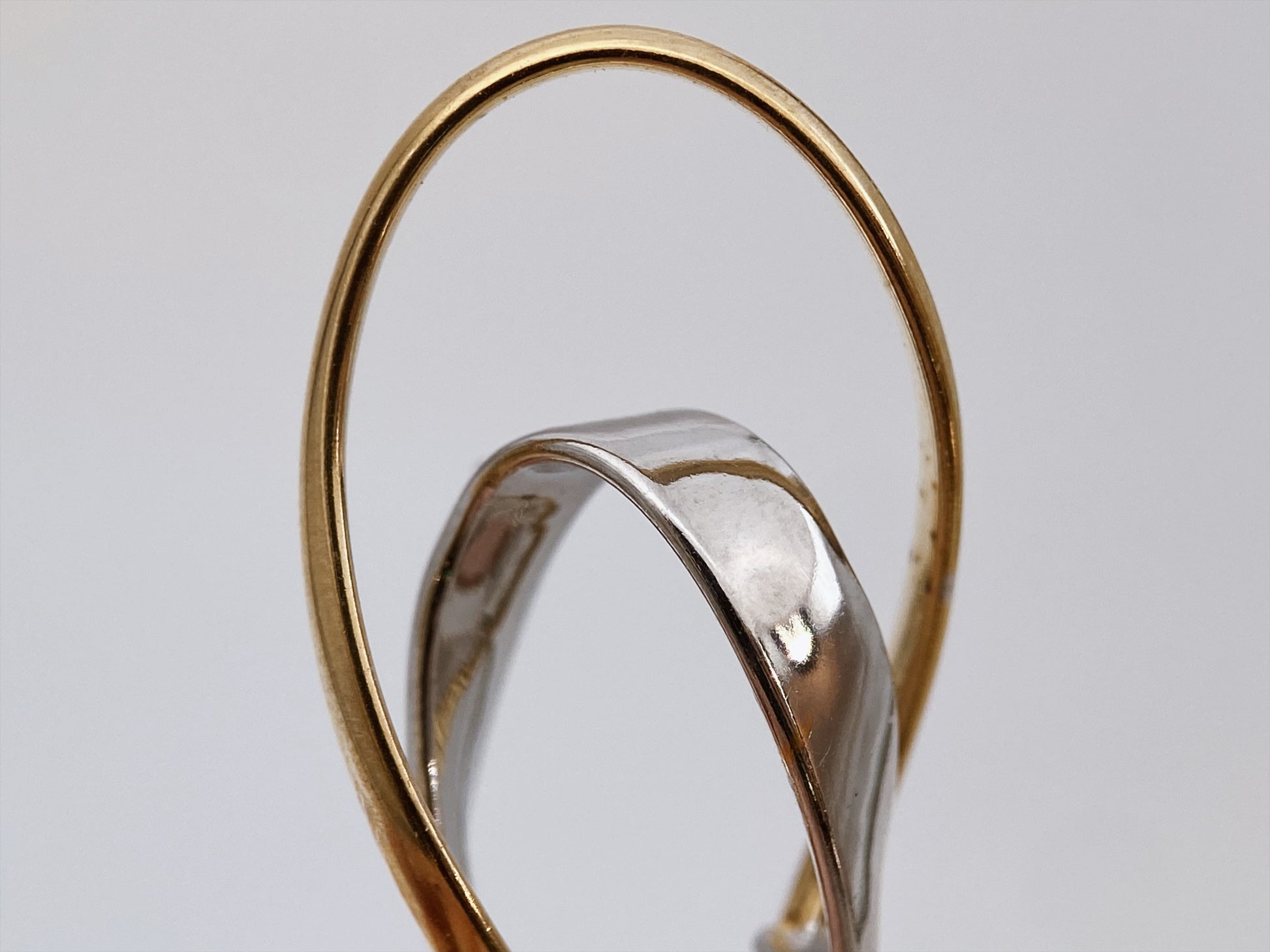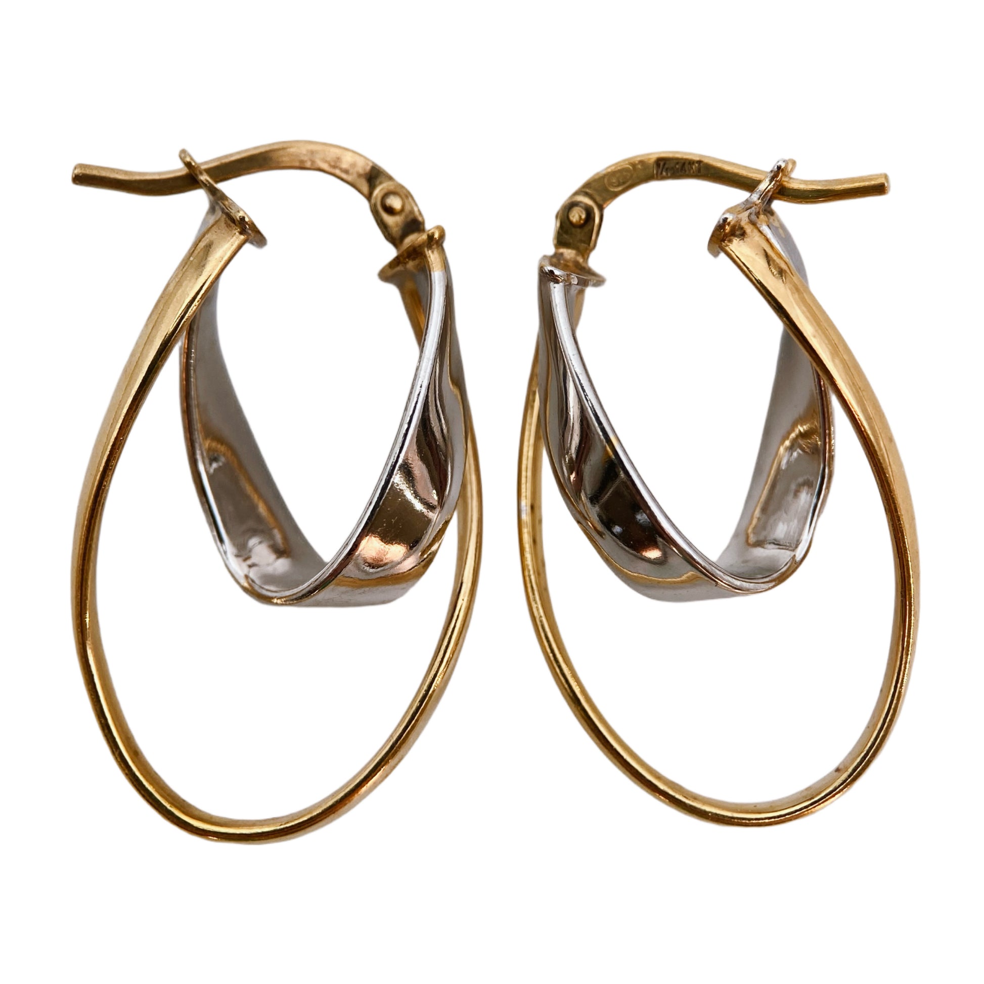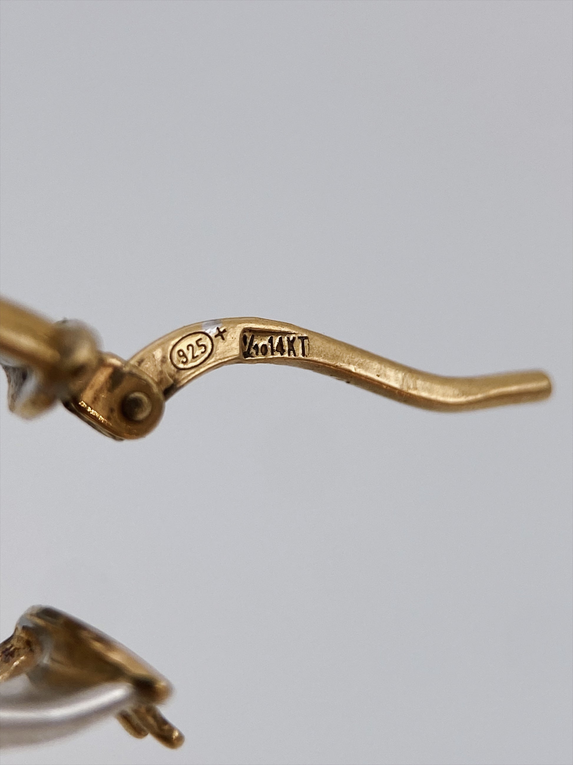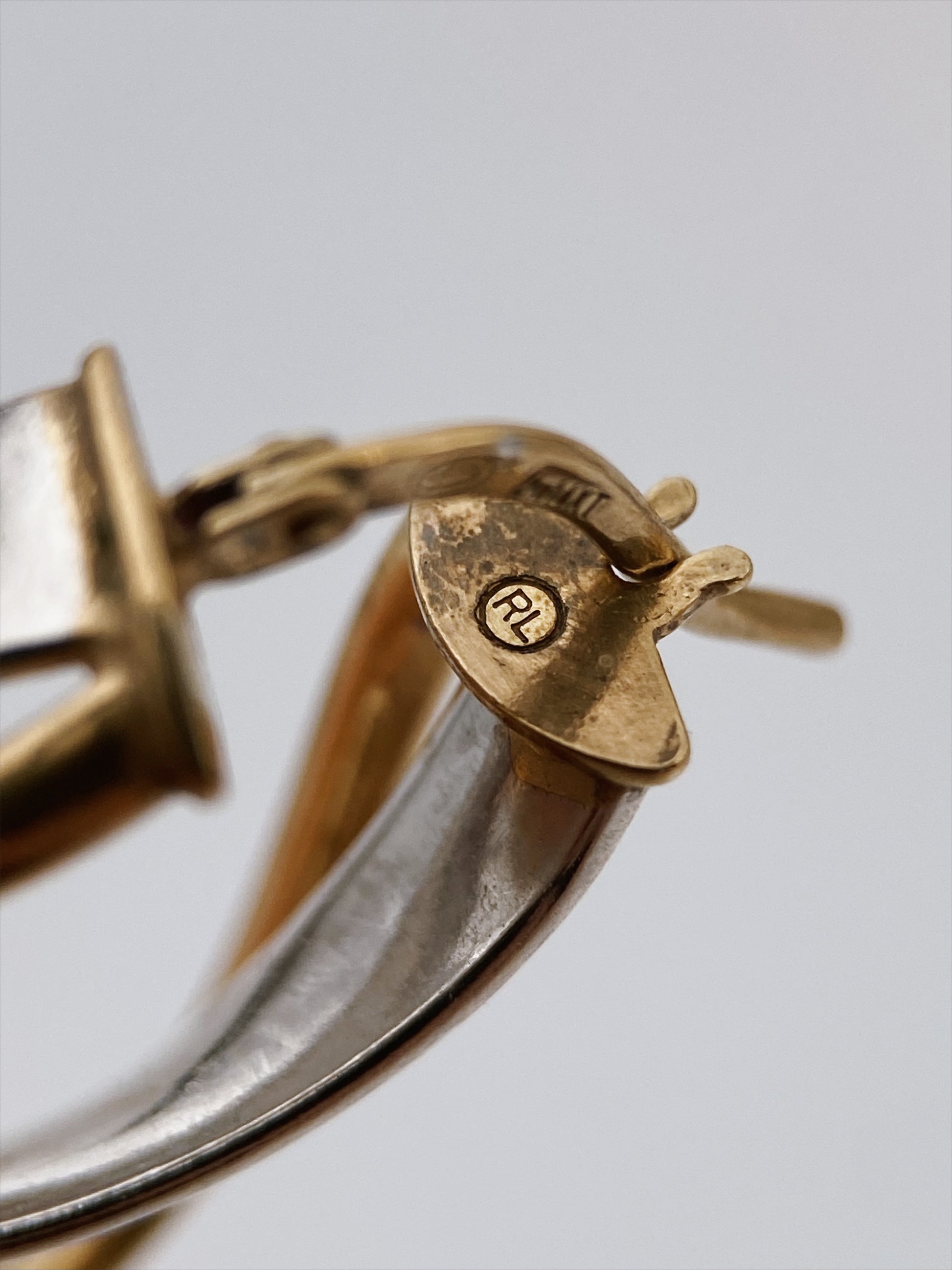 Elegantiški ovalo formos auskarai, su subtilia susukta linija. Vienas elementas sukurtas iš poliruoto 925 sidabro, kitas - dengtas 14 karatų auksu („1/4 14KT“ žymėjimas). Auskarai pažymėti „RL“ ženklinimu, kas, pagal žymėjimą ir stiliaus savybes, sietina su “Ralph Lauren” juvelyrikos linija.