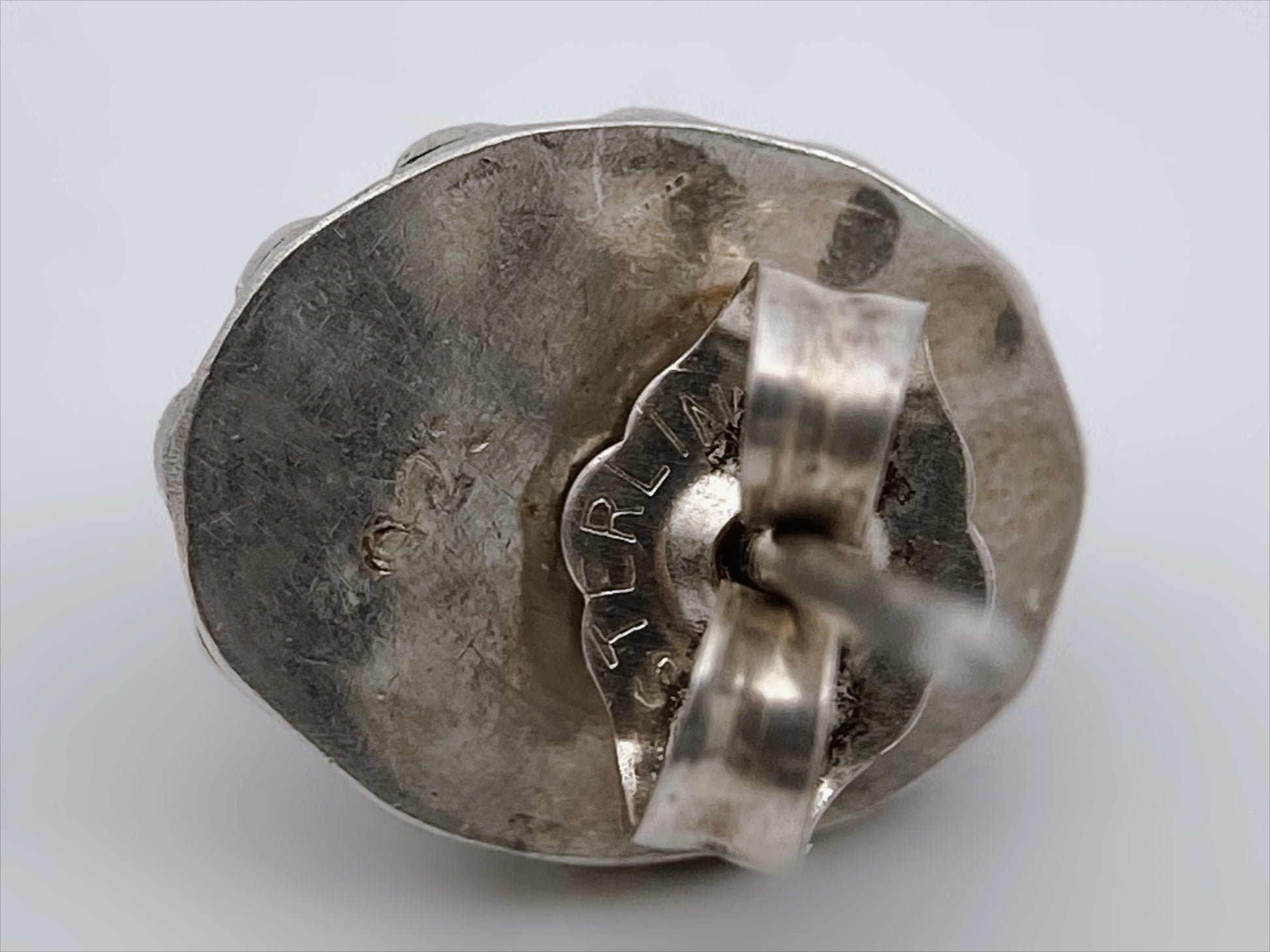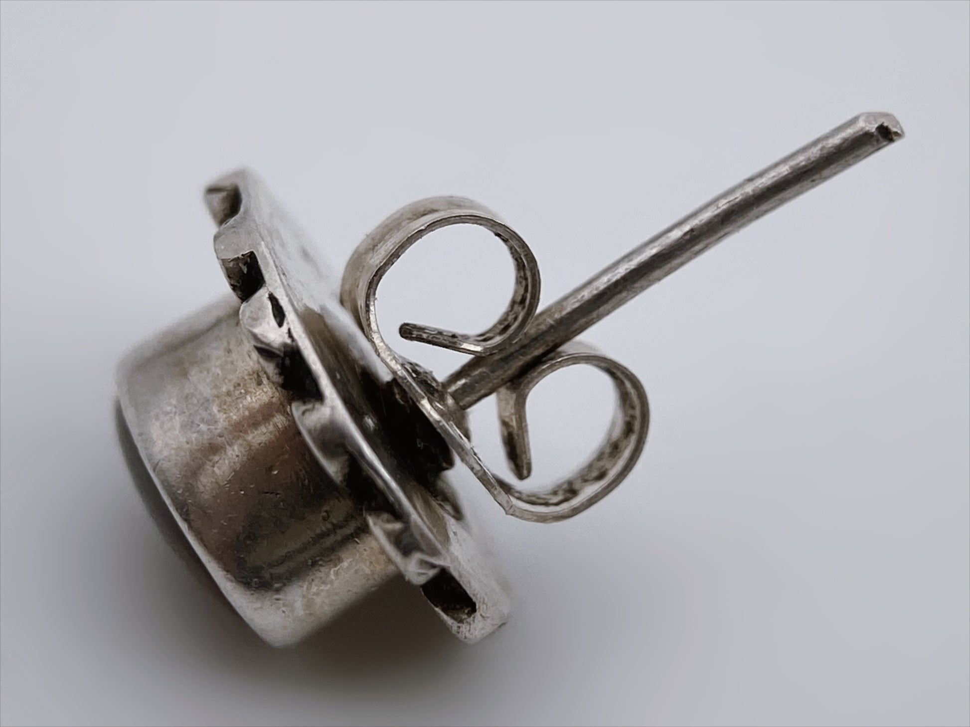 Sudėtis: sidabras, stiklo kabošonas Gamybos būdas: rankų darbas Būklė: labai gera Išmatavimai: 1 x 0,8 cm Svoris: 1,6 g Spalva: sidabro, ruda Žymėjimas: "925, Sterling” Šalis: JAV Laikotarpis: 1960-1980 metai Rinkos vertė: 55-75 EUR