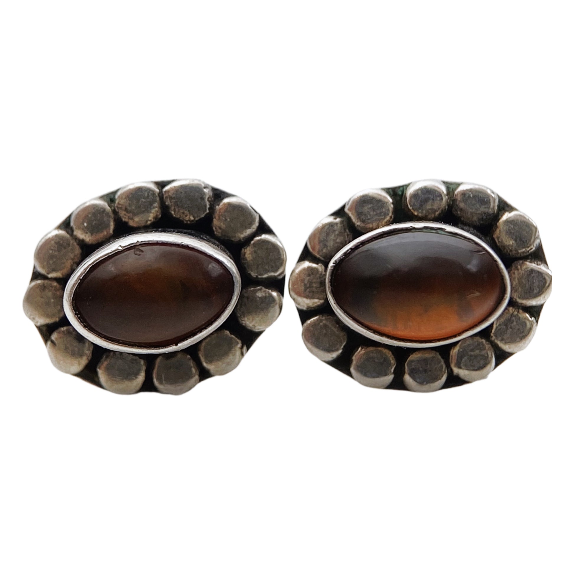Vintažiniai sidabro auskarai su rudo stiklo kabochonais. Klasikinis dizainas su ovalo formos rudo stiklo (arba gintaro tipo) akmenuku, įrėmintu iškiliais apskritais sidabro elementais, kurie sukuria švelnų retro reljefą. Šiltas rudai–medaus atspalvis suteikia subtilaus žavesio, o oksiduotas sidabras pabrėžia rankų darbo charakterį.