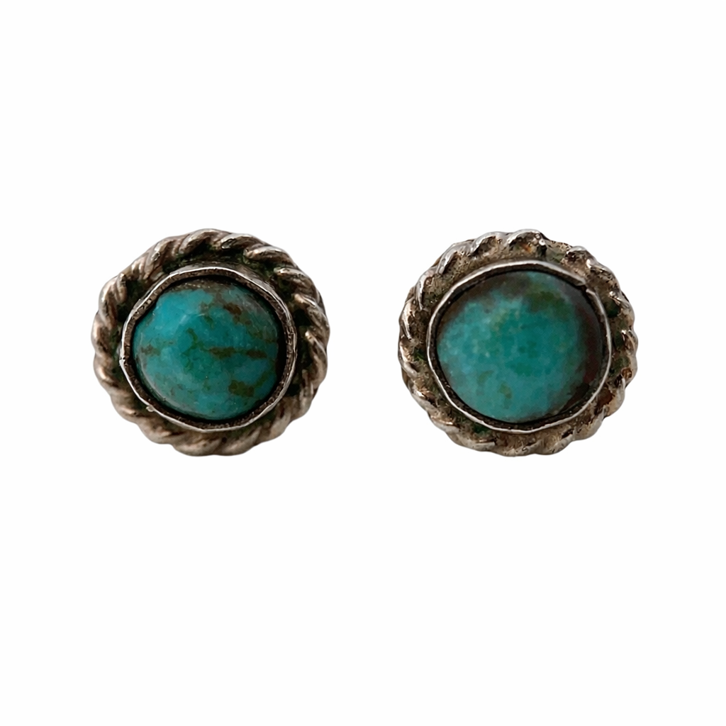 Rankų darbo vintažiniai auskarai su natūralaus turkio akmenimis. Apvalūs akmenys įstatyti į sidabrinį rėmelį, dekoruotą pintos virvės rašto apvadu. Kiekvienas turkis pasižymi unikaliu mėlynai-žalsvu atspalviu su natūraliais rudos ir pilkos spalvos intarpais, suteikiančiais akmeniui išskirtinį charakterį.