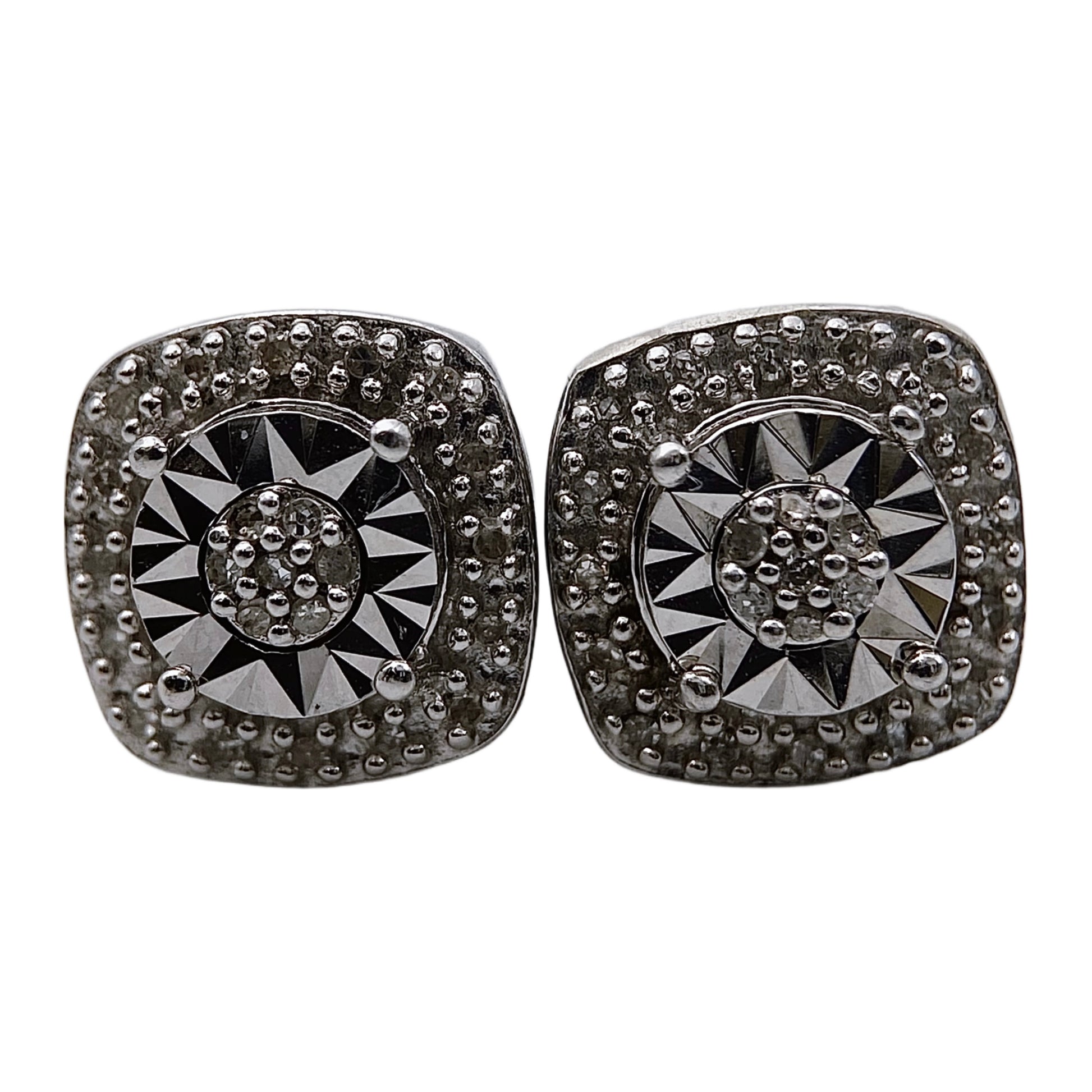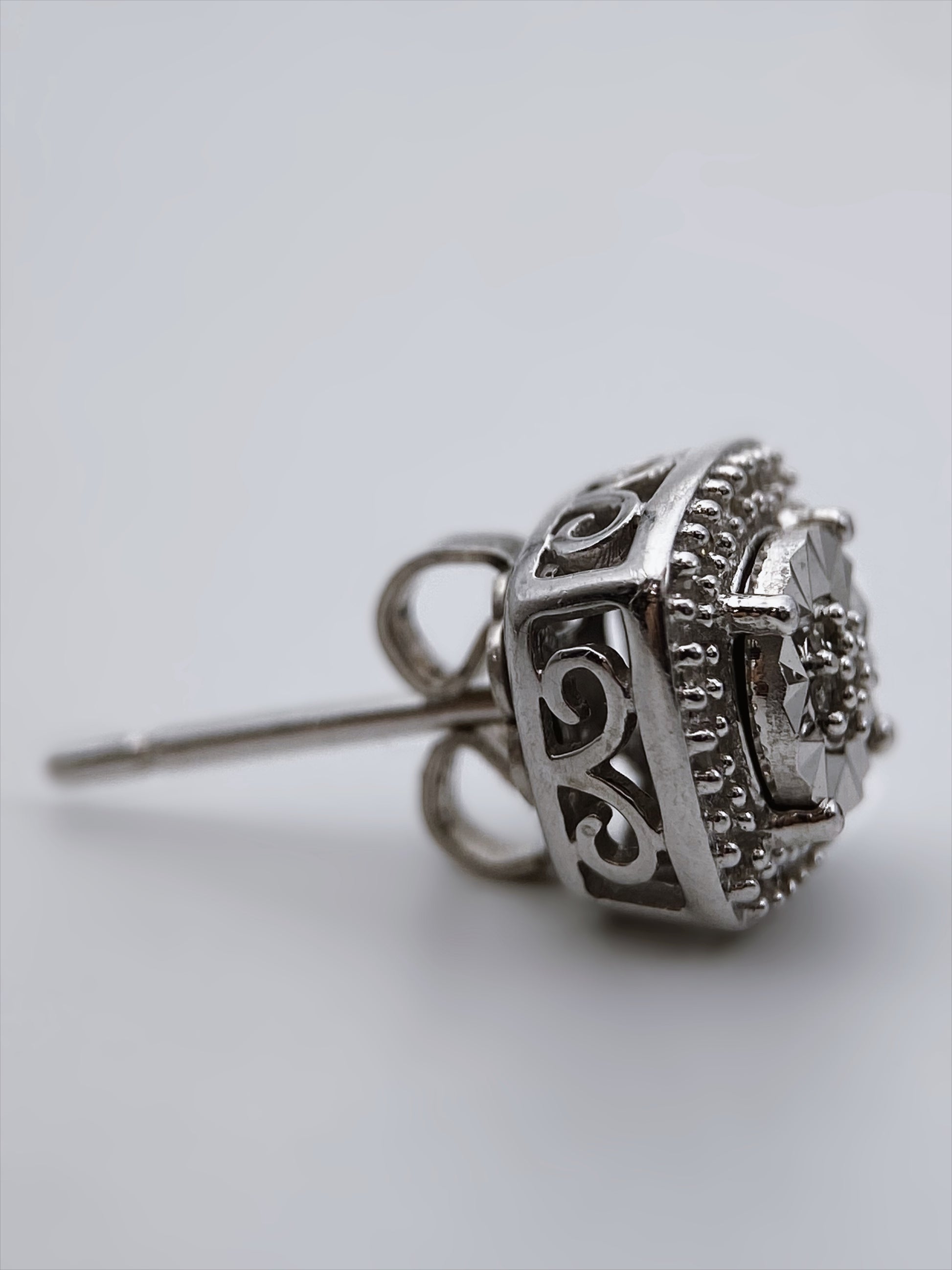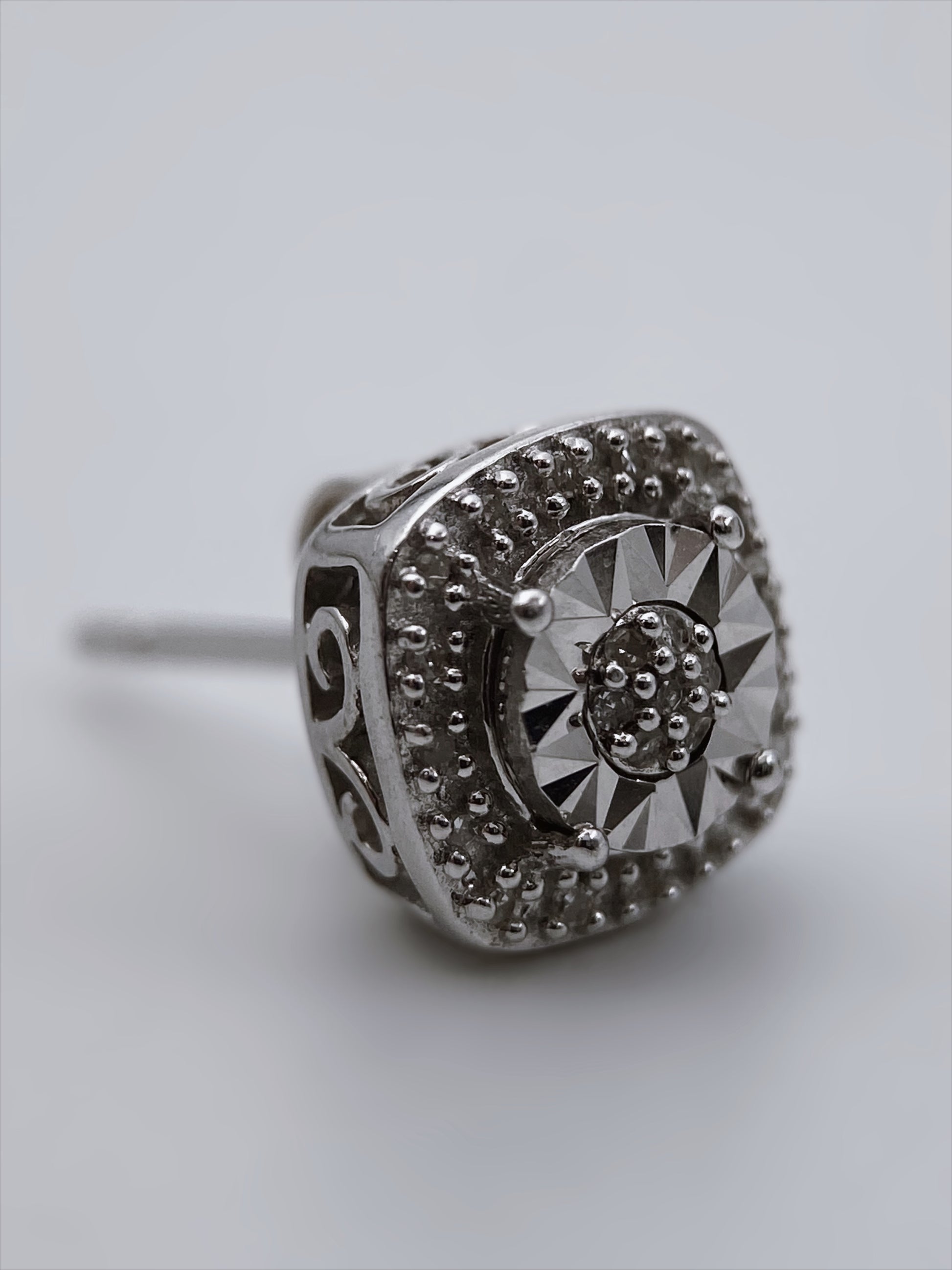 Sidabriniai auskarai su deimantukais, „miracle plate“ tipo dizainas. Kvadratinės formos auskarai dekoruoti centrine deimantų grupe ir spinduliškai graviruotu fonu, kuris sustiprina akmenukų žaismą. Šonai ažūriniai, klasikinio ornamentinio rašto. Tvirtinimas – vinukas (stud).