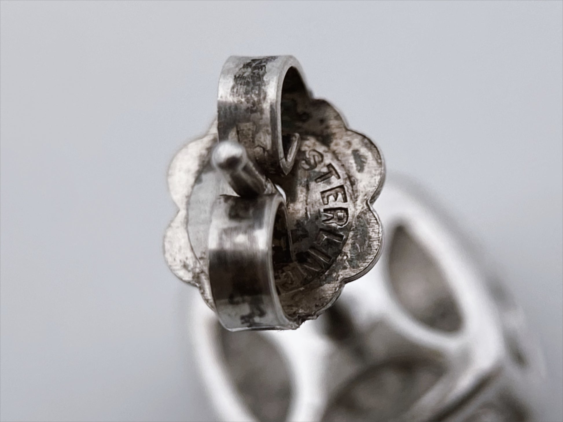 Sudėtis: sidabras, deimantai (micro pavé) Būklė: labai gera Išmatavimai: 0,9 x 0,9 cm Svoris: 2,1 g Spalva: sidabro Žymėjimas: "Sterling” Šalis: JAV Laikotarpis: 2000-2010 metai Rinkos vertė: 80-100 EUR
