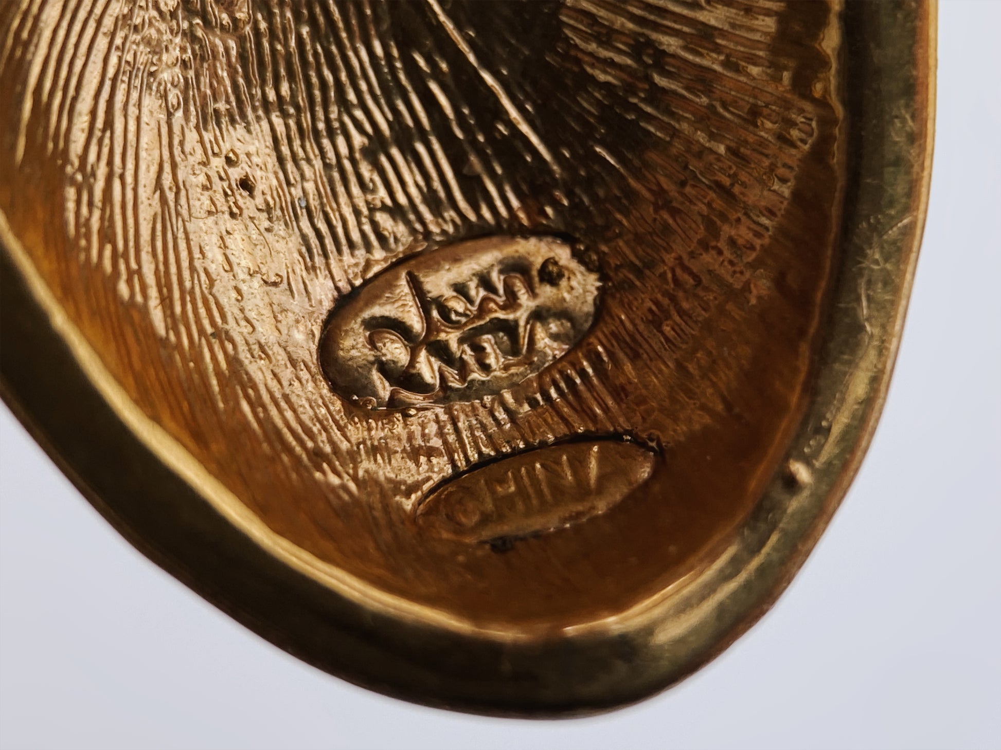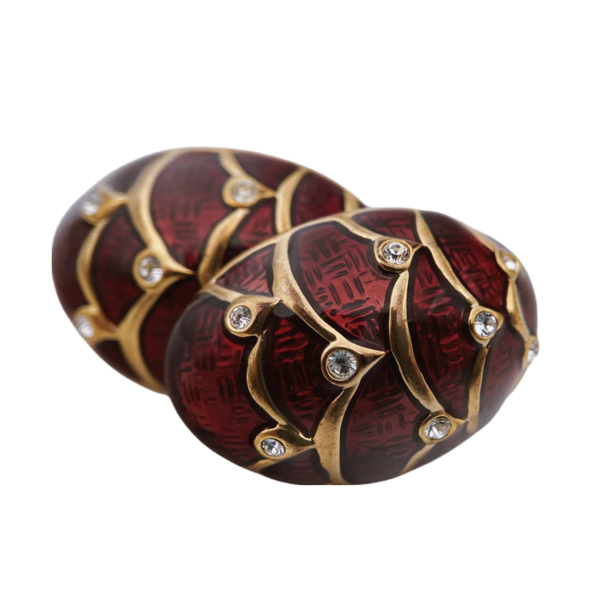 Tai Joan Rivers auskarai, vaizduojantys “Fabergé”stiliaus įkvėptą dizainą. Kiaušinio formos, raudonos spalvos emaliuotas paviršius su tekstūruotu ornamentu ir paauksuotais vingiuotais raštais. Įstatyti skaidrūs kristalai.