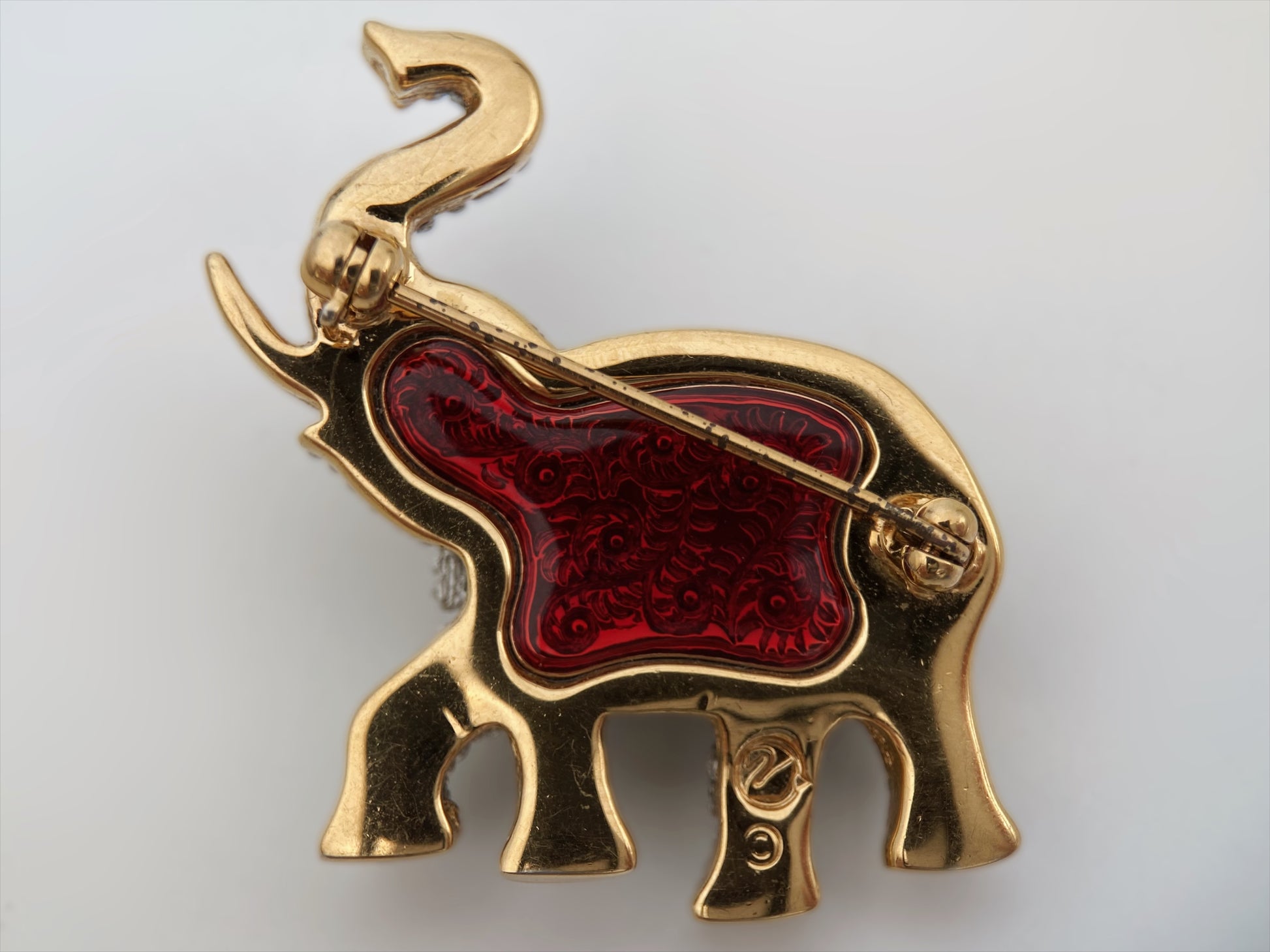 Dramblys pakeltu straubliu laikomas sėkmės simboliu. Sagė padengta skaidriais Swarovski kristalais (pavé technika). Taip pat dekoruota dideliu raudonu kristalu (įv. pjūvio formų), mažesniais raudonais ir žaliais kristalais. “Swarovski” niekada negamino didelio kiekio skirtingų sagių formų – ypač gyvūnų, todėl kiekvienas modelis turi ribotą tiražą. “Swarovski” gyvūnų temos sagės, ypač drambliai su pakeltu straubliu, turi didelę simbolinę ir estetinę vertę. Būtent toks dizainas ir spalviniai kontrastai (raudona + žalia akis + krištolai) daro ją vizualiai itin geidžiamą kolekcininkams.