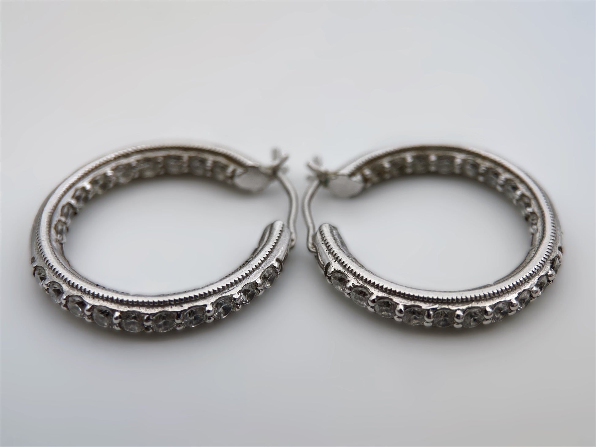 Sudėtis: sidabras, kubiniai cirkoniai (krištolo tipo akmenukai, imituojantys deimantus) Būklė: labai gera Išmatavimai (skersmuo): 2 cm Svoris: 5,9 g Spalva: sidabro Žymėjimas: “925∞, Tacori, CZ” Šalis: JAV Laikotarpis: 2010-2015 metai Rinkos vertė: 100-130 EUR