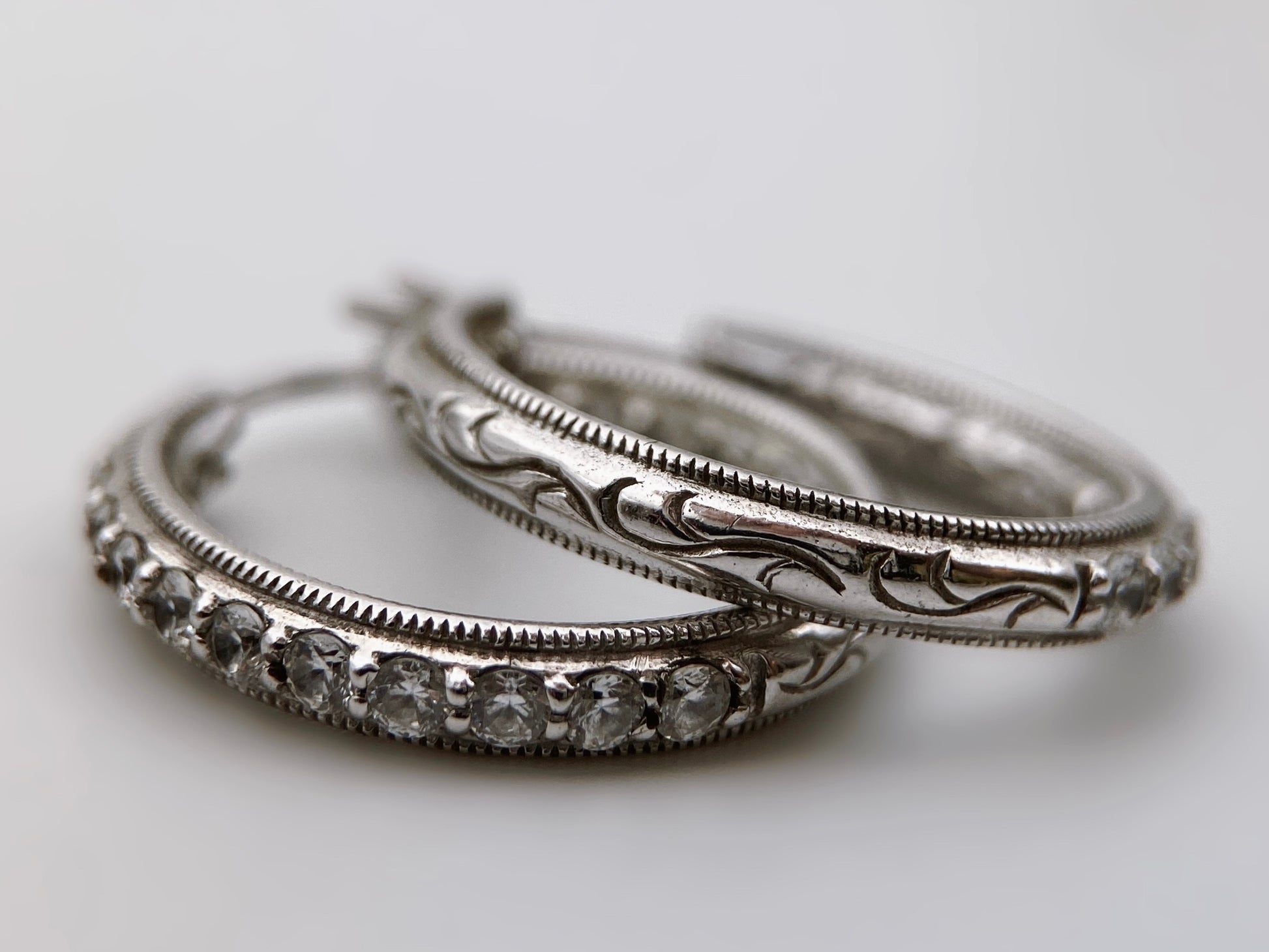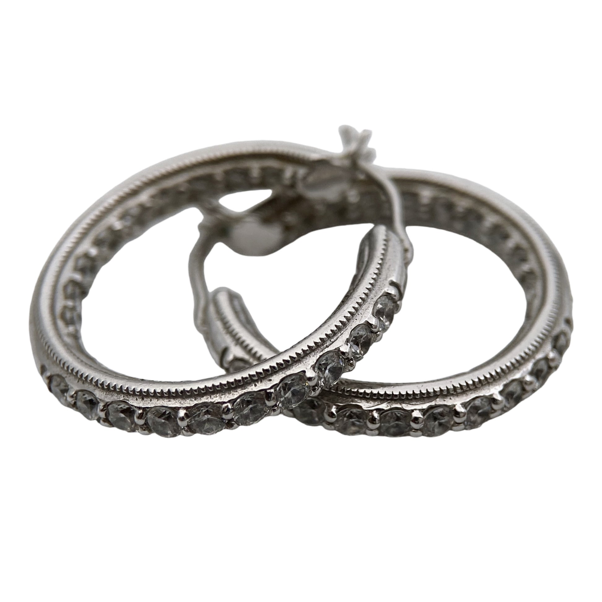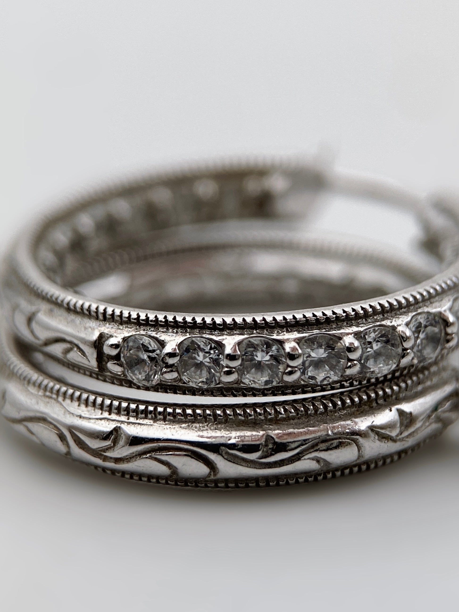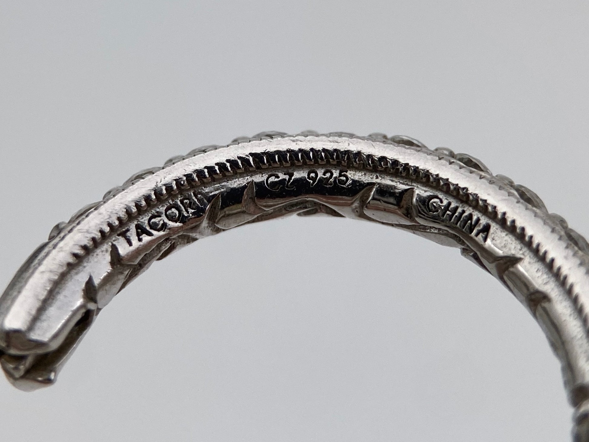 Stilingi “Tacori Sterling” kolekcijos auskarai, pagaminti iš sidabro (925), dekoruoti blizgiais kubiniais cirkoniais ir subtiliu raižytu ornamentu. Begalybės ženklas (∞) šalia 925 prabos žymi “Tacori Signature Finish™” – specialų apsauginį sluoksnį nuo oksidacijos. TACORI – JAV juvelyrikos namai, įkurti 1969 m. Los Andžele. Šiuo metu licencijuota “TACORI” gamyba vykdoma Kinijoje.