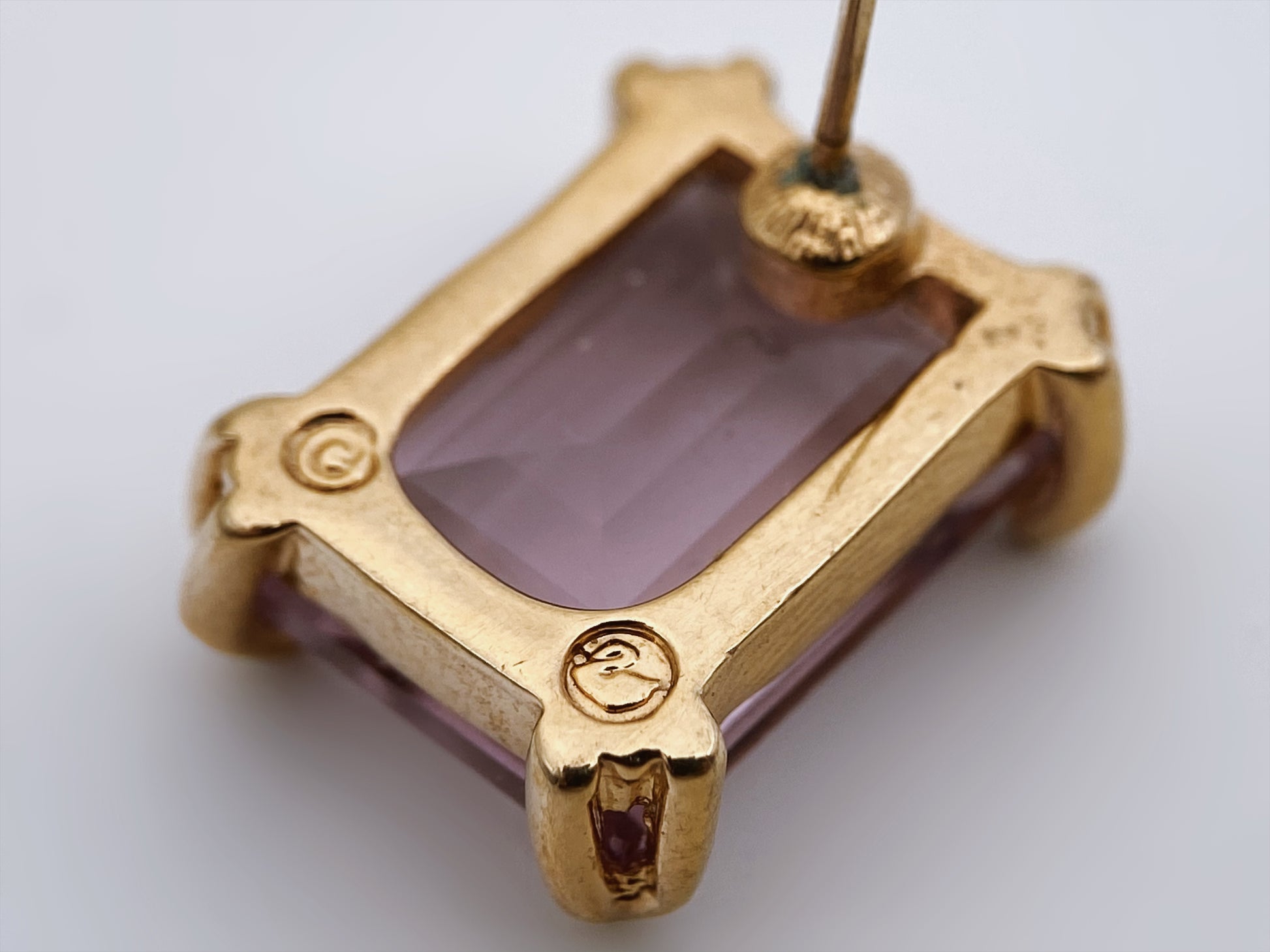 Tai kolekciniai Swarovski auskarai, pagaminti iš 14 karatų geltono aukso, su autentiškais „Light Amethyst“ atspalvio kristalais. Žymėjimas gulbės simboliu rodo, kad tai po 1989 m. gamyba, kai Swarovski pradėjo naudoti šį logotipą kaip oficialų prekinį ženklą. Šis modelis vertinamas dėl aukso derinio su originaliais Swarovski kristalais ir išlikusios puikios būklės. Dizainas: elegantiškas, geometrinis, subtiliai iškilus laikiklis.