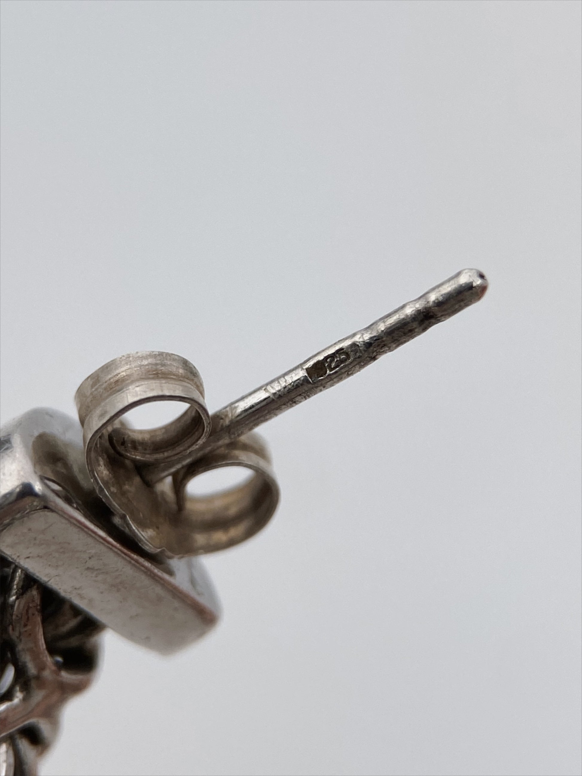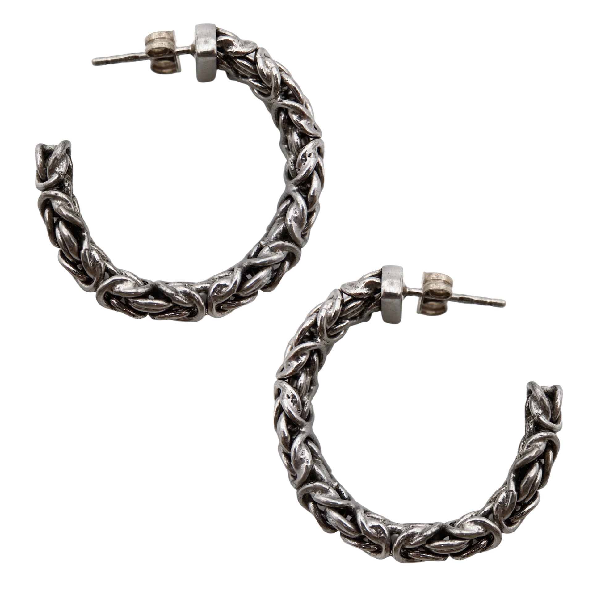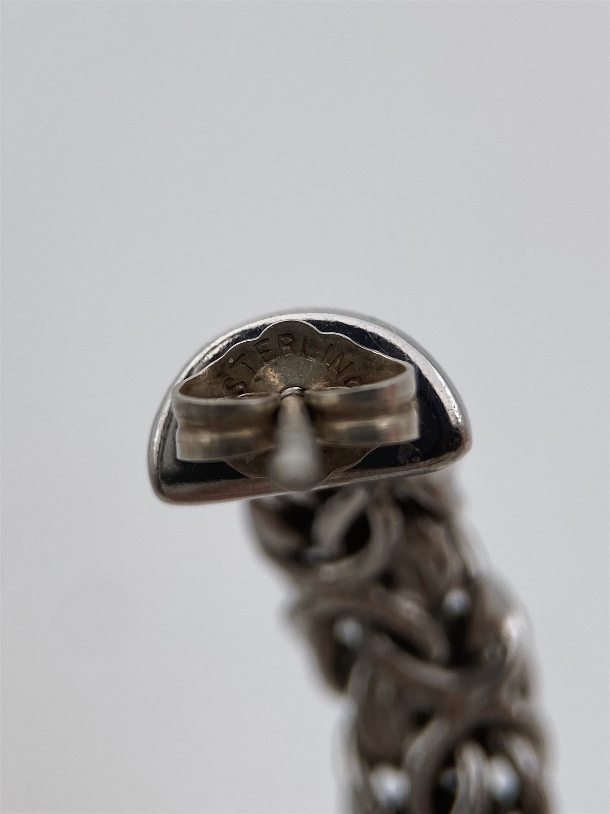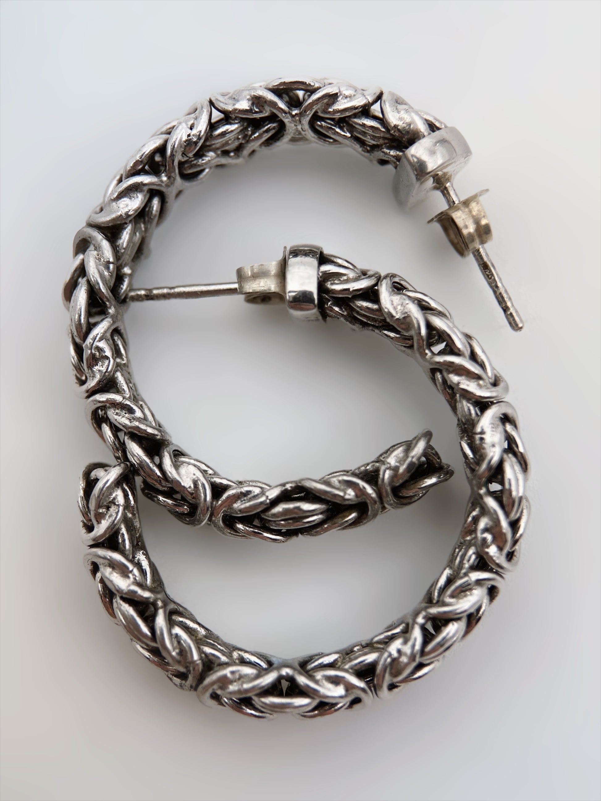 Sudėtis: sidabras Gamybos būdas: rankų darbas Būklė: labai gera Išmatavimai (skersmuo): 2,8 cm Svoris: 7,1 g Spalva: sidabro Žymėjimas: “925” Šalis: JAV Laikotarpis: 1990-2000 metai Rinkos vertė: 50-70 EUR 925 prabos sidabro auskarai su pintos grandinės ornamentu. Išraiškingo „Byzantine“ pynimo dizainas suteikia auskarams solidumo ir klasikinio stiliaus pojūtį. Paviršius subtiliai oksiduotas, kad išryškintų gylį ir rankų darbo faktūrą.