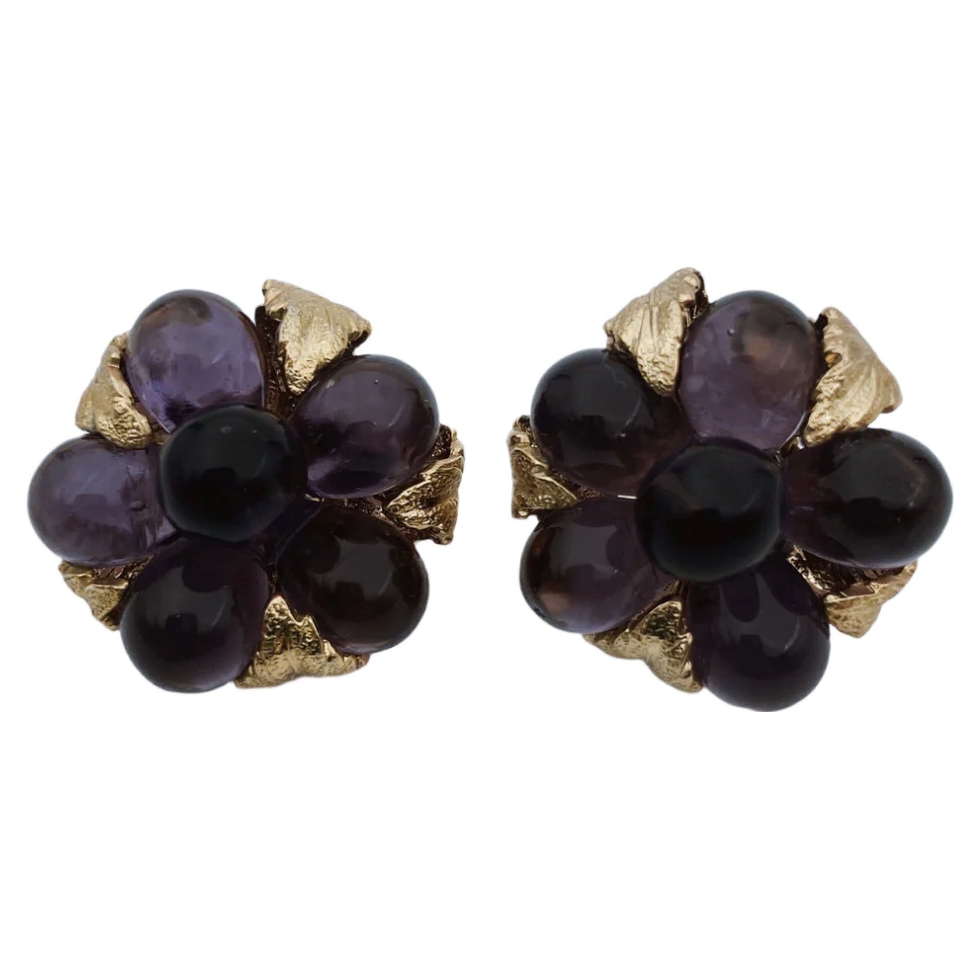Tai gražūs, kokybiškai pagaminti Napier klipsai, pažymėti “NAPIER PAT. PEND.” (patentas pateiktas). Šie auskarai atspindi „retro floral“ arba „mid-century revival“ estetiką – stambūs, dekoratyvūs, su augaliniais motyvais (lapeliai), imituojančiais natūralią formą. Tamsiai violetiniai stiklo/akrilo kabošonai primena ametistą, o jų forma bei centrinis iškilesnis akmuo sukuria gėlei artimą simetriją.