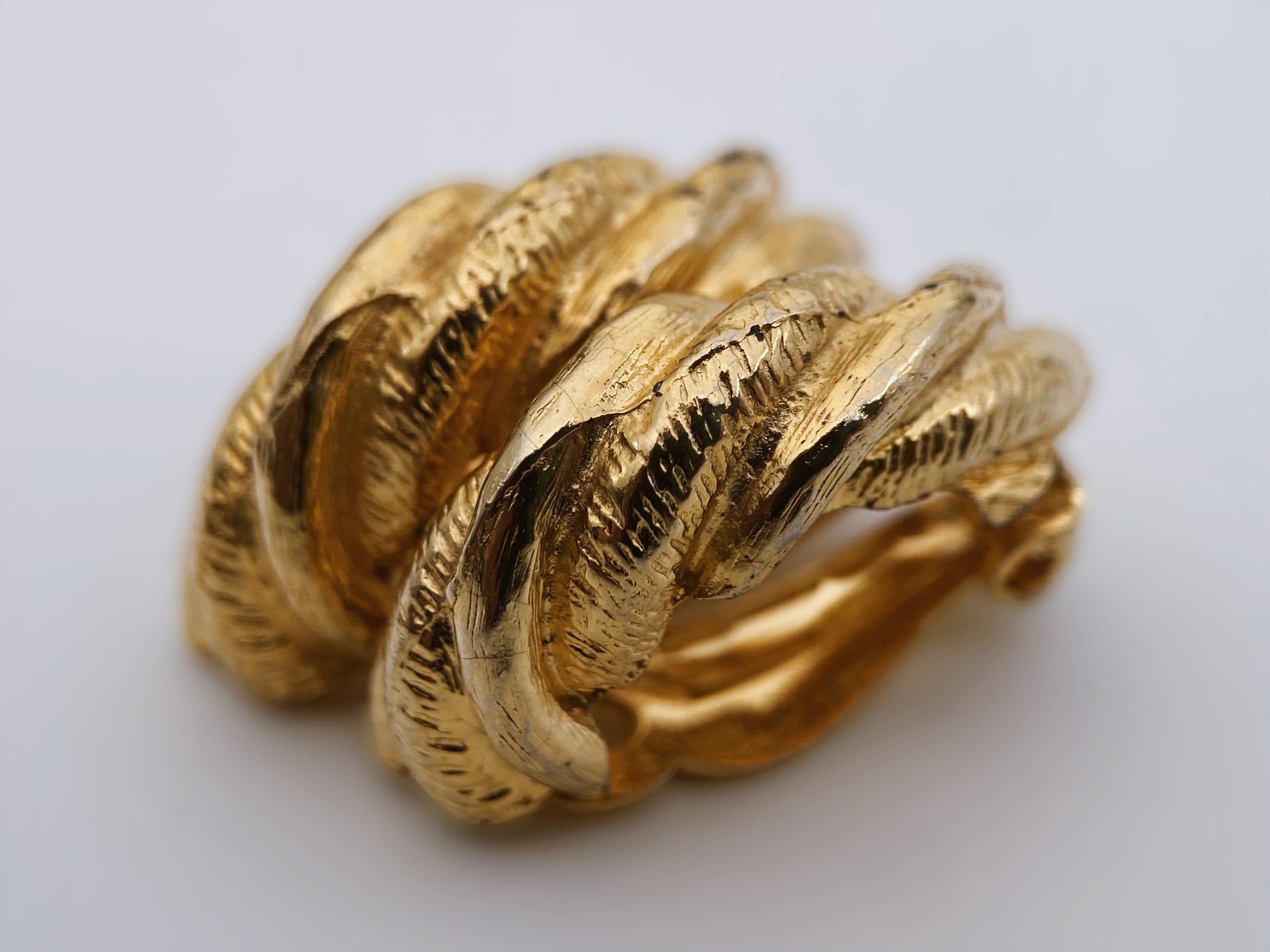 Šie auskarai taip pat yra pažymėti LES BERNARD žyma ir priklauso klasikiniam jų kolekcijų stiliui. Dizainas: paauksuoti klipsai su dinamiška, susukta banguota forma, tekstūrinis paviršius. Užsegimas: klasikinis spyruoklinis klipsas su „LES BERNARD“ ženklinimu. Remiantis dizainu, medžiagomis ir užsegimo tipu, šie auskarai greičiausiai pagaminti apie 1975–1985 metus. Tuo metu buvo populiarūs „statement“ auskarai – dideli, ryškūs, organinių formų. Les Bernard aktyviai kūrė būtent tokio tipo aksesuarus, atspindinčius Holivudo, “disco” ir “power-dressing” estetiką. Nors šie auskarai neturi akmenų, jie atstovauja Les Bernard skulptūrinį stilių, kuris patrauklus minimalistams ir dizaino kolekcionieriams. Tokie kūriniai dažnai ieškomi dėl: aiškaus laikmečio identiteto, gamybos kokybės ir mados ciklų, kuriuose vėl populiarėja 70–80-ųjų formos.