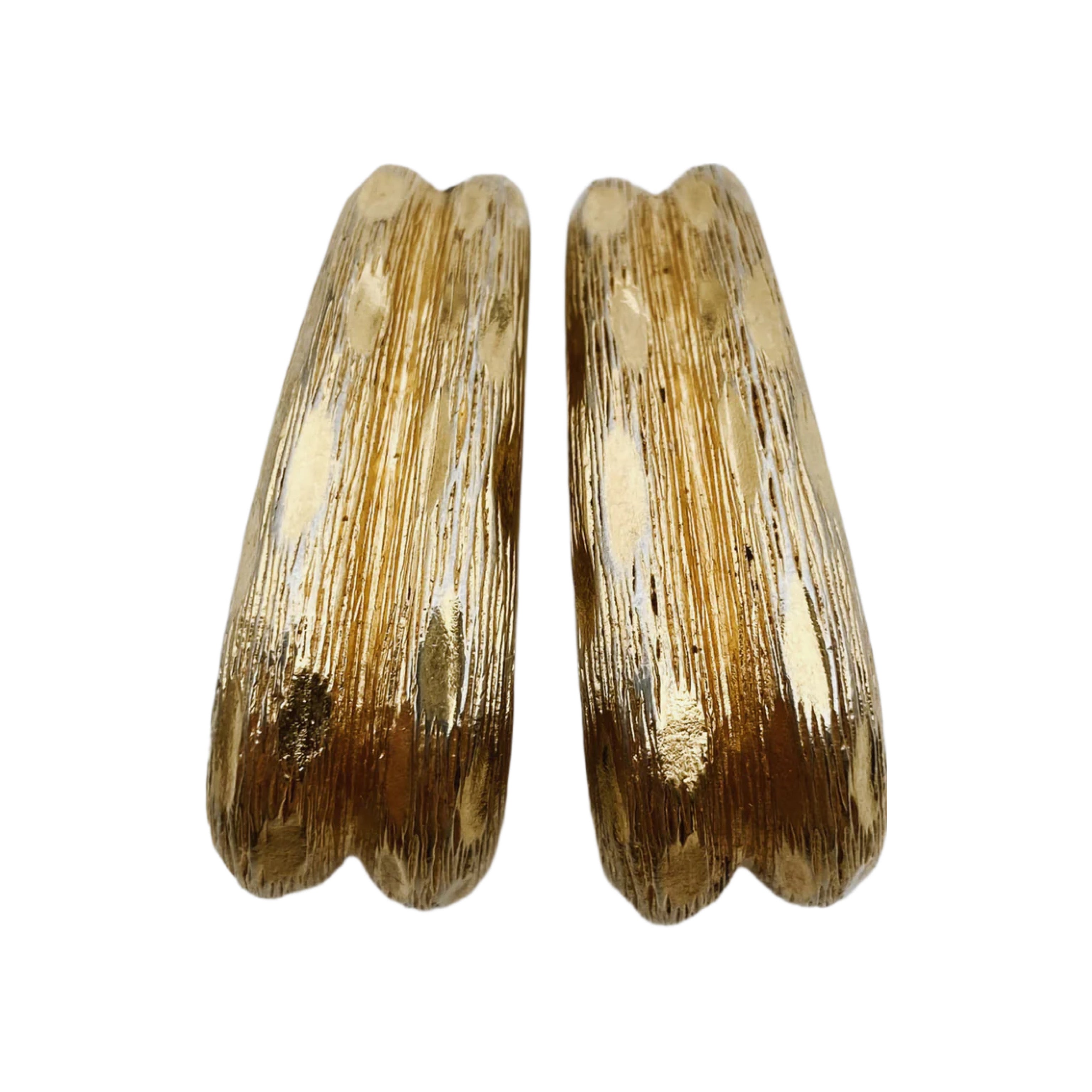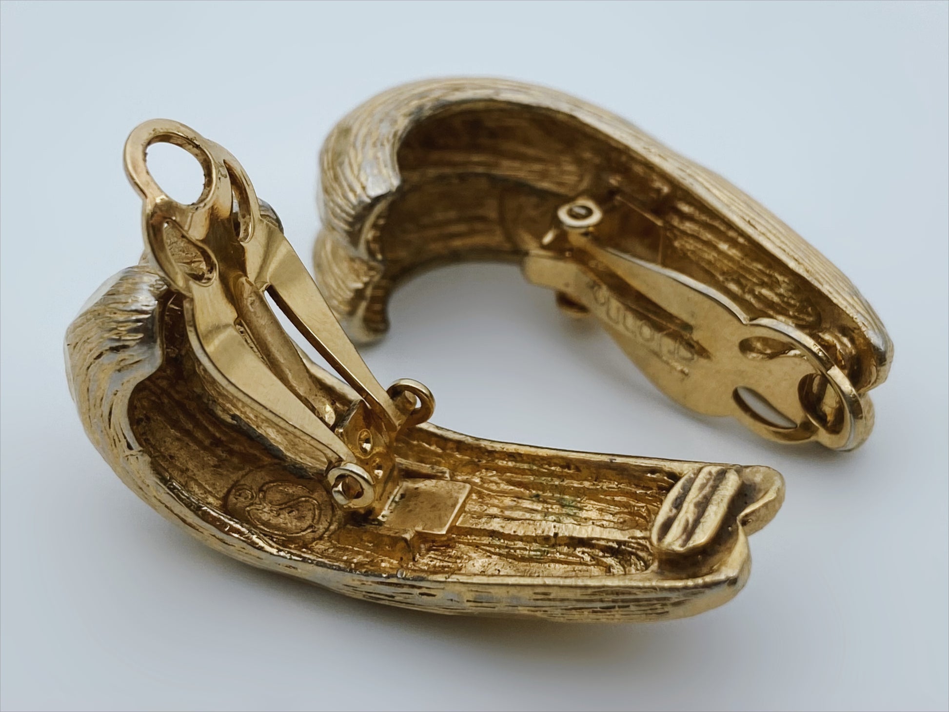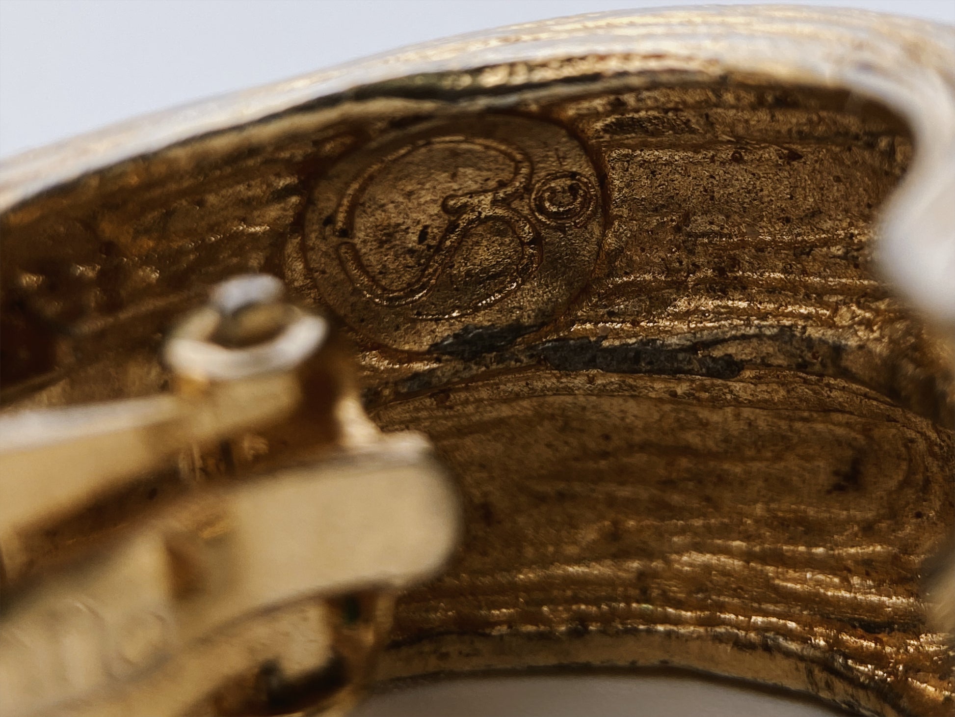Šių auskarų matinio aukso spalvos paviršius su tekstūra, primena medžio ar audinio faktūrą. Minimalistinis, bet prabangus stilius. Šio tipo minimalistiniai auskarai yra rečiau pasitaikantys nei emaliuoti arba su logotipais, bet paklausūs tarp tų, kurie renkasi švaresnį, elegantišką dizainą. Tipiškas Collins Seitz (CS) logotipas, naudojamas „St. John“ papuošalų gamyboje apie 1990–1997 m.