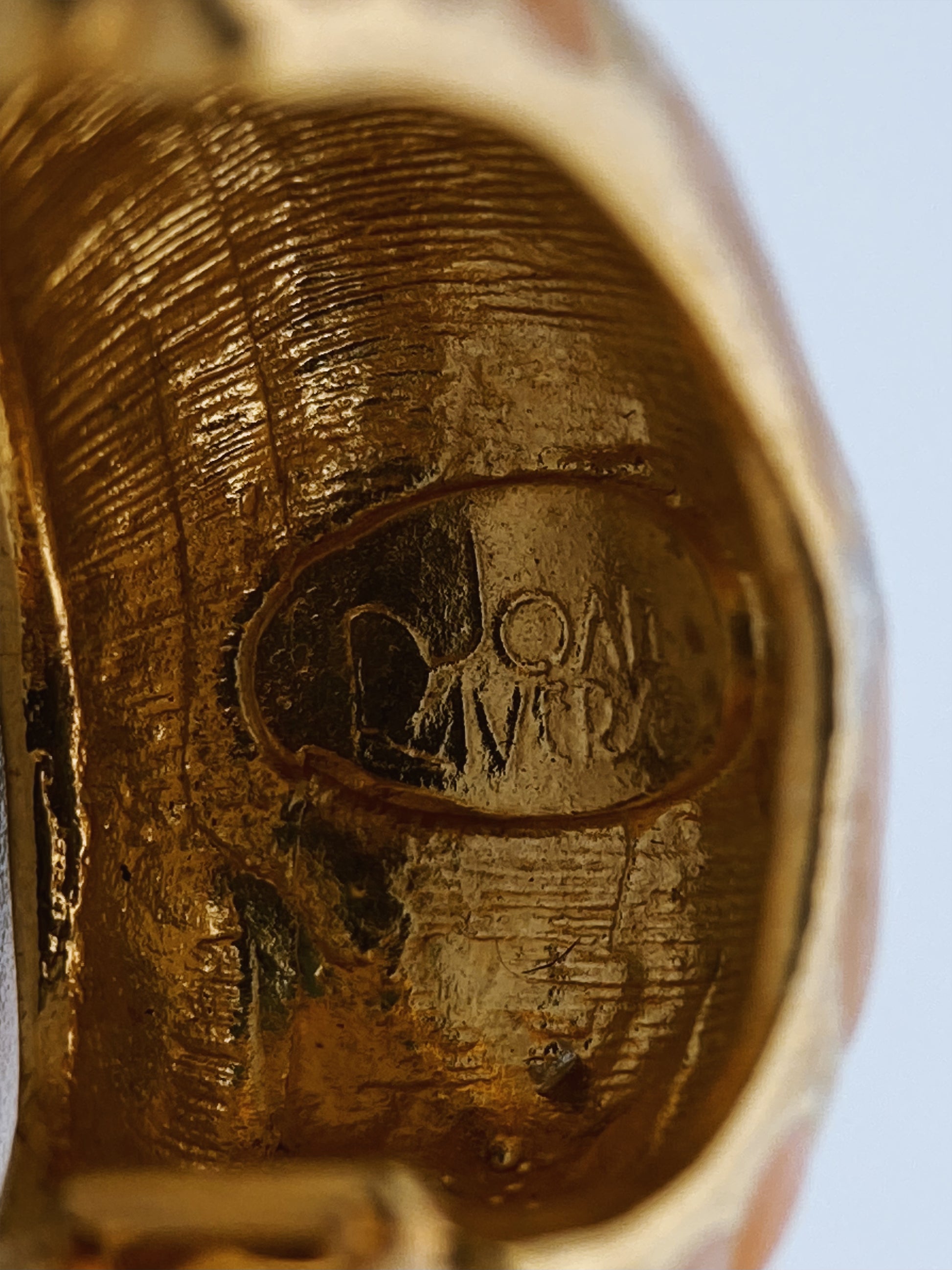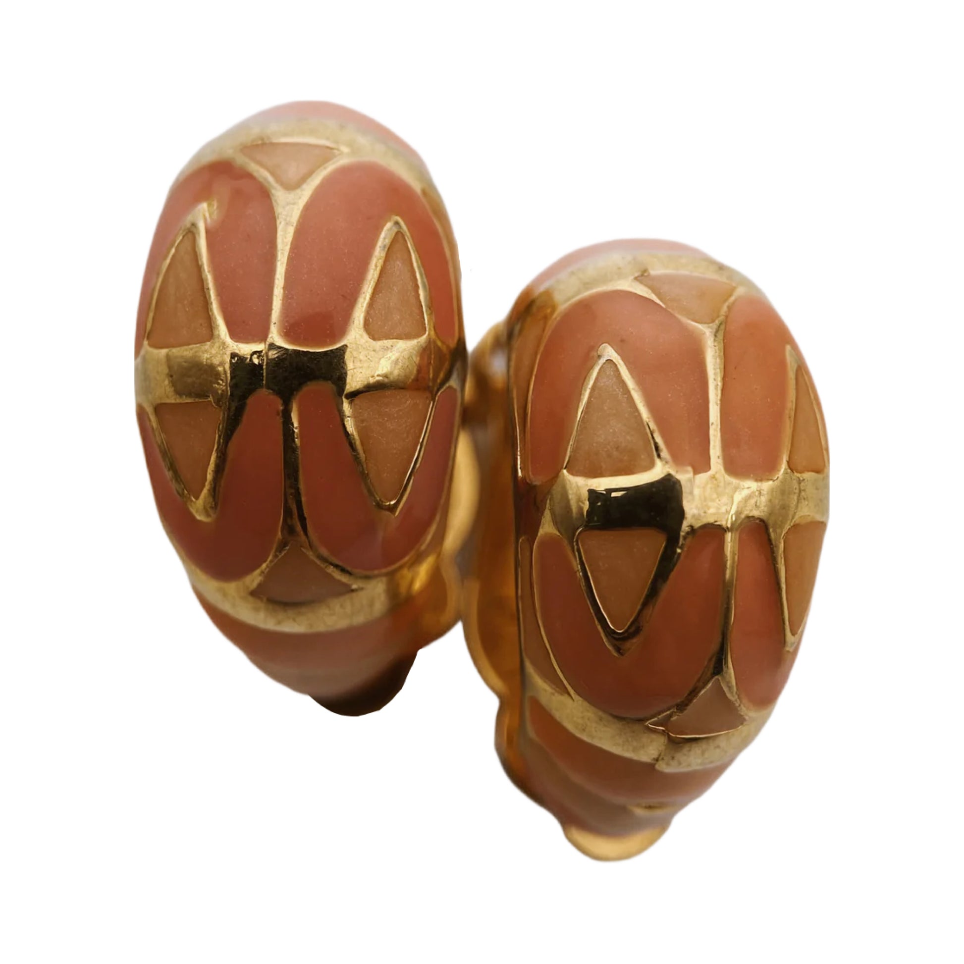 Šie auskarai yra “Joan Rivers” kolekcijos dalis, klipsų tipo, dekoruoti šviesiai koralinės spalvos emale ir aukso spalvos geometriniu ornamentu. Ženklinimas vidinėje pusėje – JOAN RIVERS ovaliame rėmelyje – būdingas vėlesniems gaminiams, dažniausiai datuojamiems apie 1990–2000 m.