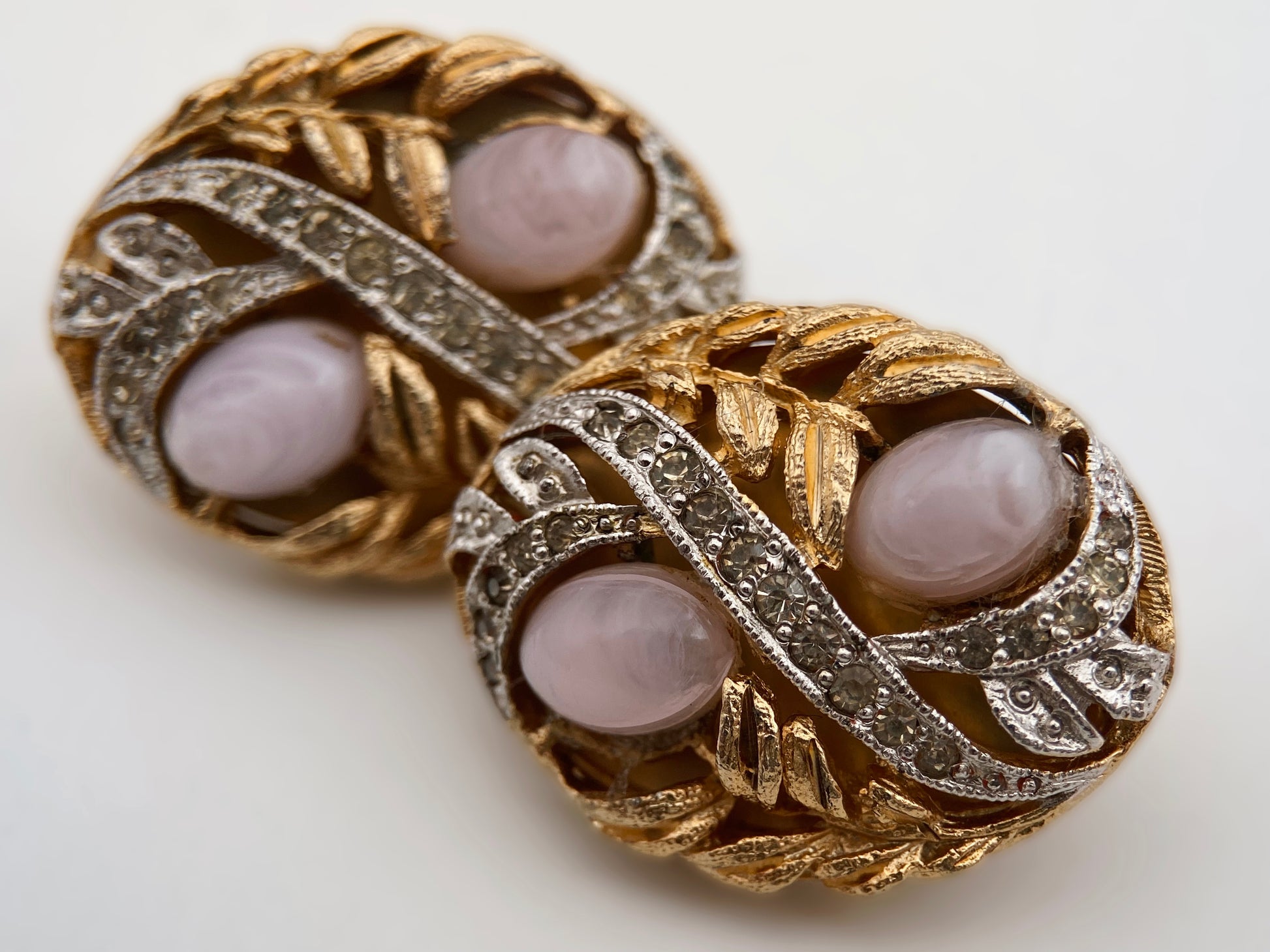 Sudėtis: metalas, liucitas, kristalai Būklė: labai gera Išmatavimai: 2,5 x 1,8 cm Spalva: aukso, sidabro, rožinė Žymėjimas: “VENDÔME, Pat. 2.809.501) Šalis: JAV Laikotarpis: 1957-1965 metai Rinkos vertė: 70-90 EUR