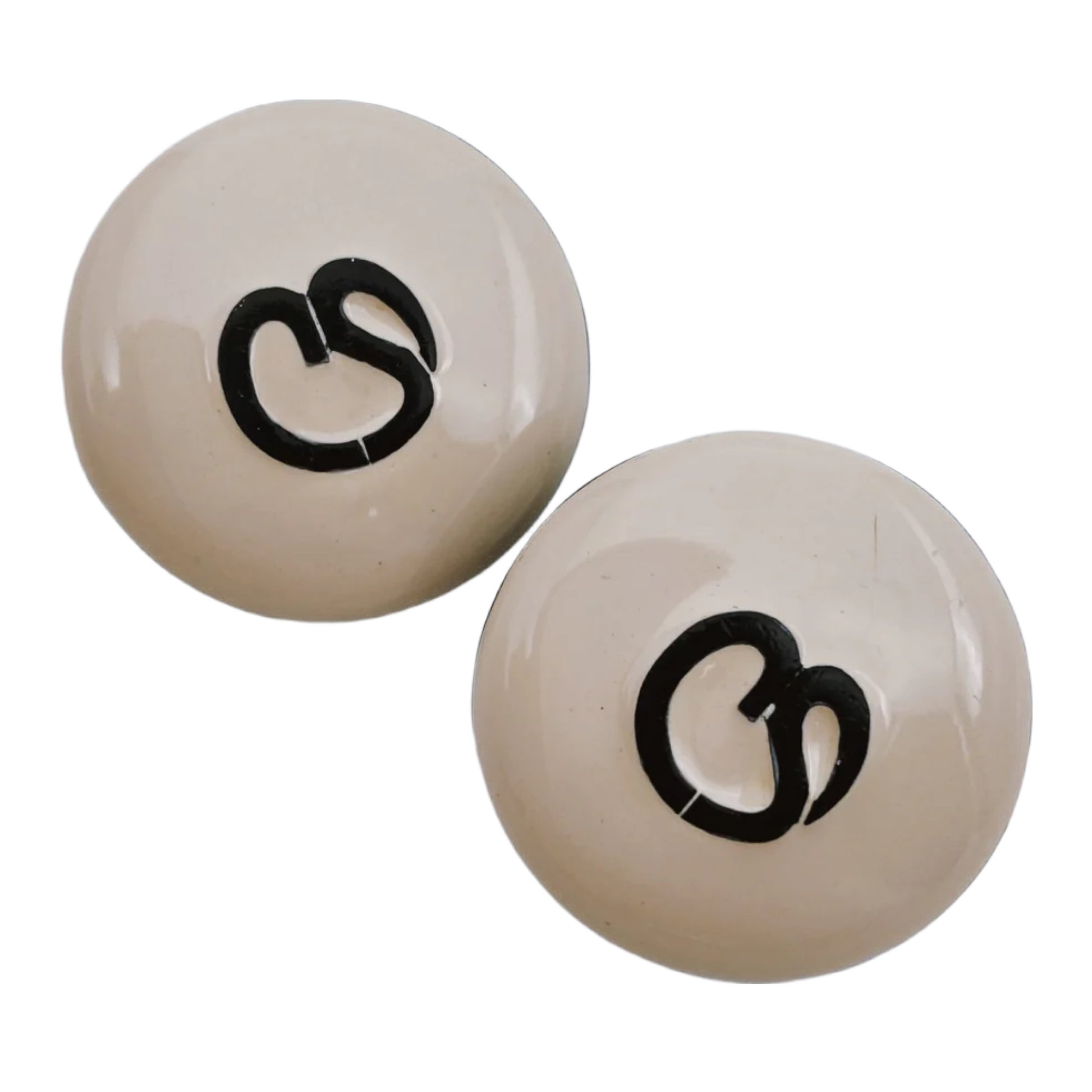 Apvalūs, kupolo formos („domed“) auskarai klipsai. Šie auskarai atspindi minimalistinį, bet prabangų Amerikos „power dressing“ estetikos laikotarpį. Tai retas modelis, nes nugarėlė visiškai emaliuota juodu laku, kuris yra gana neįprastas St. John auskarams. CS logotipas (Collins Seitz St. John papuošalų gamintojas) emalėje (priekinėje dalyje, juodos spalvos), pakartotas CS ženklas vidinėje pusėje, įspaustas ant juodo pagrindo, rodo, kad tai buvo akcentinis dizainas, ne tik gamybinė partija. Tokie auskarai dažniausiai buvo naudojami kaip St. John “special edition” ar riboto leidimo kolekcijų detalė. Dekoratyvinis logotipas priekyje yra neįprastas CS ženklinime – tai padidina jų kolekcinę vertę.