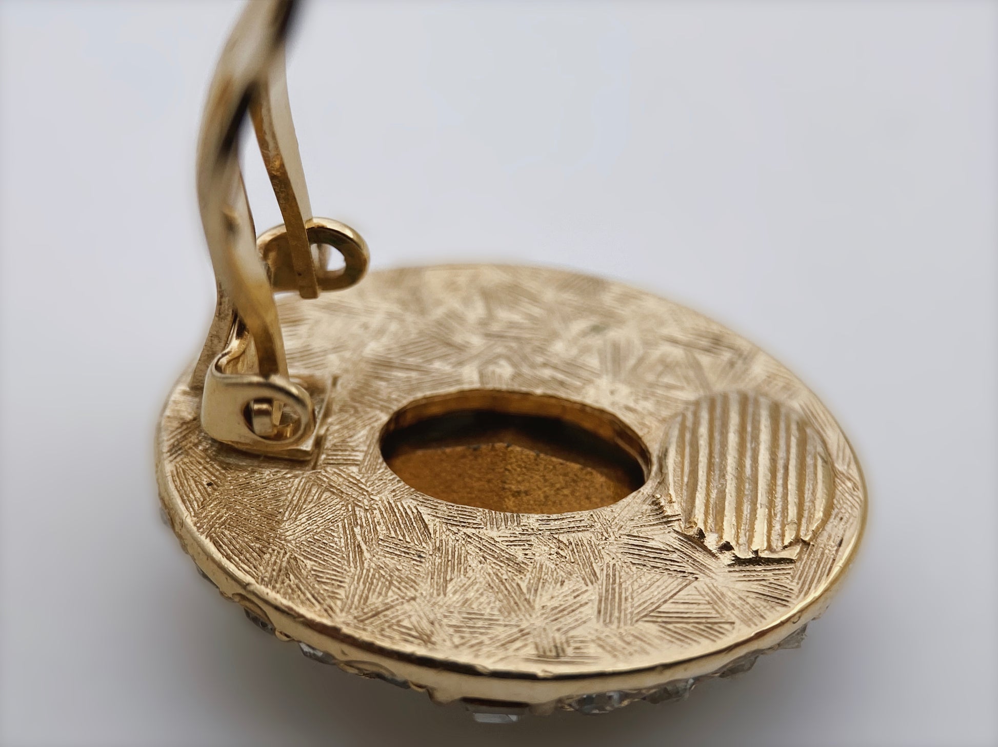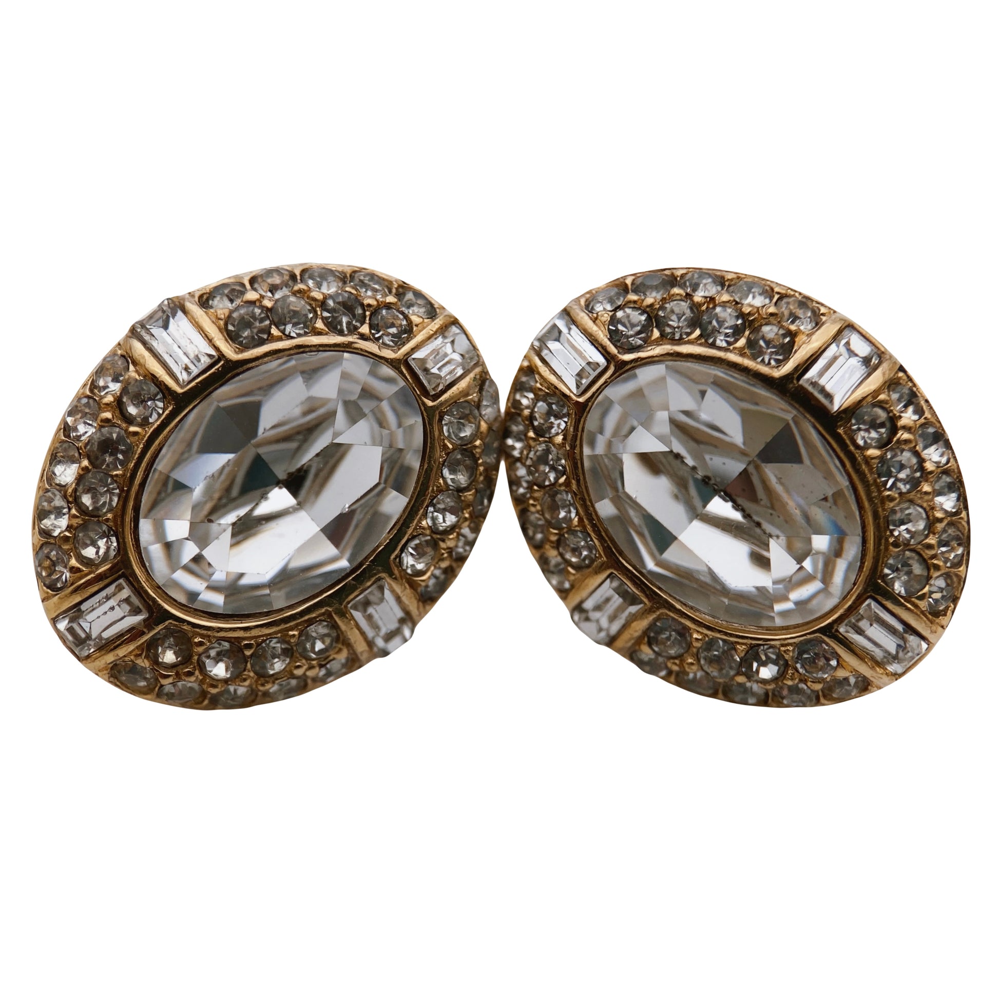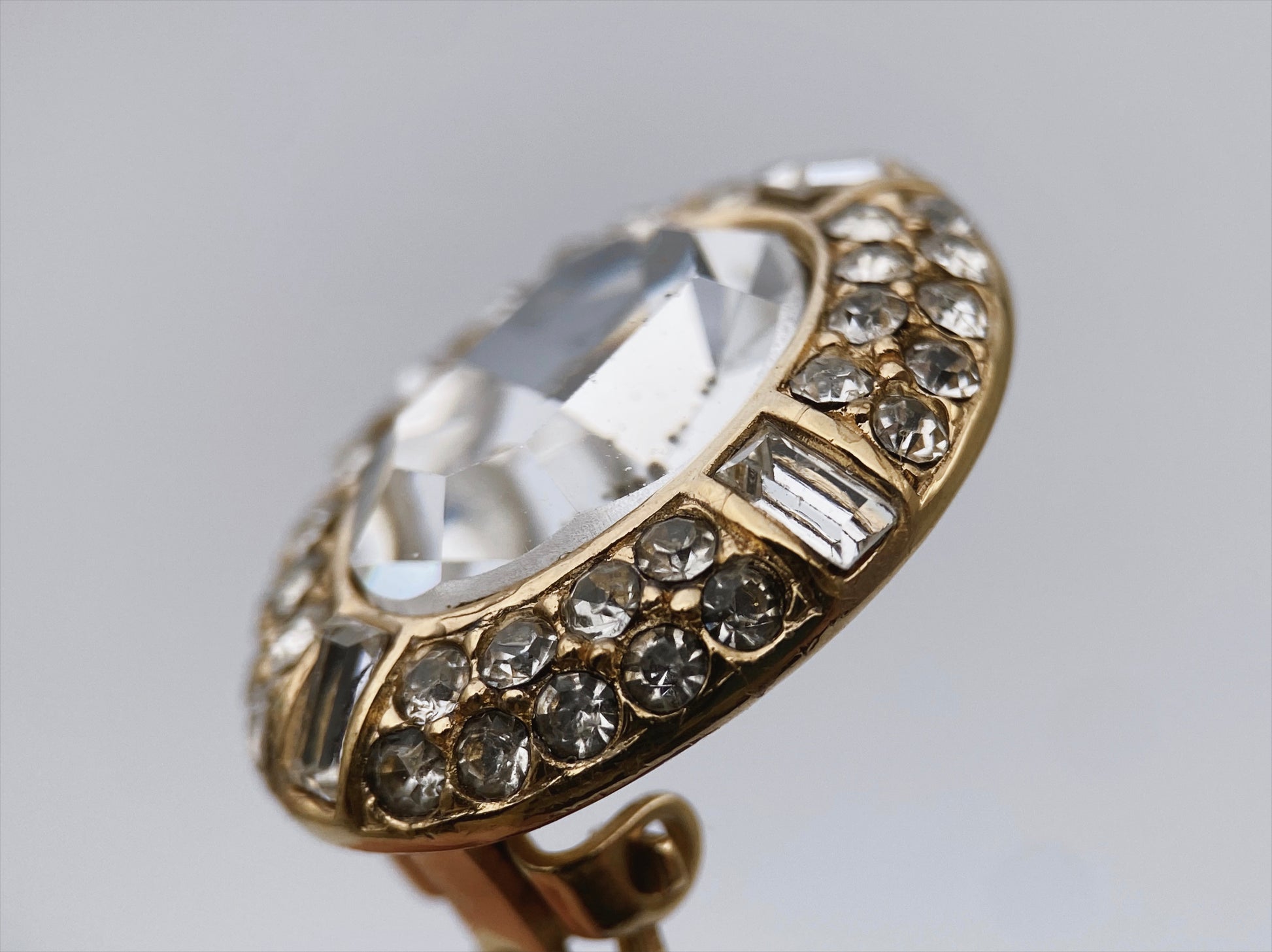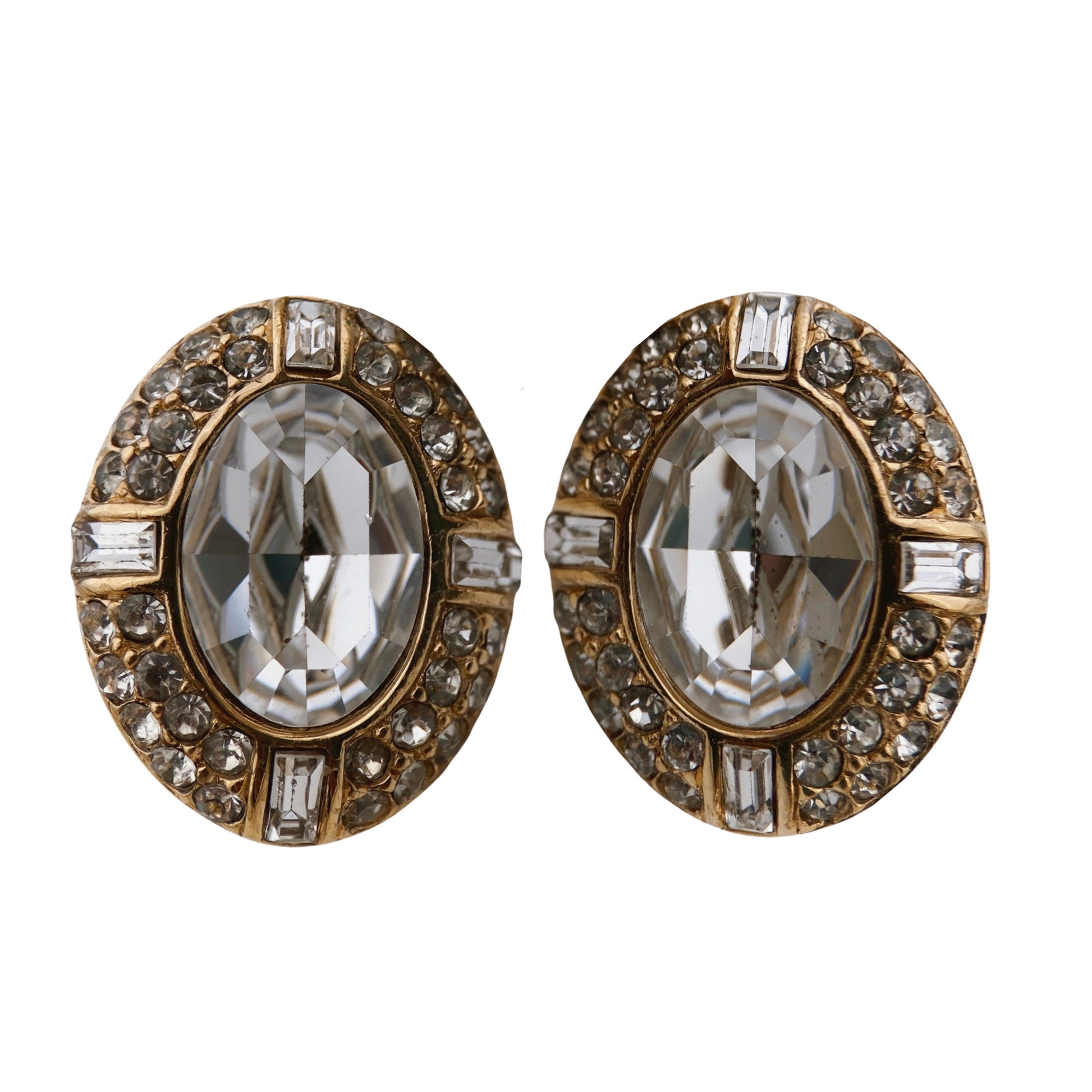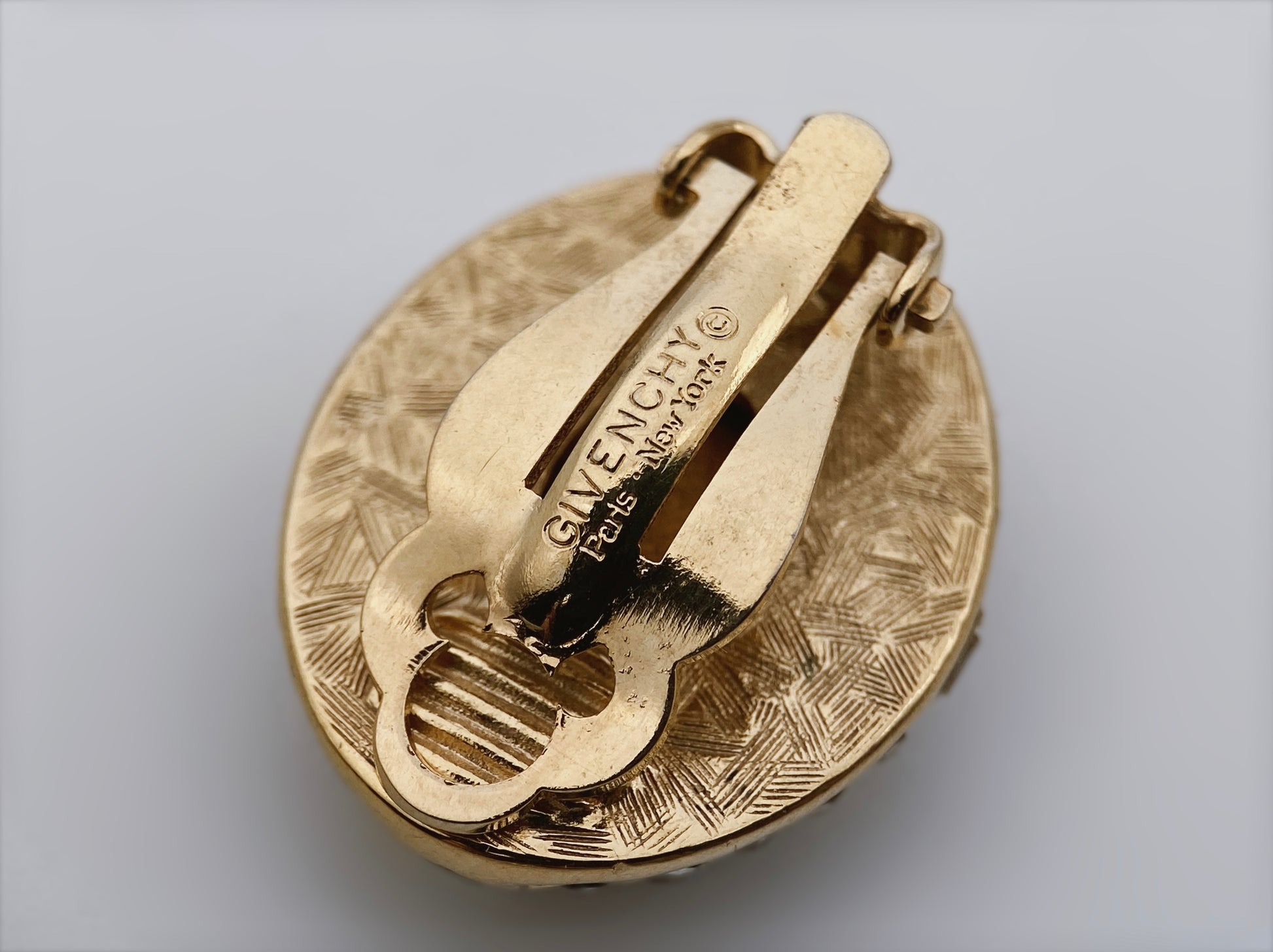 Prabangūs “Givenchy” klipsai, pagaminti apie 1980–1990 m. laikotarpiu, dekoruoti skaidriais briaunuotais kristalais. Centre – didelis ovalo formos akmuo, kurį juosia mažesni apvalūs ir pailgi stačiakampiai krištolo elementai. Metalas – auksaspalvis, suteikiantis šilto prabangos įspūdžio. Tai klasikinis “Givenchy” „statement“ stiliaus dizainas, derinantis eleganciją, prabangą ir išskirtinį žvilgesį.