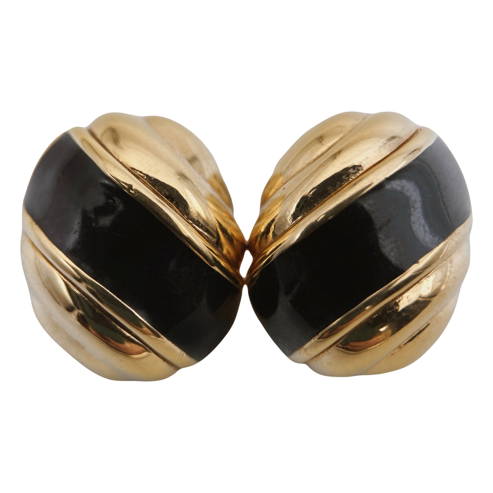 Sudėtis: paauksuotas metalas, juodas emalisBūklė: labai geraIšmatavimai: 1,7 x 1,4 cmSpalva: aukso, juodaŽymėjimas: “© NINA RICCI“Šalis: PrancūzijaLaikotarpis: 1980-1990 metaiRinkos vertė: 75-110 EURElegantiški “Nina Ricci” vintažiniai klipsai iš 1980–1990 m. laikotarpio, pagaminti Prancūzijoje. Aukso spalvos metalas ir juodo emalio juosta sukuria rafinuotą kontrastą – klasikinis paryžietiškos elegancijos akcentas bet kokiam įvaizdžiui.