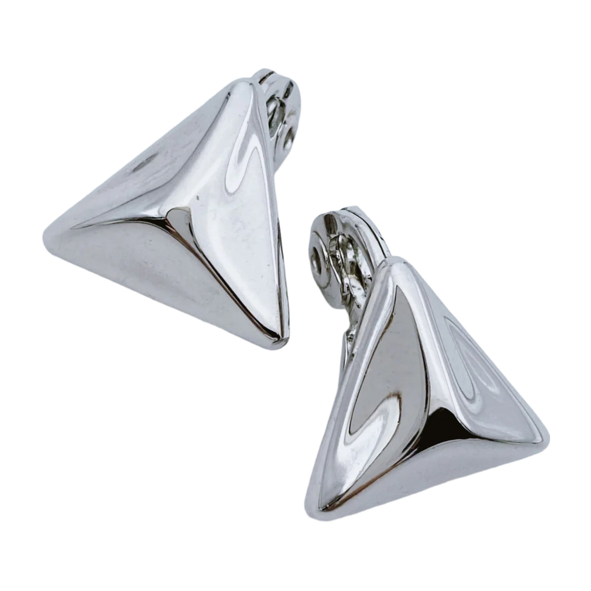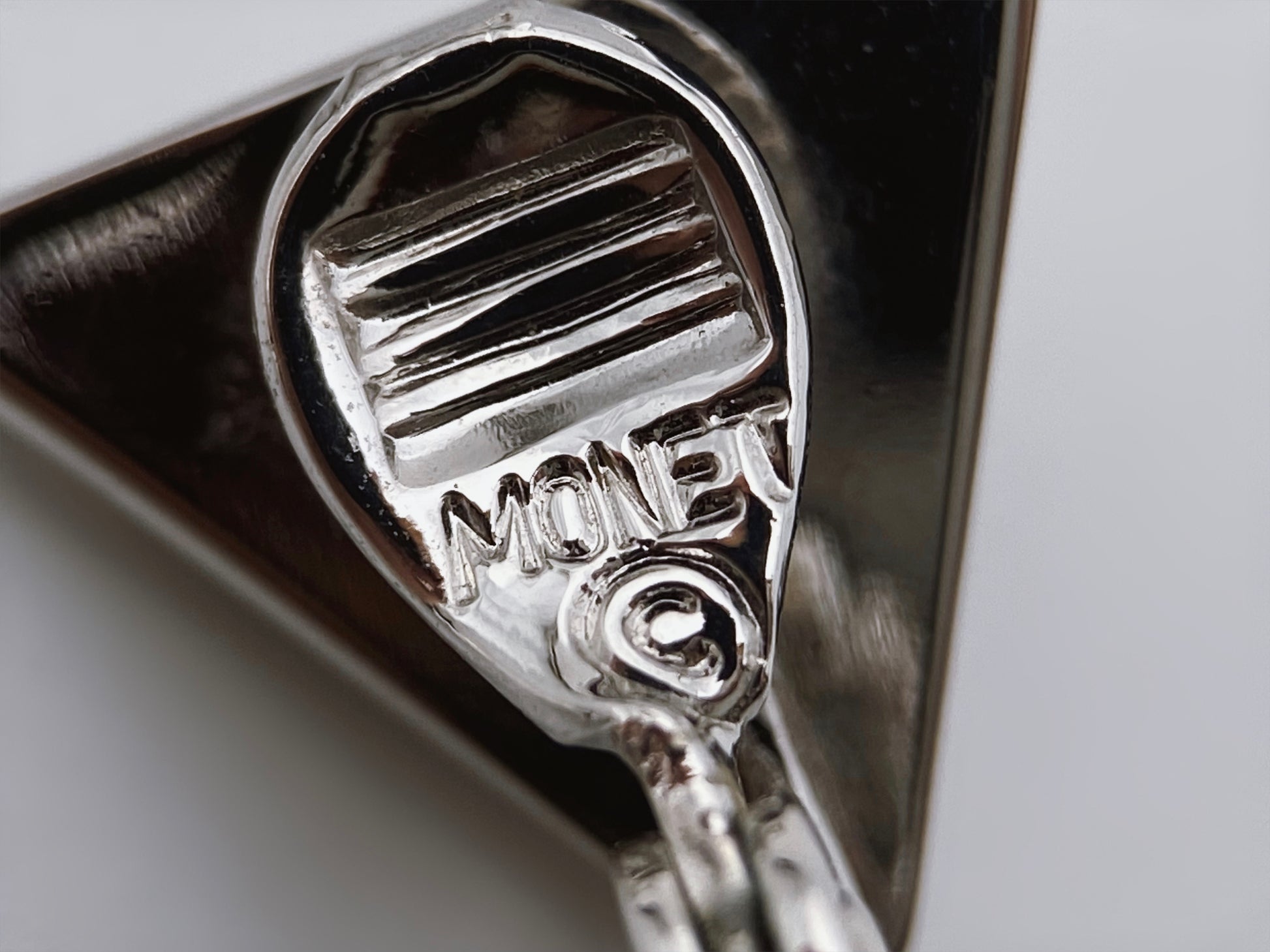 Sidabro spalvos geometriniai „Monet“ auskarai su trikampio forma ir ženklinimu MONET © (visomis didžiosiomis raidėmis) datuojami maždaug 1980–1990 m. pradžia. Šiuo laikotarpiu „Monet“ plačiai naudojo šį ženklą kartu su modernistiniu, architektūriniu dizainu.