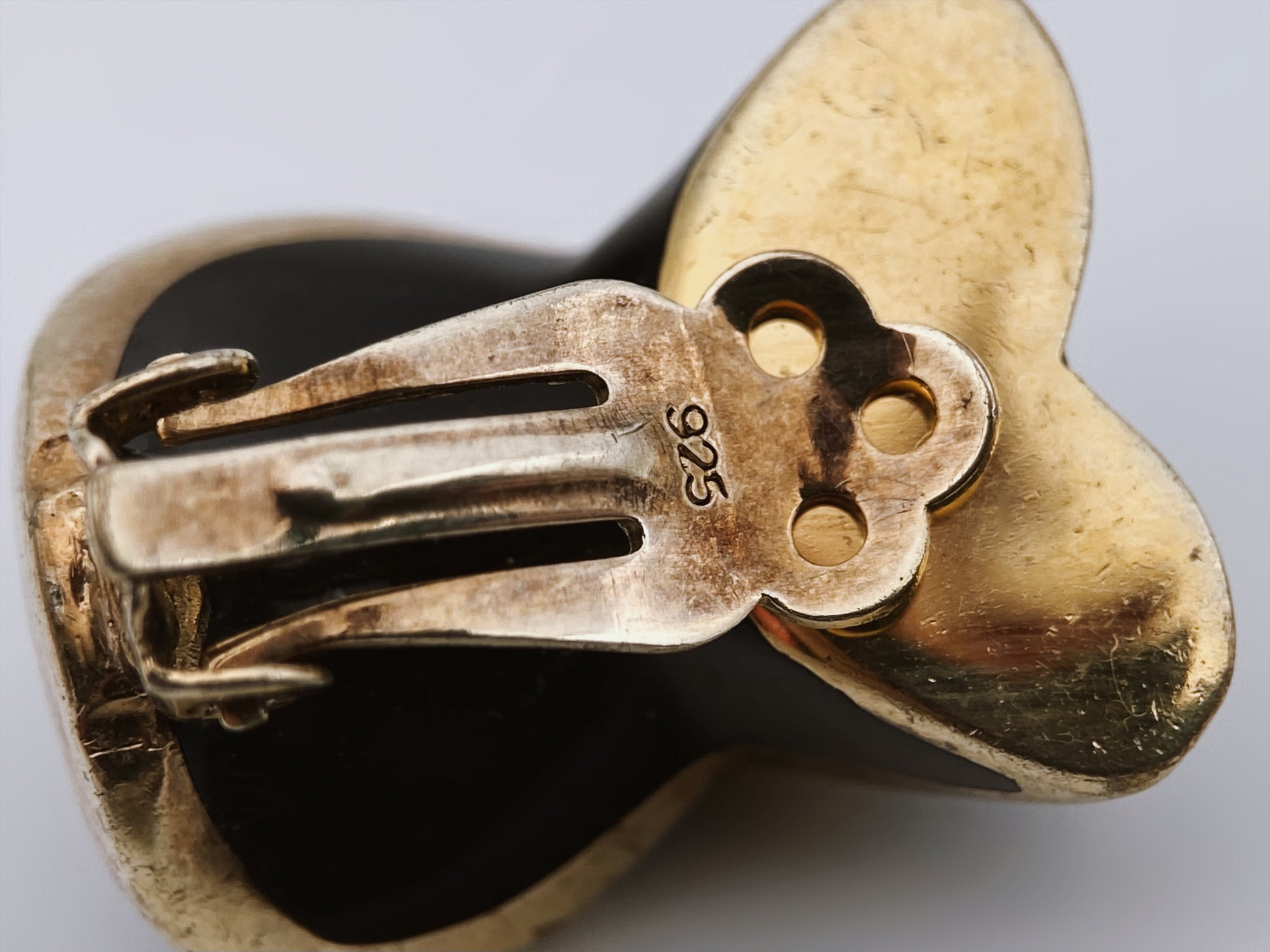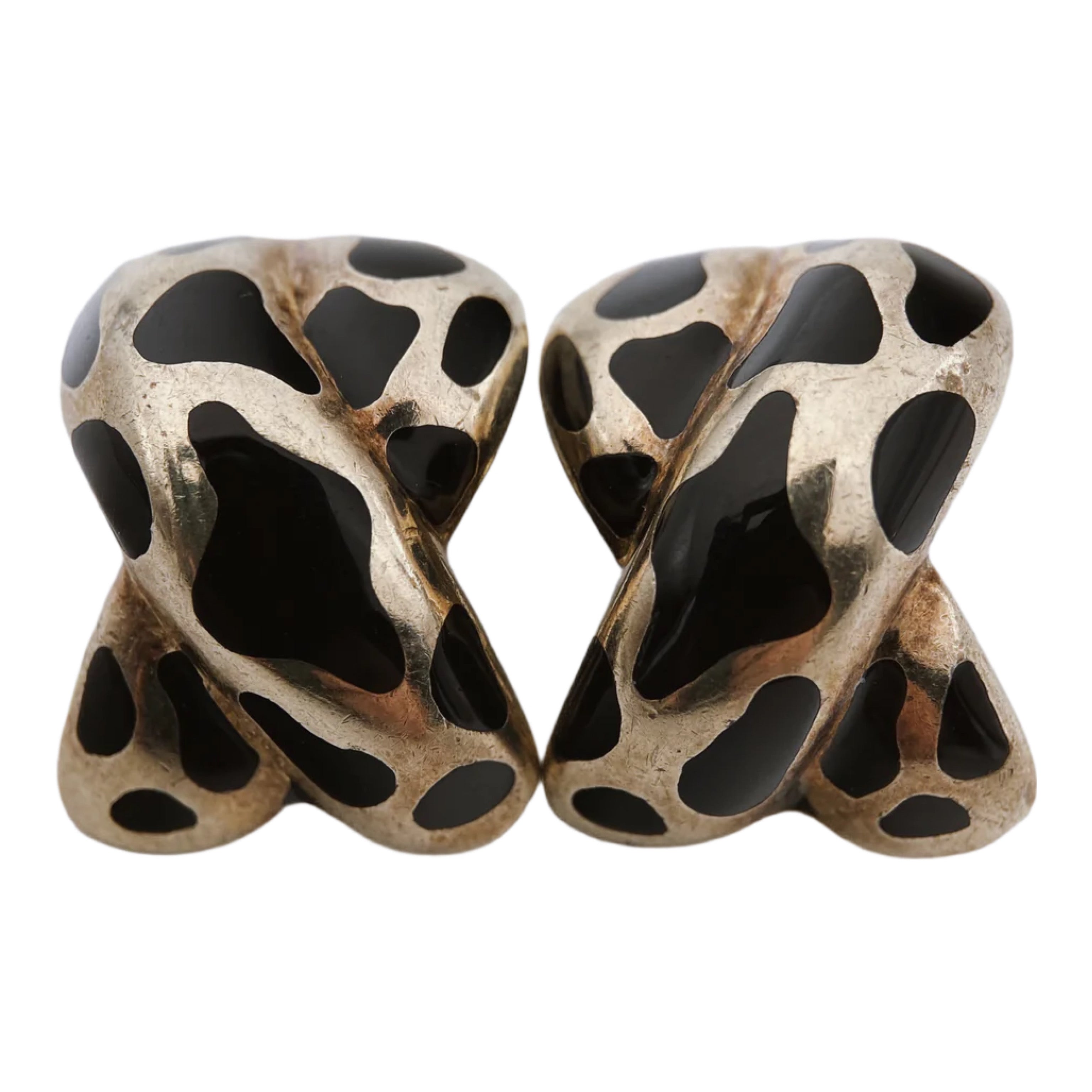 Tai išraiškingo dizaino auskarai klipsai, pagaminti iš sidabro su juodo emalio intarpais. Dizainas primena organinę, skulptūrišką formą su nelygiu, išlenktu paviršiumi ir netaisyklingomis juodomis dėmėmis, primenančiomis gyvūnų kailio raštą (leopardą ar žirafą). Juoda emalė įterpta į metalą – itin būdingas postmodernistinio ar organinio dizaino bruožas.