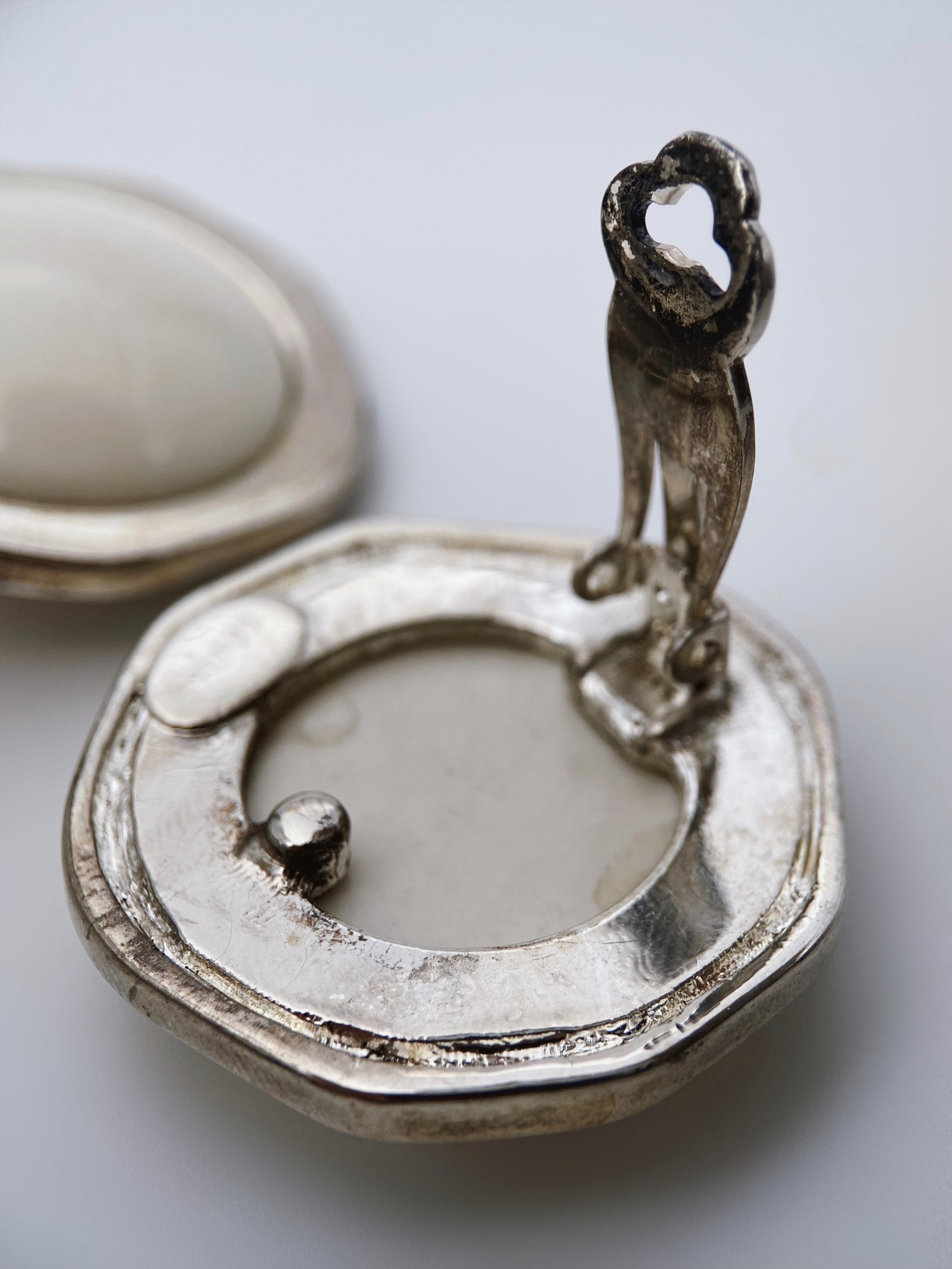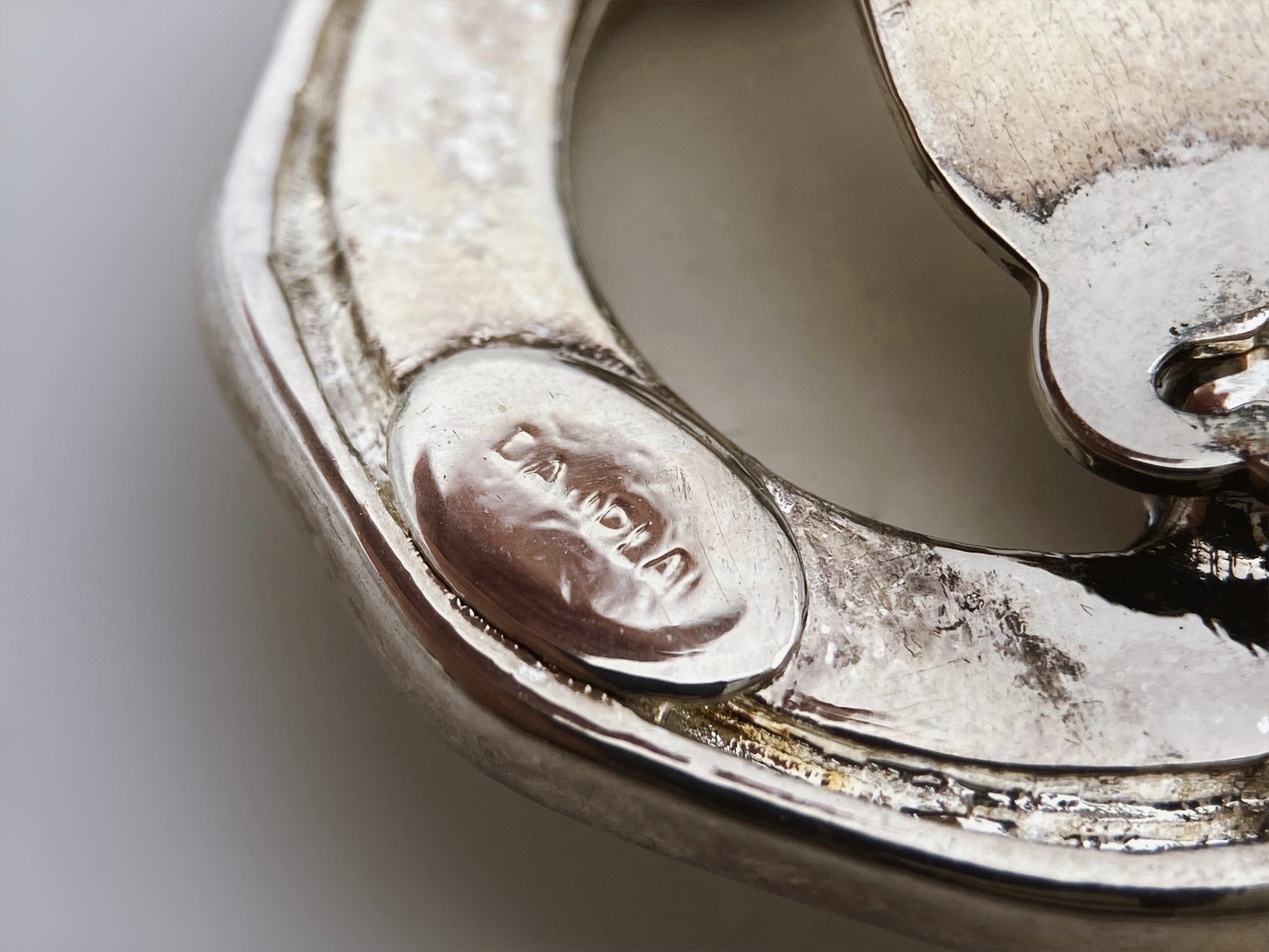 Sudėtis: metalas, lucitasBūklė: labai geraIšmatavimai: 3,5 x 3,5 cmSpalva: sidabro, pienoŽymėjimas: “Daupliase”Šalis: JAVLaikotarpis: XX a. 8 dešimtmetis