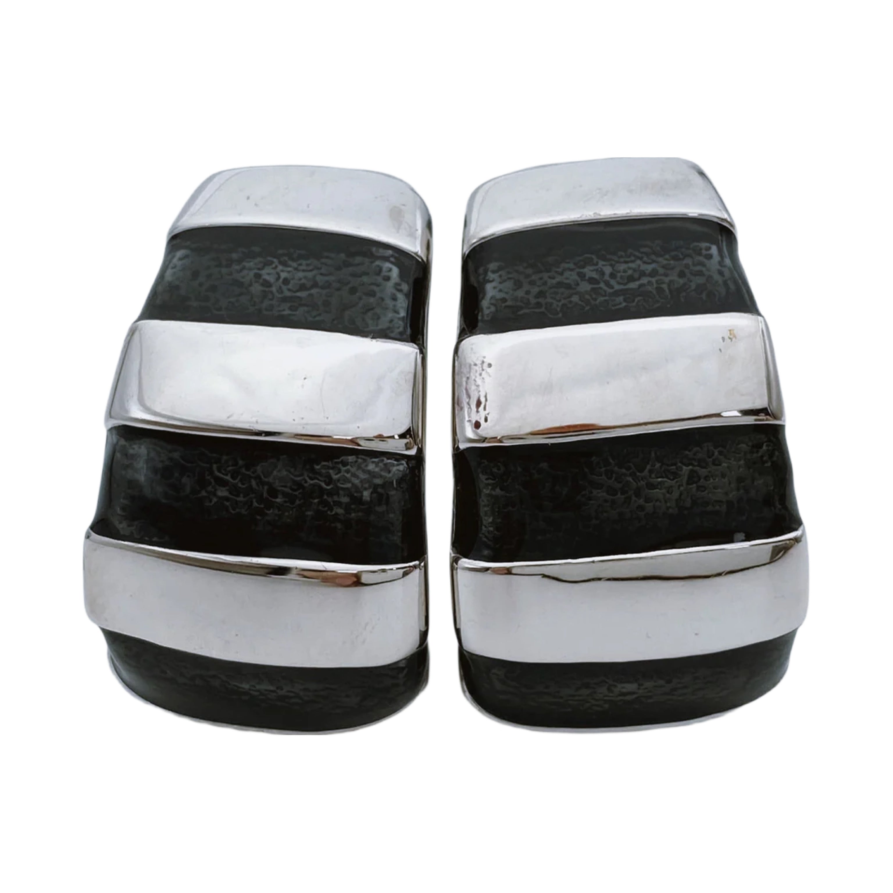 Kiek modernesnis, šiek tiek minimalistinis St. John dizainas. Masyvūs, šiek tiek išlenkti stačiakampiai klipsai; sidabruotas metalas ir tekstūruota juoda emalė, sudaranti kontrastingas horizontalias juostas; Modernistinis, beveik brutalistinis estetinis stilius.