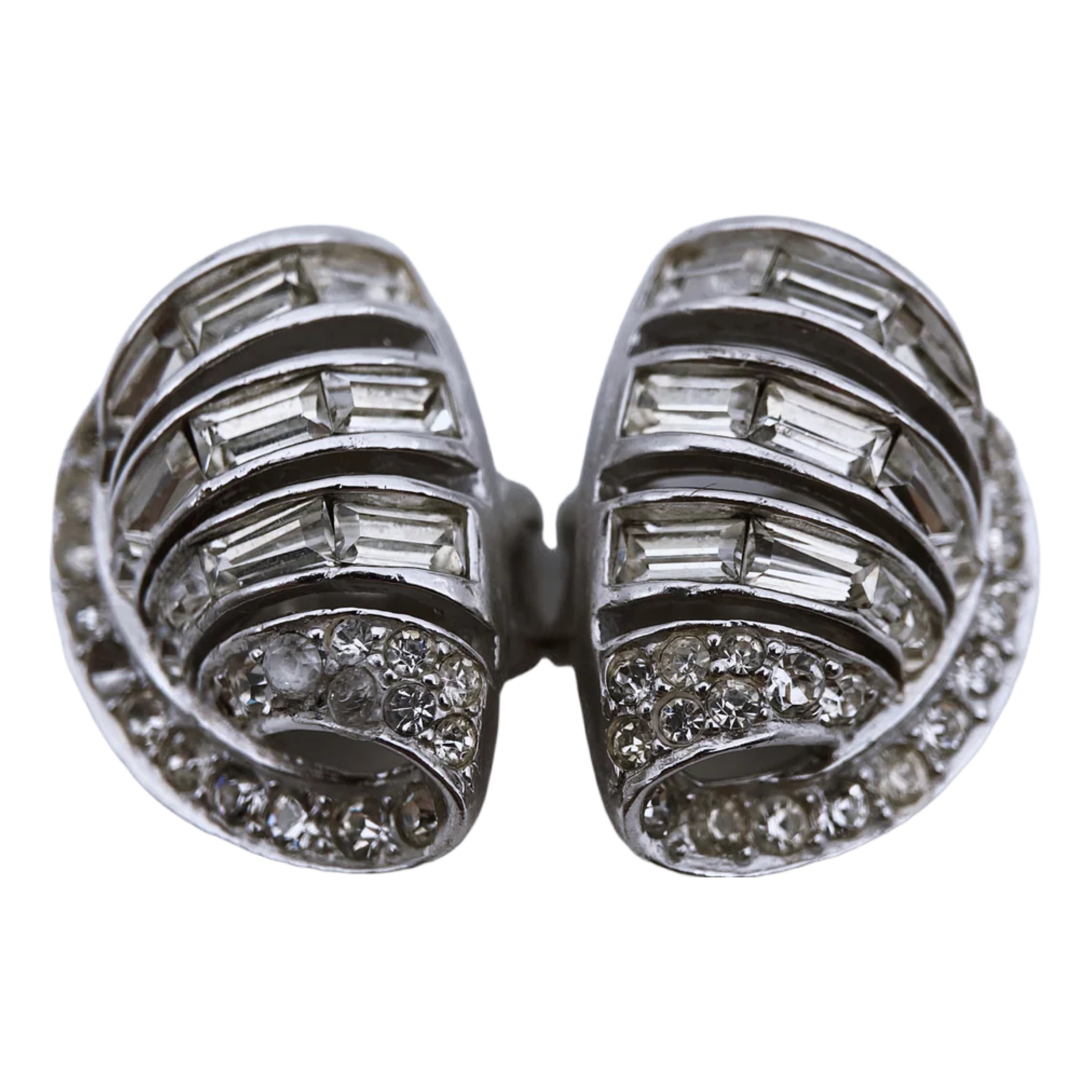 Marcel Boucher, vienas iš žymiausių amerikietiškos prabangios bižuterijos dizainerių. Žyma „BOUCHER“ ir patento numeris 171059 leidžia datuoti šiuos auskarus apie 1940-ųjų pabaigą – 1950-ųjų pradžią, tai yra jau po Art Deco aukso amžiaus, bet vis dar labai stipriai veikiamą jo estetikos. Arkos ir linijinių kristalų išdėstymas atspindi Art Deco aistrą simetrijai ir architektūrinėms formoms. Bagetinio pjūvio kristalai būdingi Art Deco stiliui – dažnai naudoti smulkūs stačiakampiai (bagetai), kruopščiai išdėstyti eilėmis. Blizgus sidabro tonas taip pat būdingas šiam stiliui, imituoja platiną, kuri buvo itin mėgstama Art Deco laikotarpiu. Dekoratyvinis perlenkimas ir auskarų kraštų forma bei vingiuojantis kontūras sukuria subtilią, bet griežtą estetiką.