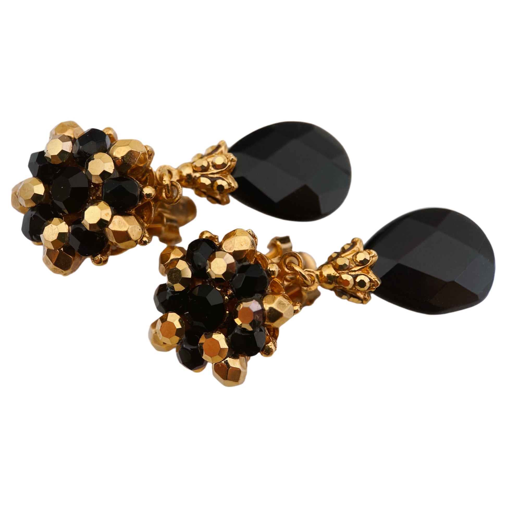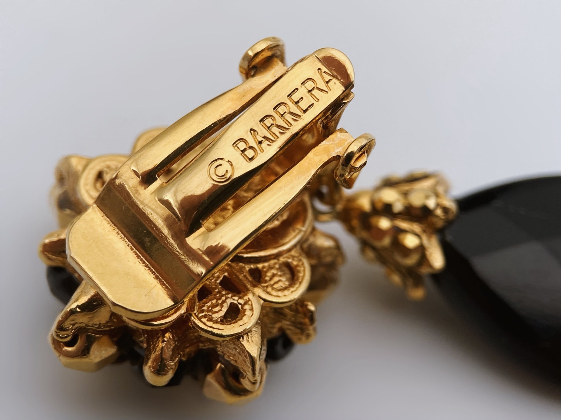 Šie auskarai su juodais lašo formos kristalais ir juodai-auksiniais burbuliukais yra © BARRERA ženklo papuošalai, greičiausiai pagaminti 1990-ųjų viduryje–2000-ųjų pradžioje. Stilius: barokinis / „Statement“ auskarai.