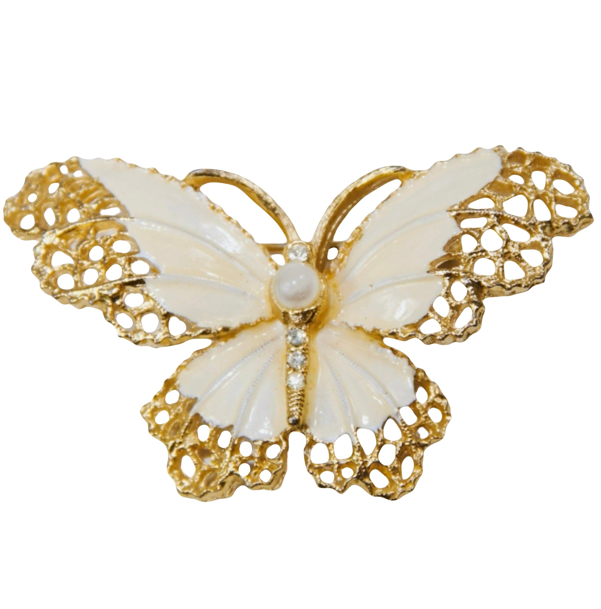 Vintažinė “BSK” drugelio formos segė, pagaminta iš aukso spalvos metalo, dekoruota emaliu, skaidriais kristalais per vidurį ir perlo imitacija centre. Sparnai puošti ažūrineis ornamentais, suteikiančiais lengvumo ir elegancijos. “BSK” – tai amerikiečių bižuterijos gamintojas, veikęs maždaug 1940–1970 m. Niujorke. Pavadinimas kilo nuo įkūrėjų vardų inicialų: Benny Steinberg, Slovitt ir Kaslo. “BSK” kurdavo elegantiškus, prieinamus papuošalus, dažnai emaliuotus, su kristalais, gėlių ar gamtos motyvais.