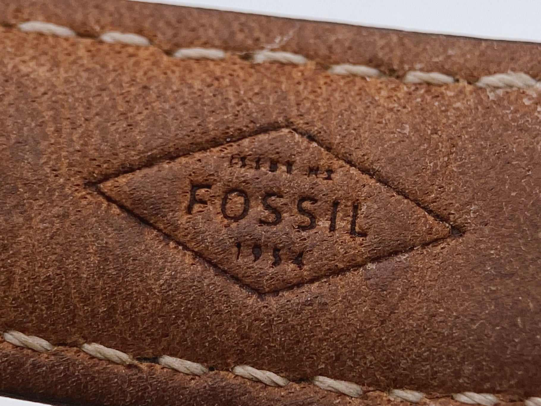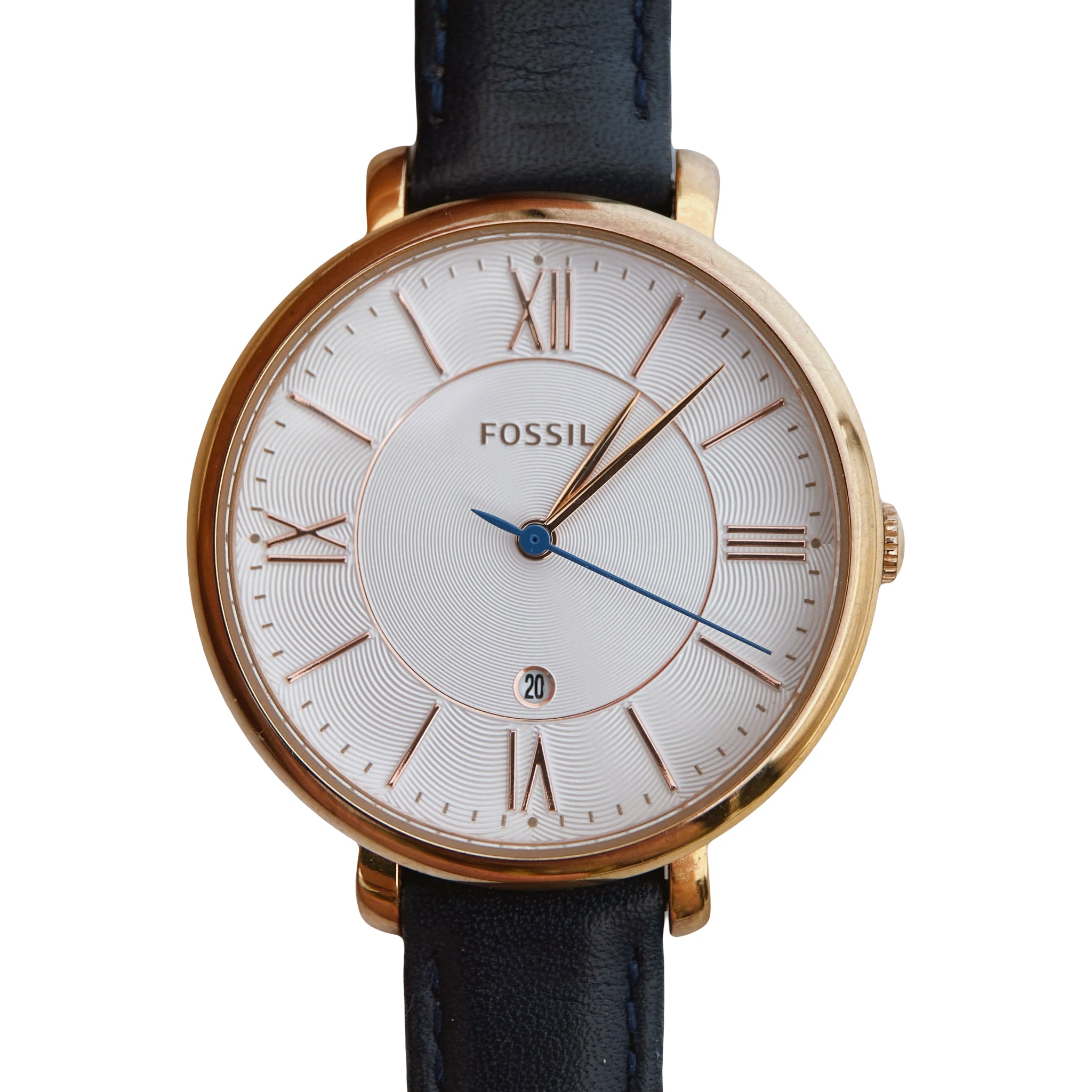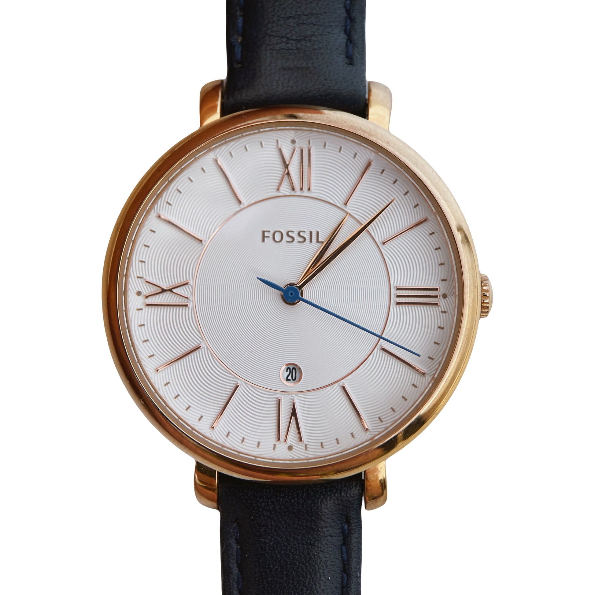 „Fossil ES4140SET“ laikrodis – moteriškas modelis su rožinio aukso spalvos korpusu, baltu tekstūruotu ciferblatu su romėniškais skaičiais, data ir originalia tamsiai mėlyna odine apyranke („Genuine Leather“, pažymėtas ir vidinėje pusėje). Laikrodis atsparus vandeniui iki 3 ATM.