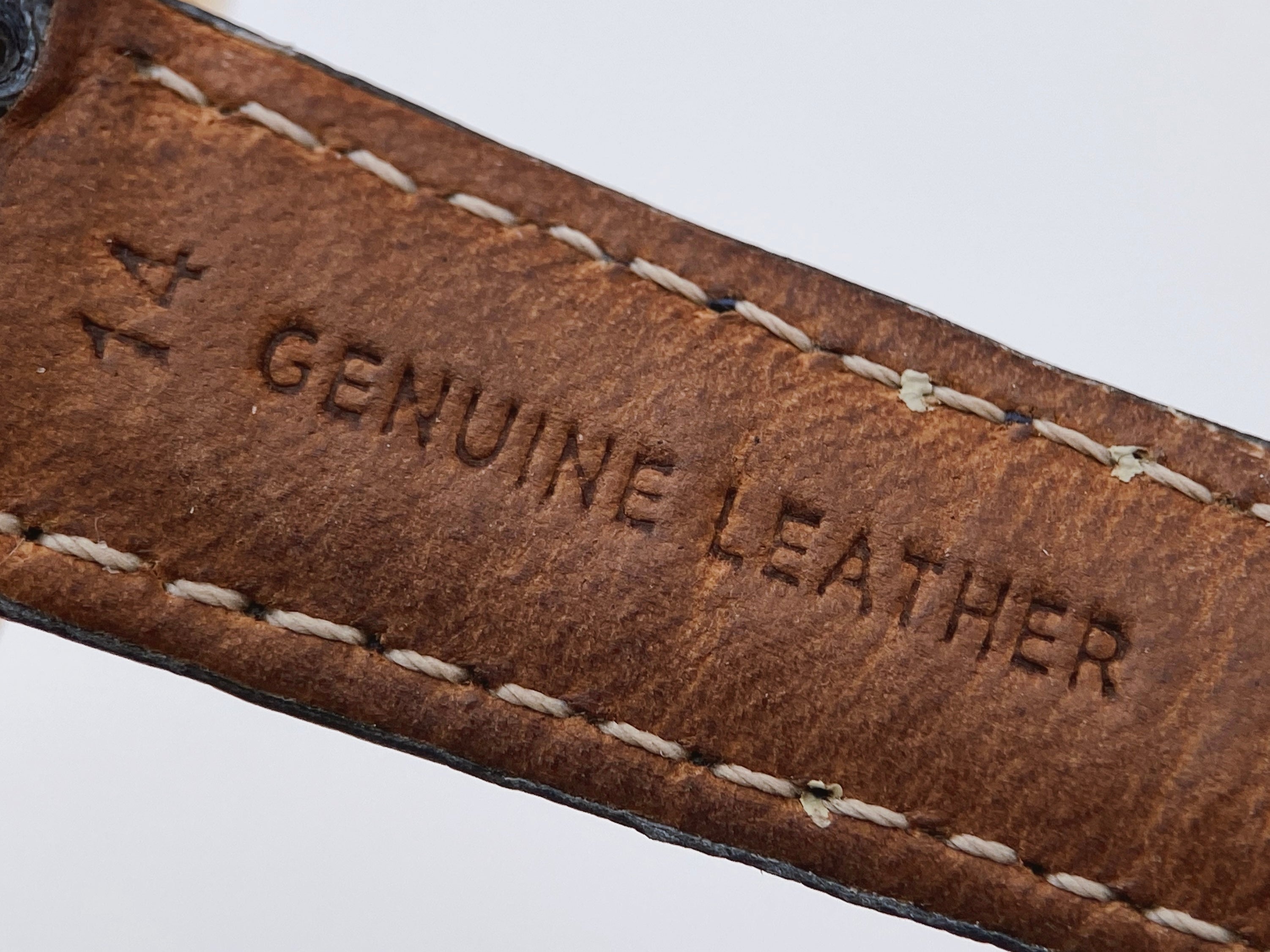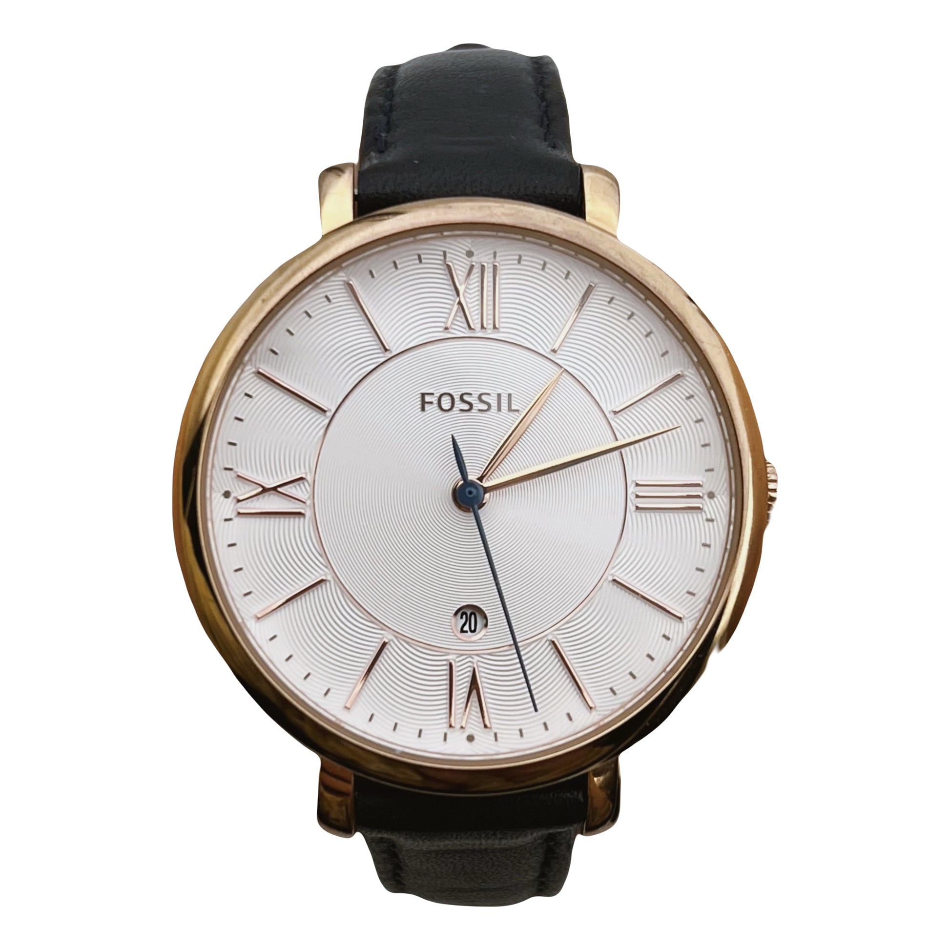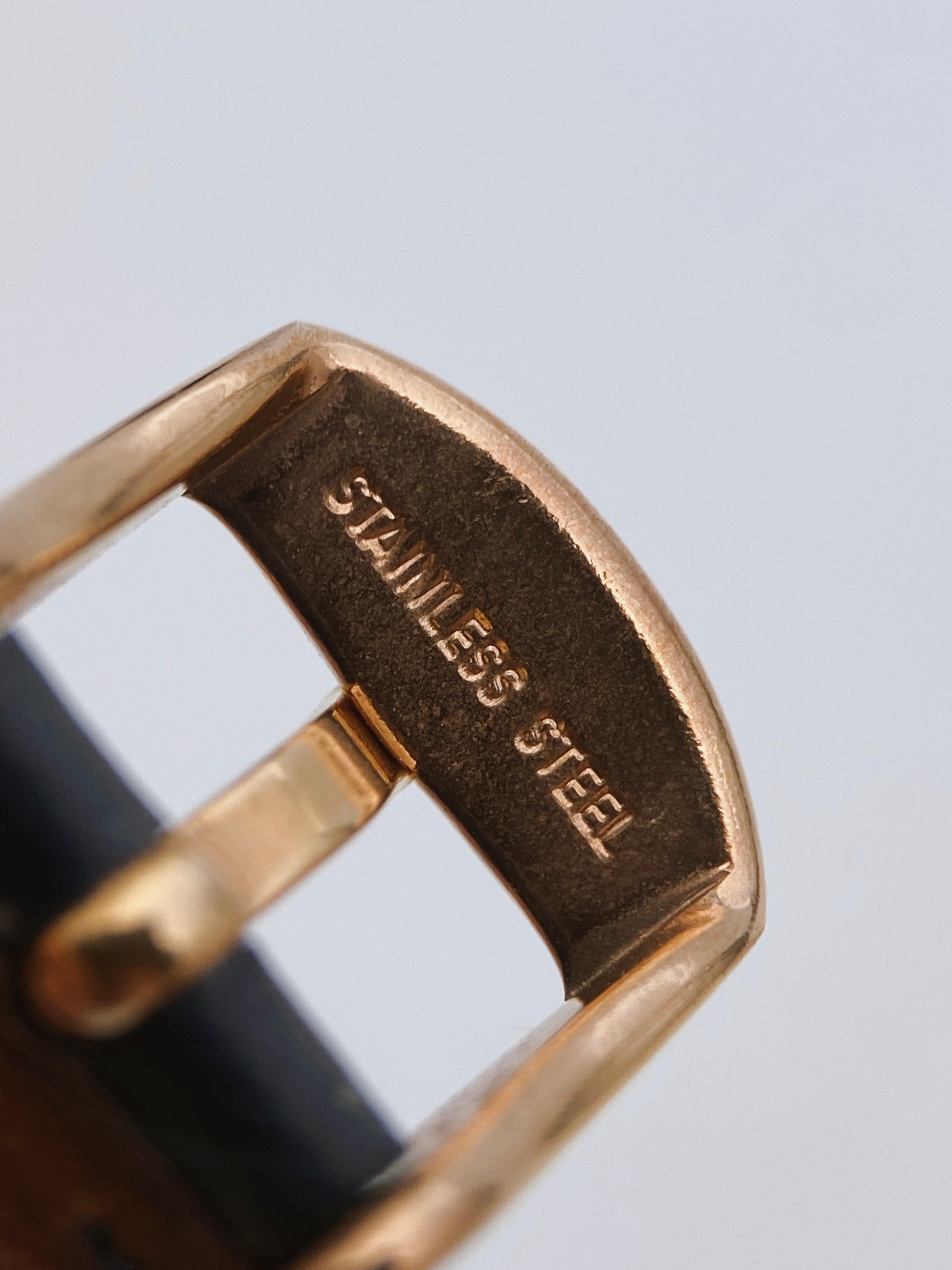 „Fossil ES4140SET“ laikrodis – moteriškas modelis su rožinio aukso spalvos korpusu, baltu tekstūruotu ciferblatu su romėniškais skaičiais, data ir originalia tamsiai mėlyna odine apyranke („Genuine Leather“, pažymėtas ir vidinėje pusėje). Laikrodis atsparus vandeniui iki 3 ATM.