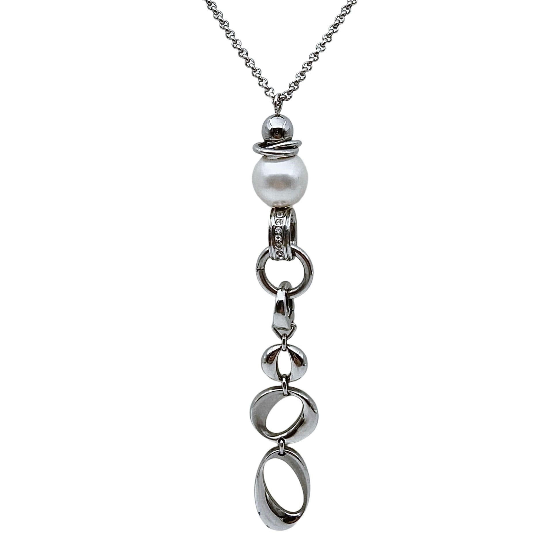 Tai „Fossil“ vėrinys su perlo imitacija, grandinėlėmis ir asimetriškomis metalinėmis kilpomis, turintis galimybę reguliuoti ilgį (pakabukas atsiskiria). Modernus, minimalistinis dizainas, dažniausiai datuojamas 2010–2020 m.