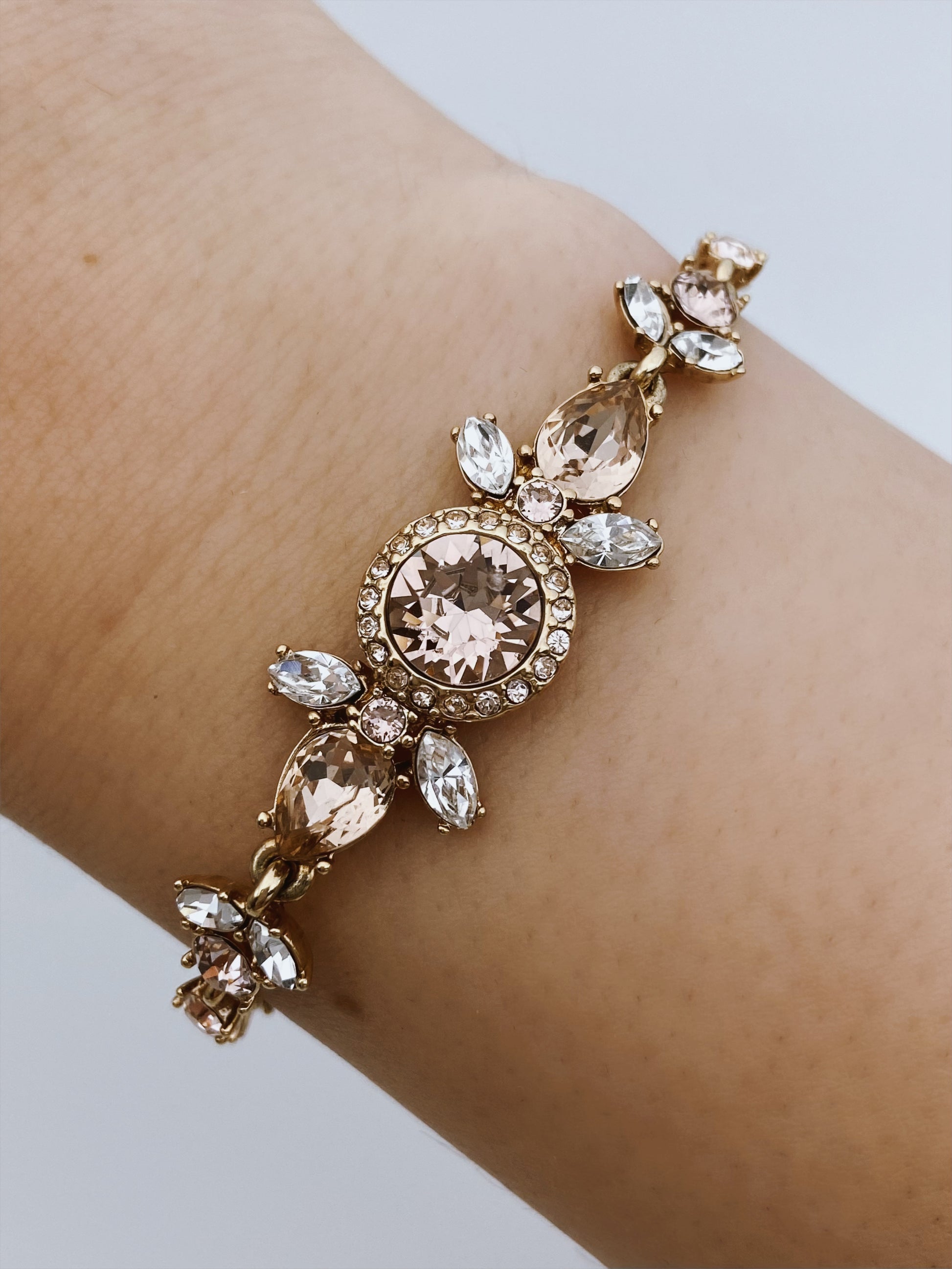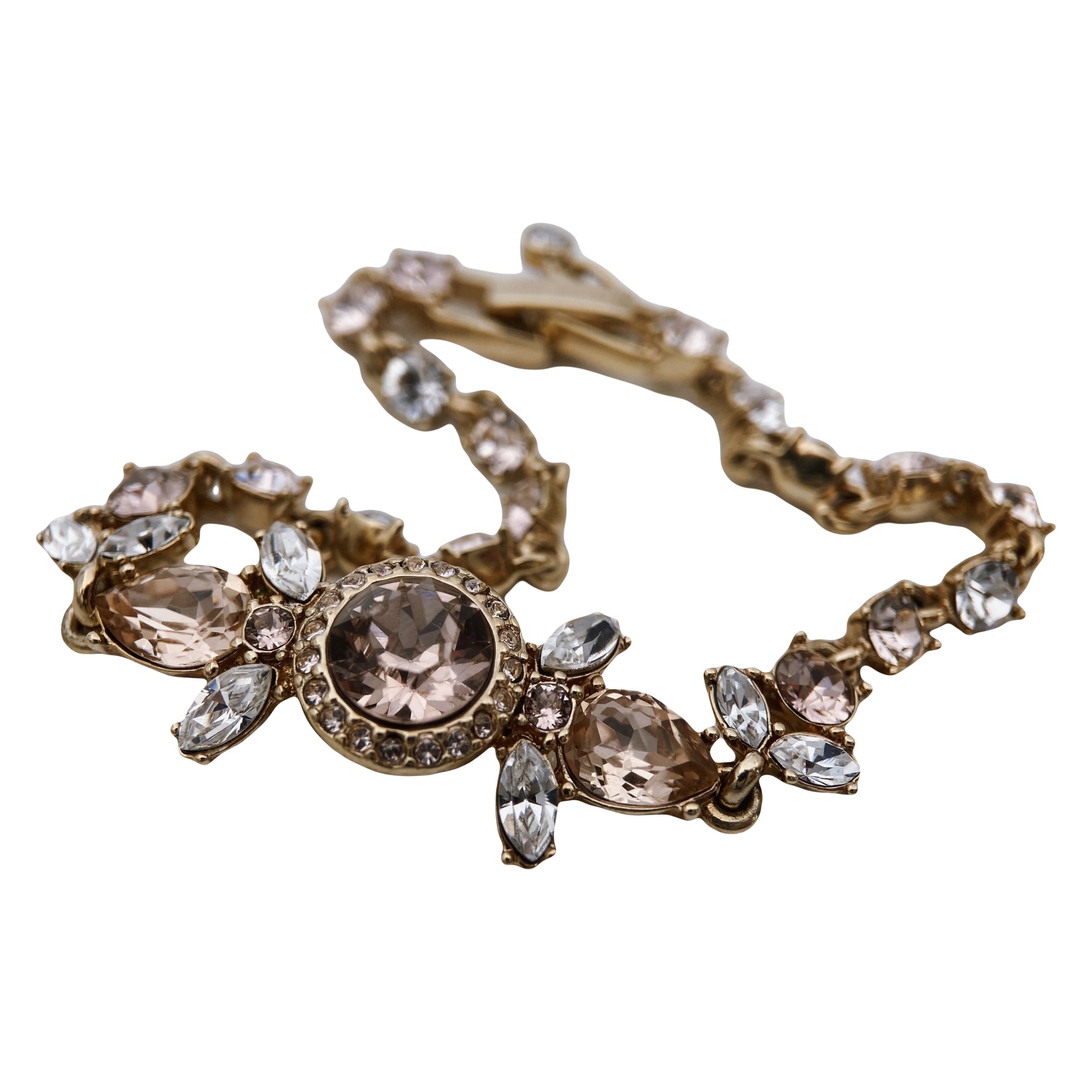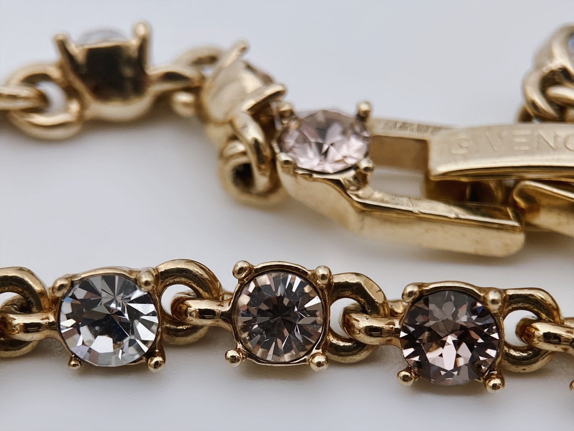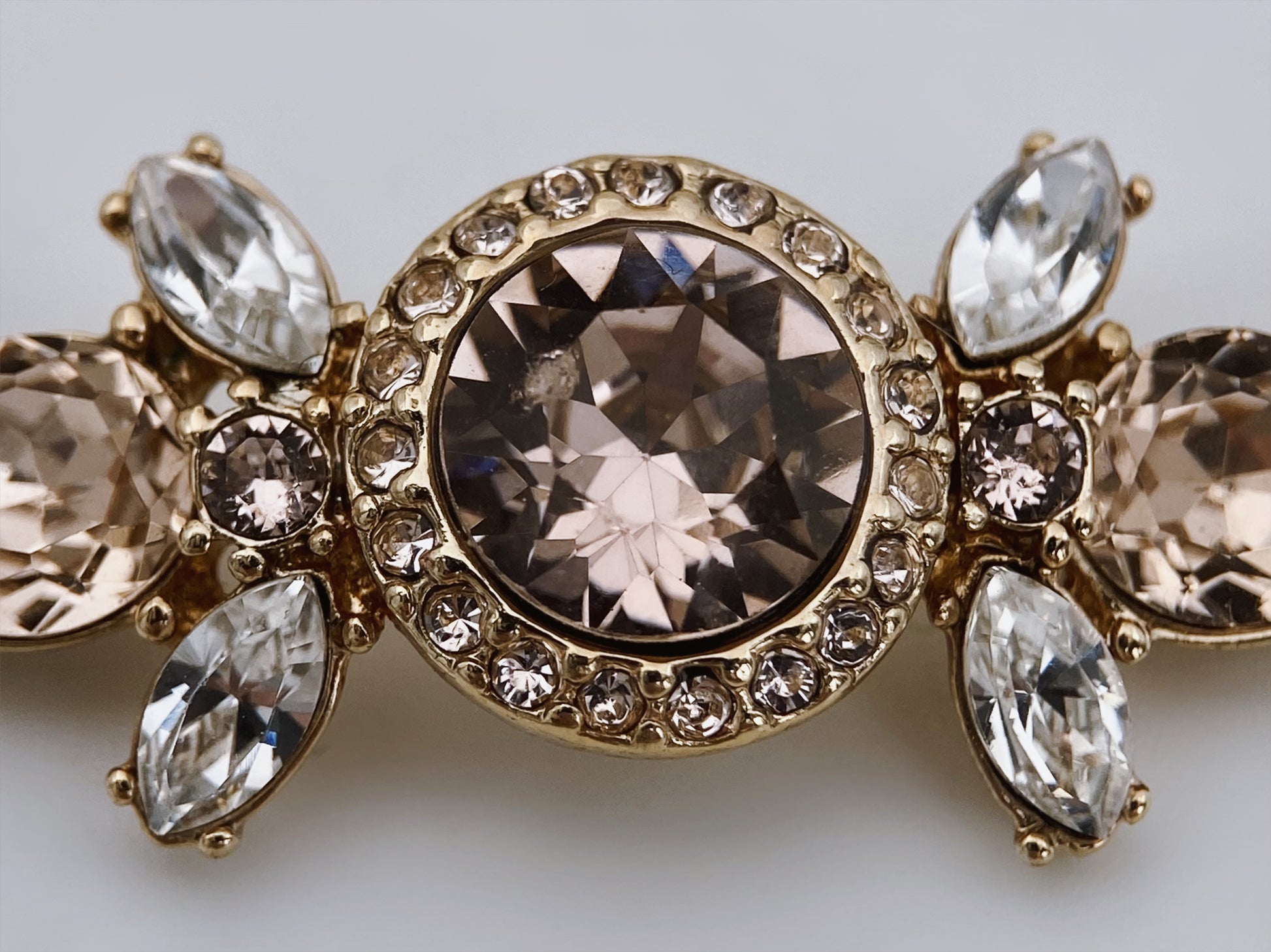 Sudėtis: metalas, kristalaiBūklė: labai gera (mažas kristalo įbrėžimas)Išmatavimai: 18 cmSpalva: aukso, rožinė, baltaŽymėjimas: “Givenchy”Šalis: Prancūzija