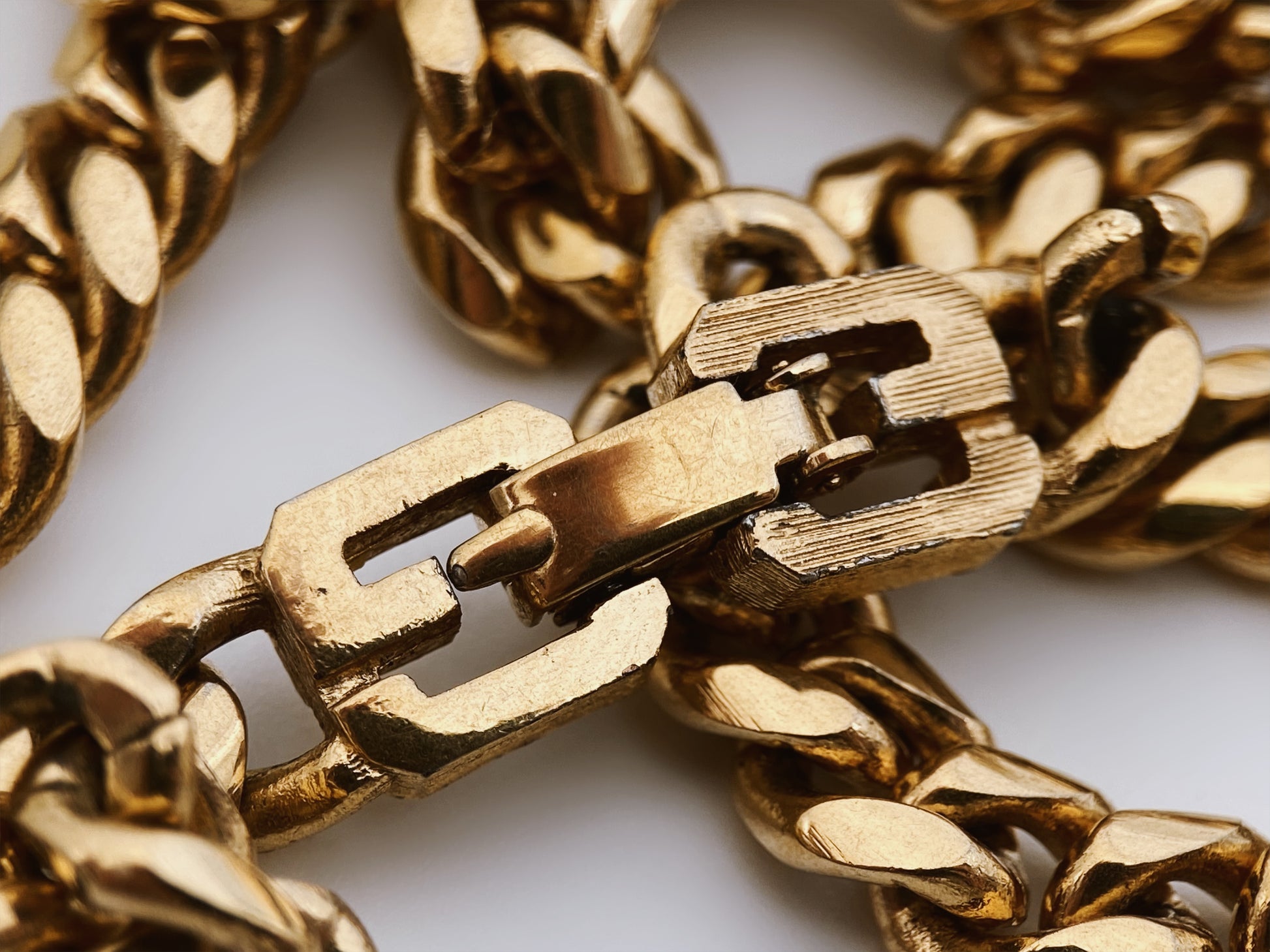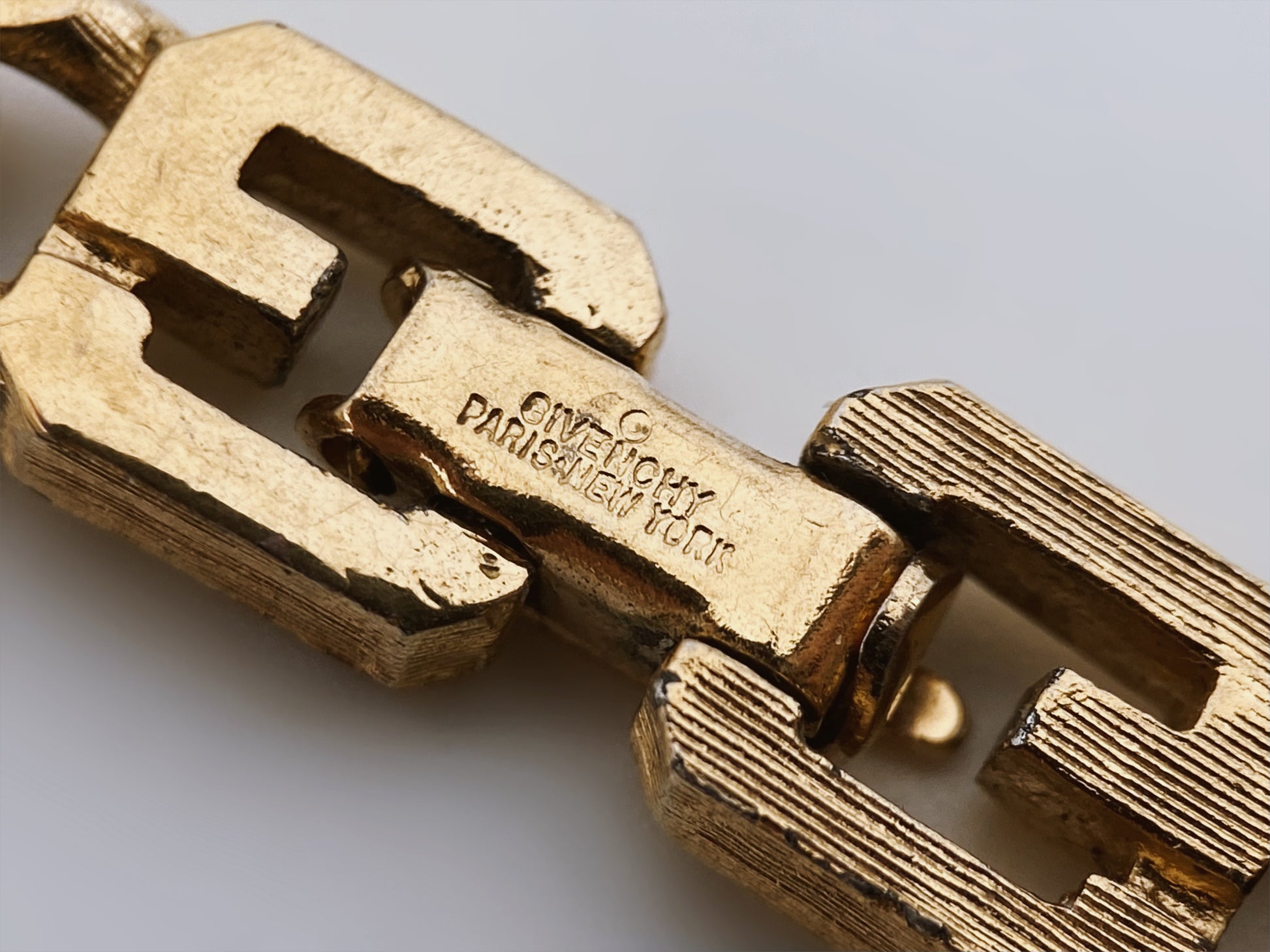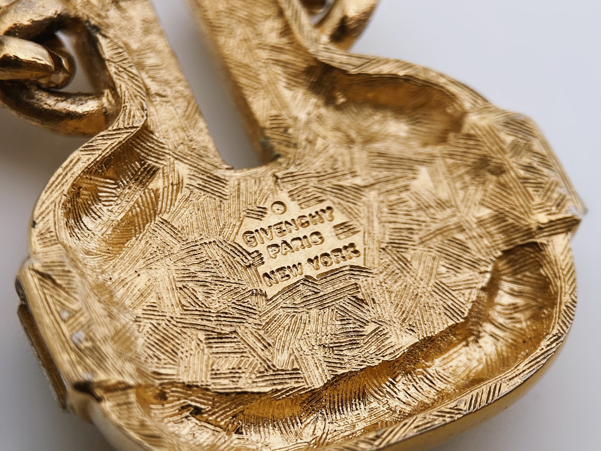 Vėrinys su masyviu pakabuku ir kristalais yra autentiškas “Givenchy Paris New York” kūrinys, tikėtina iš 1975–1990 m. laikotarpio. Paauksuotas „curb“ tipo grandinėlės segmentas ir geometrinis, “Art deco” stiliaus pakabukas, centrinio kristalo ir įstatytų stačiakampių “baguette” kristalų kombinacija – labai būdinga “Givenchy” prabangios bižuterijos stilistikai. “Box clasp” (dėžutinis) užsegimas su saugumo spynele, būdingas aukštesnės klasės bižuterijai iš 1970–1990 m. laikotarpio.