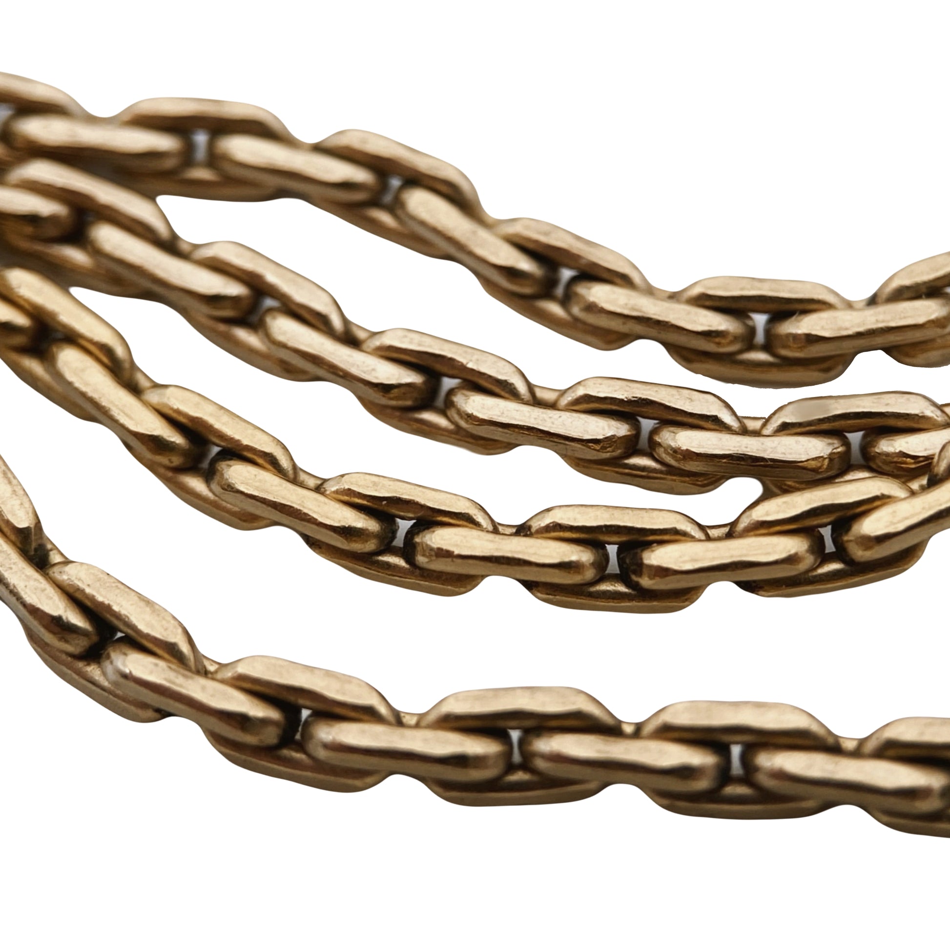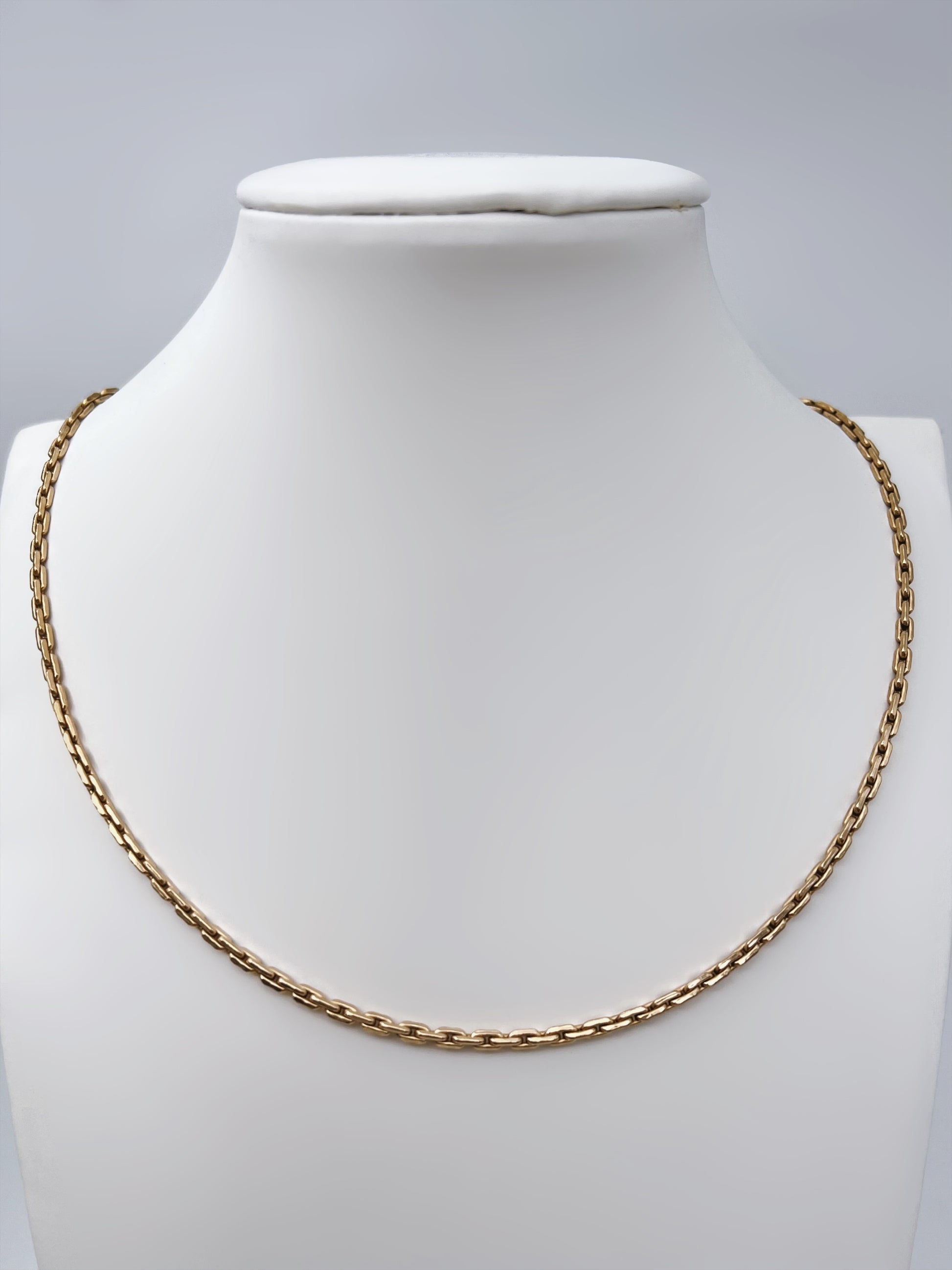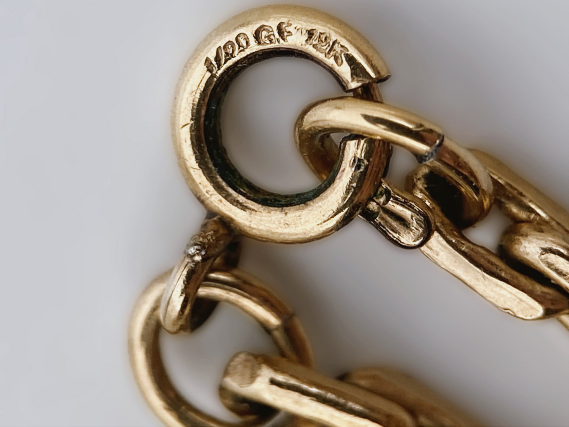 Tai klasikinio stiliaus, lygi, aukso spalvos, tvirto pynimo grandinėlė. Grandinėlė su žyma “1/90 12K GF reiškia, kad 1/90 svorio dalis yra 12 karatų aukso. Grandinės tipas: ankstyvas „cable link“ / figaro stiliaus variantas.