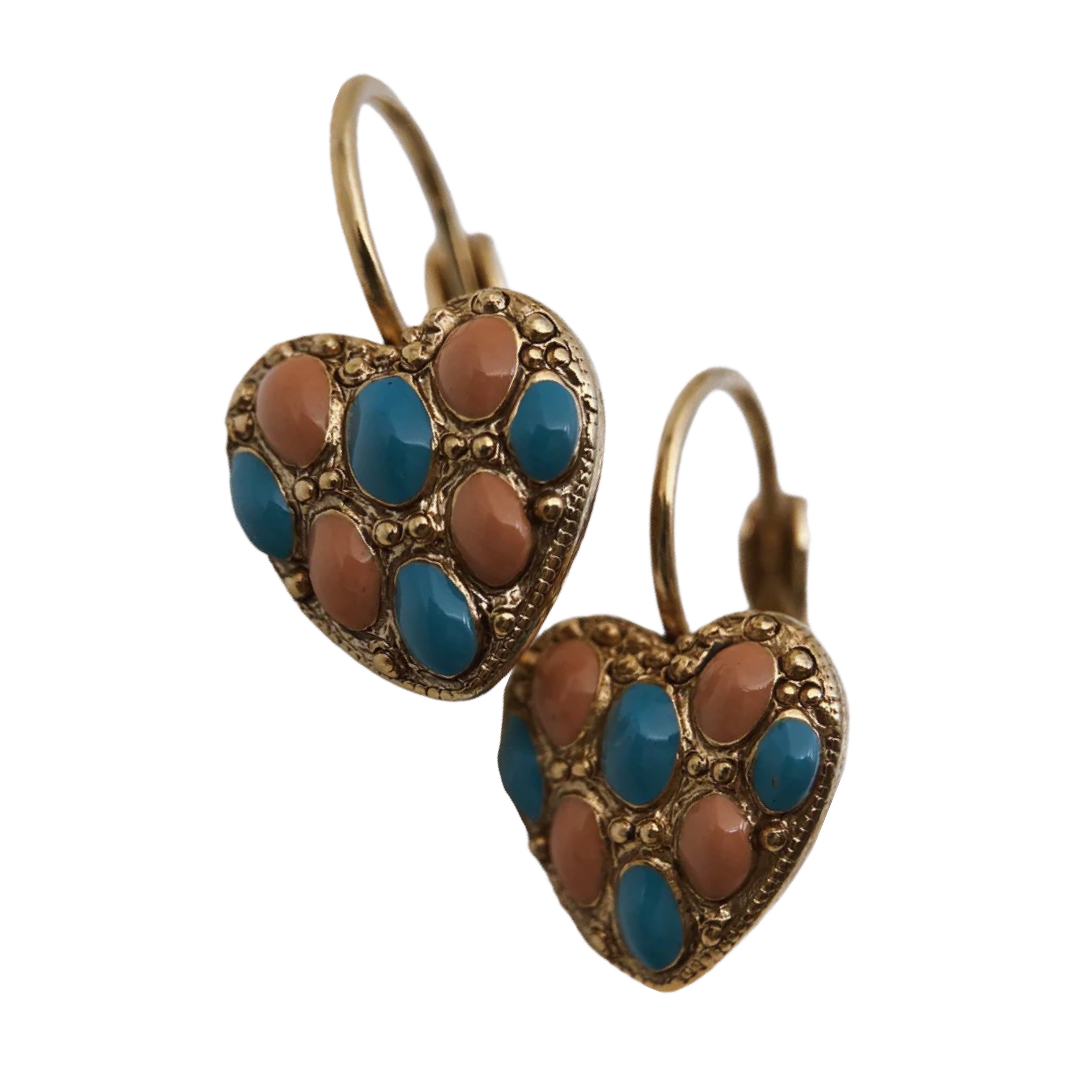 “Joan Rivers” kolekcijos kabantys auskarai su širdelės formos motyvu ir spalvingomis emalės detalėmis. Kabošono tipo akmenėliai poliruoti kupoliniu paviršiumi – tipiška Joan Rivers® papuošalų estetikai.