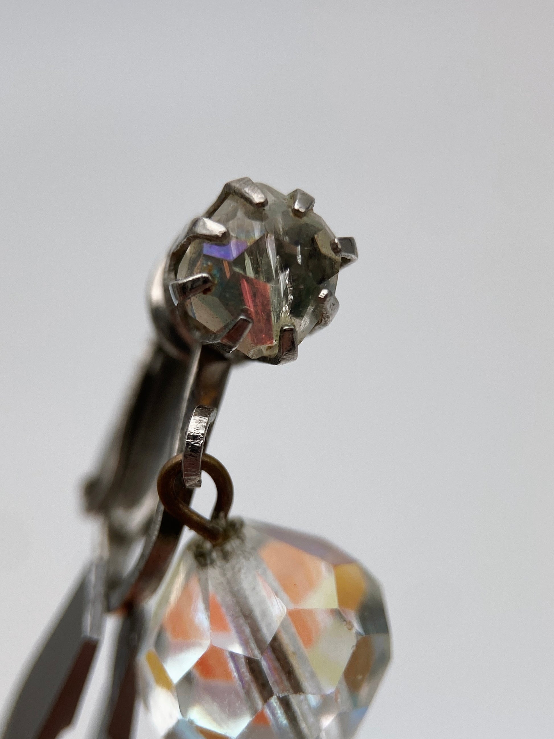 Sudėtis: metalas, briaunuoti Aurora Borealis kristalai Būklė: labai gera Išmatavimai: 2,3 x 1 cm Spalva: sidabro, skaidri su vaivorykštiniu (AB) atspindžiu Žymėjimas: nėra Šalis: JAV Laikotarpis: 1950-1960 metai Rinkos vertė: 40-50 EUR