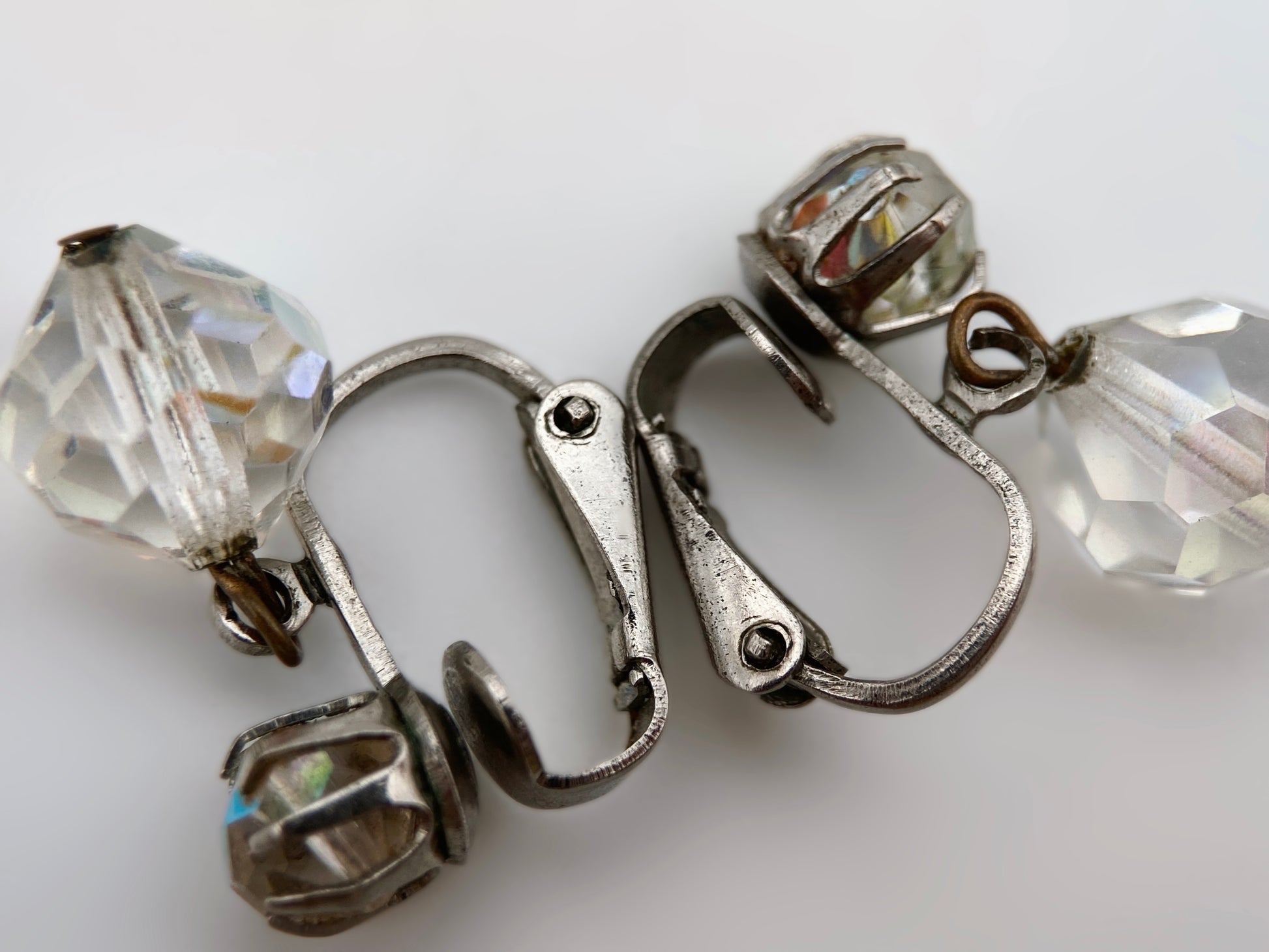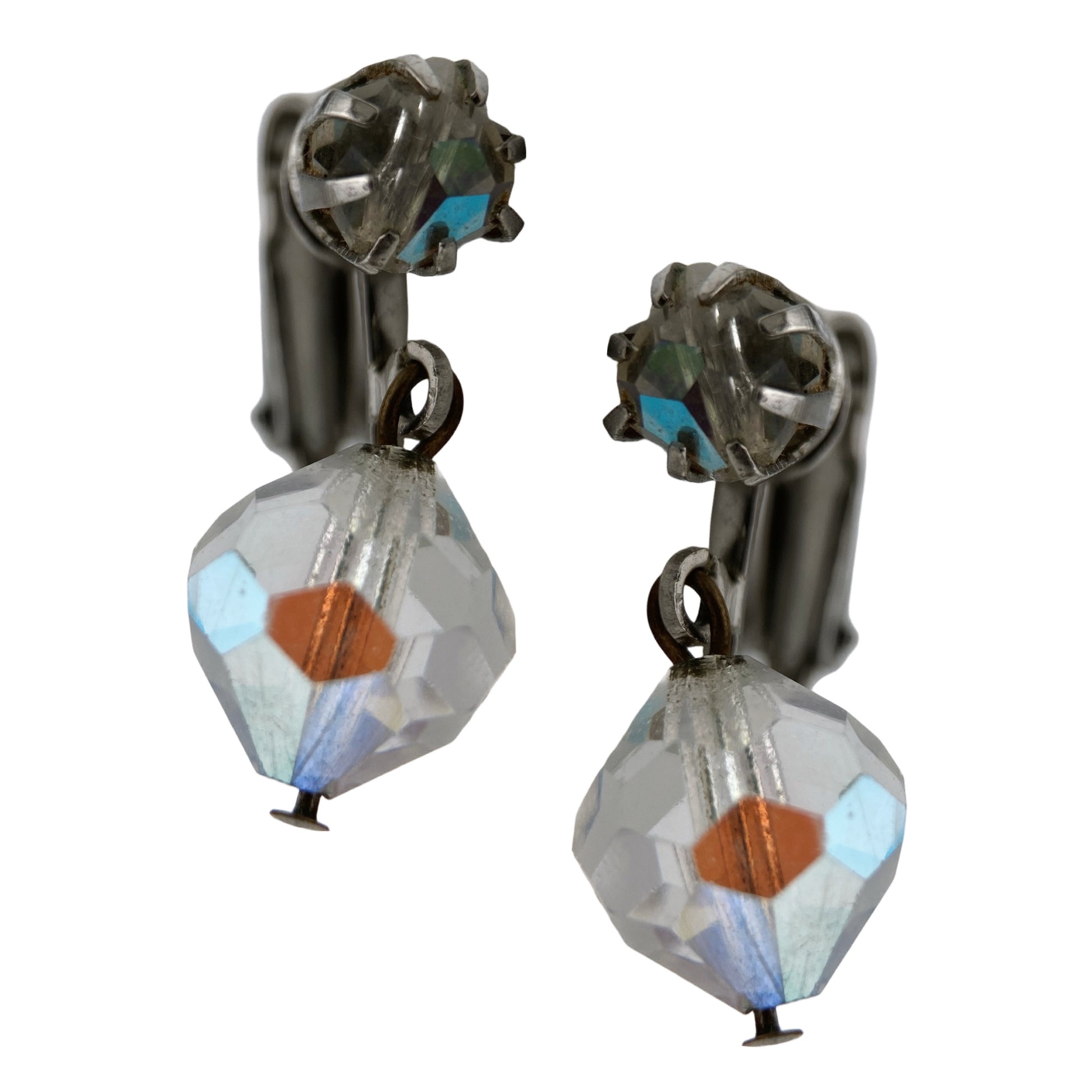 Retro sidabro spalvos klipsai su briaunuotais Aurora Borealis kristalais. Viršutinėje dalyje – apvalus, žėrintis kristalas įtvirtintas metaliniais laikikliais, o apatinėje – kabantis didesnis daugiabriaunis karoliukas su švelniu mėlynos, rožinės ir aukso atspalvių spindesiu. Konstrukcija su klasikiniu „paddle back“ tipo klipsiniu užsegimu, dažnai naudotu to laikotarpio JAV ir Čekoslovakijos gaminiuose. Tokie auskarai dažnai gaminti „Aurora Borealis“ danga padengtais kristalais, kuriuos sukūrė „Swarovski“ bendradarbiaujant su mados namais „Christian Dior“ apie 1955 m.