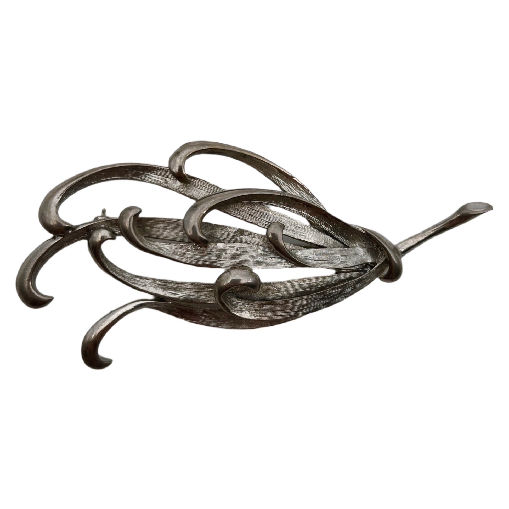 Sudėtis: sidabruotas arba rodžiu dengtas metalas Būklė: labai gera Išmatavimai: 9 x 4,5 cm Spalva: sidabro Žymėjimas: “Kramer” Šalis: JAV Laikotarpis: 1943-1950 metai Juvelyrikos laikotarpis: Retro Rinkos vertė: 25-50 EUR