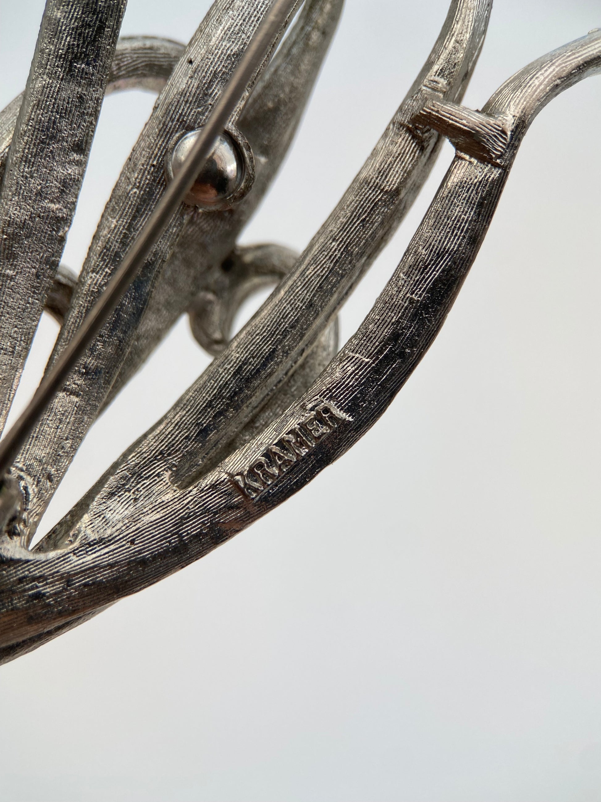 Ši sidabro spalvos sagė su stilizuotais, išlenktais lapeliais labai būdinga Kramer of New York estetikai – elegantiškas, šiek tiek modernistinis, bet kartu skulptūrinis dizainas. Gėlės ar lapų motyvais įkvėpta abstrakcija – dažna „Kramer“ stiliaus tema, ypač 1950–1960 m. Apdaila: matinė + blizgi sidabrinė tekstūra (vadinama „frosted and polished“ apdaila) – viena iš „Kramer“ ypatybių. Metalas: dažnai naudojo „rhodium plated“ (rodžiu dengtą) metalą arba matinį paauksavimą / sidabravimą. Žymėjimas „KRAMER“ naudotas nuo 1943 m., „KRAMER of NEW YORK“ – dažniausiai ~1950–60 m. 1950-aisiais taip pat gamino „Christian Dior by Kramer“ kolekcijas, kurios šiandien labai vertinamos.