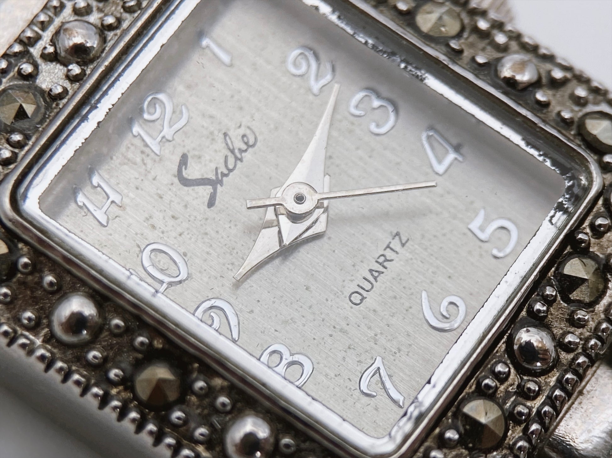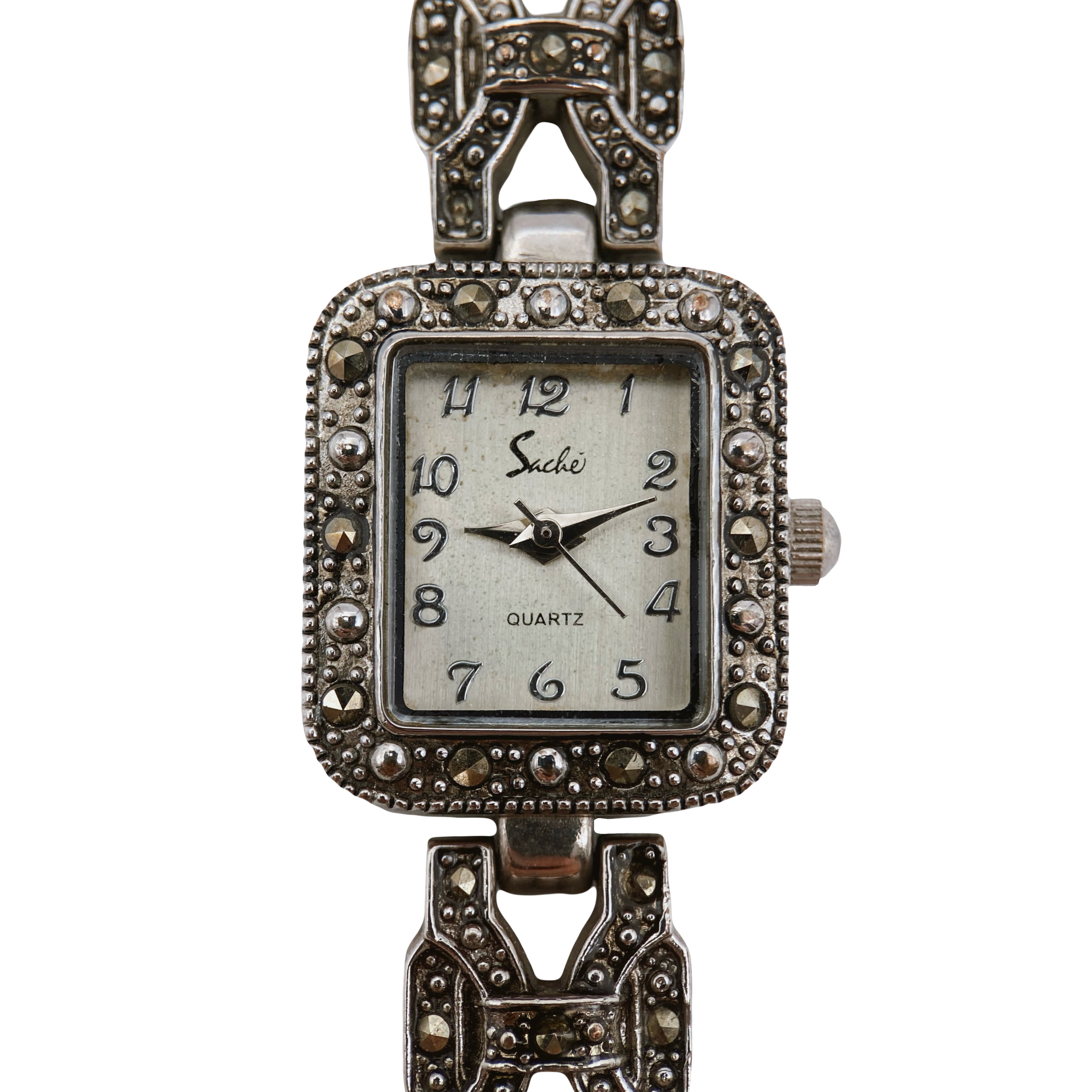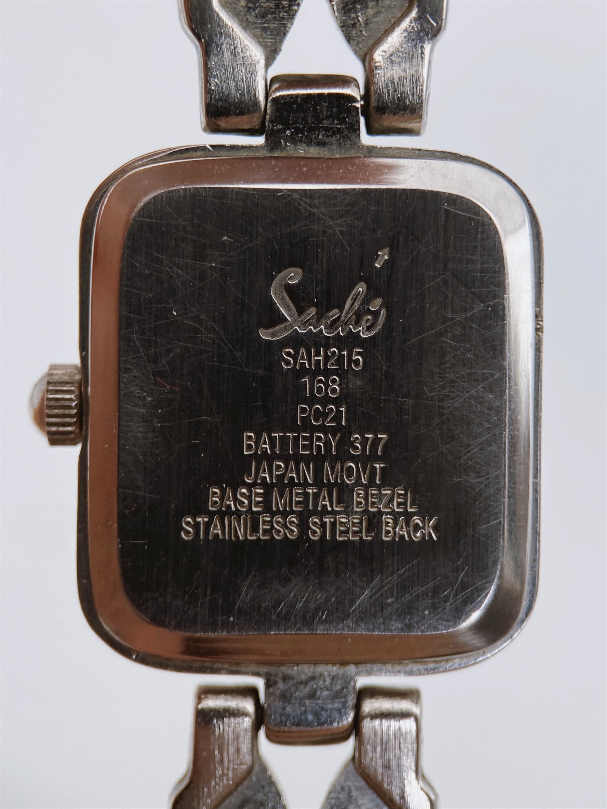 Tai moteriškas kvarcinis laikrodis „Saché“, dekoruotas markazitais ir stačiakampiais šviesiai rožiniais stiklo akmenimis. Laikrodžio korpusas stačiakampis, sidabro spalvos, su dekoratyviniu rėmeliu, puoštas blizgiais markazitais, suteikiančiais jam art deco įkvėptą eleganciją. Ciferblatas sidabro atspalvio, su arabiškais skaitmenimis ir užrašu „Saché Quartz“, rodyklės plonos, sidabro spalvos. Apyrankė sudaryta iš ornamentuotų segmentų, taip pat dekoruotų markazitais ir stačiakampiais rožiniais stiklo akmenimis, kurie priduoda subtilaus spalvinio akcento. Dangtelis iš nerūdijančio plieno („stainless steel back“), su užrašu apie japonišką mechanizmą („Japan Movt“) ir modelio kodu SAH215.