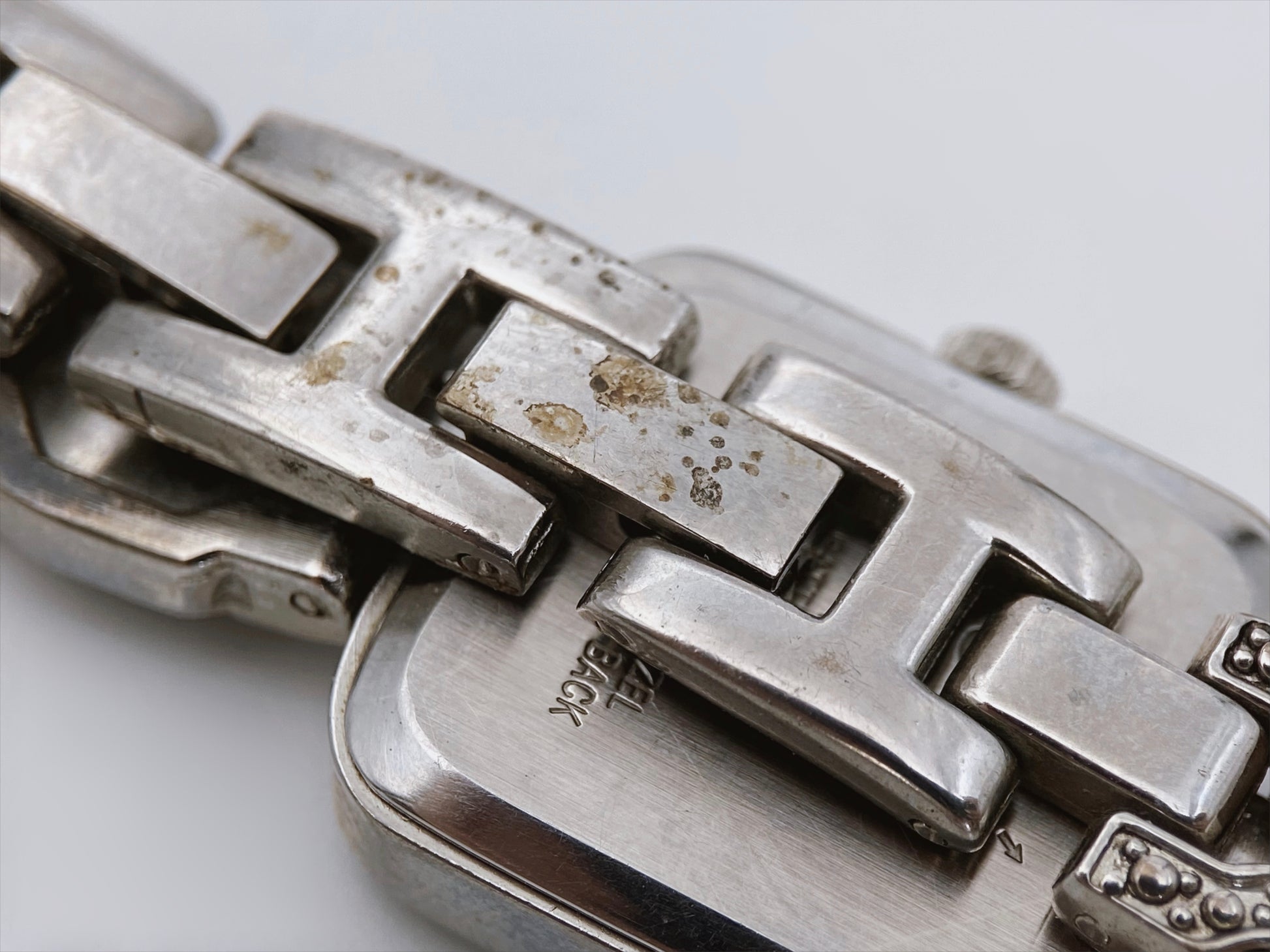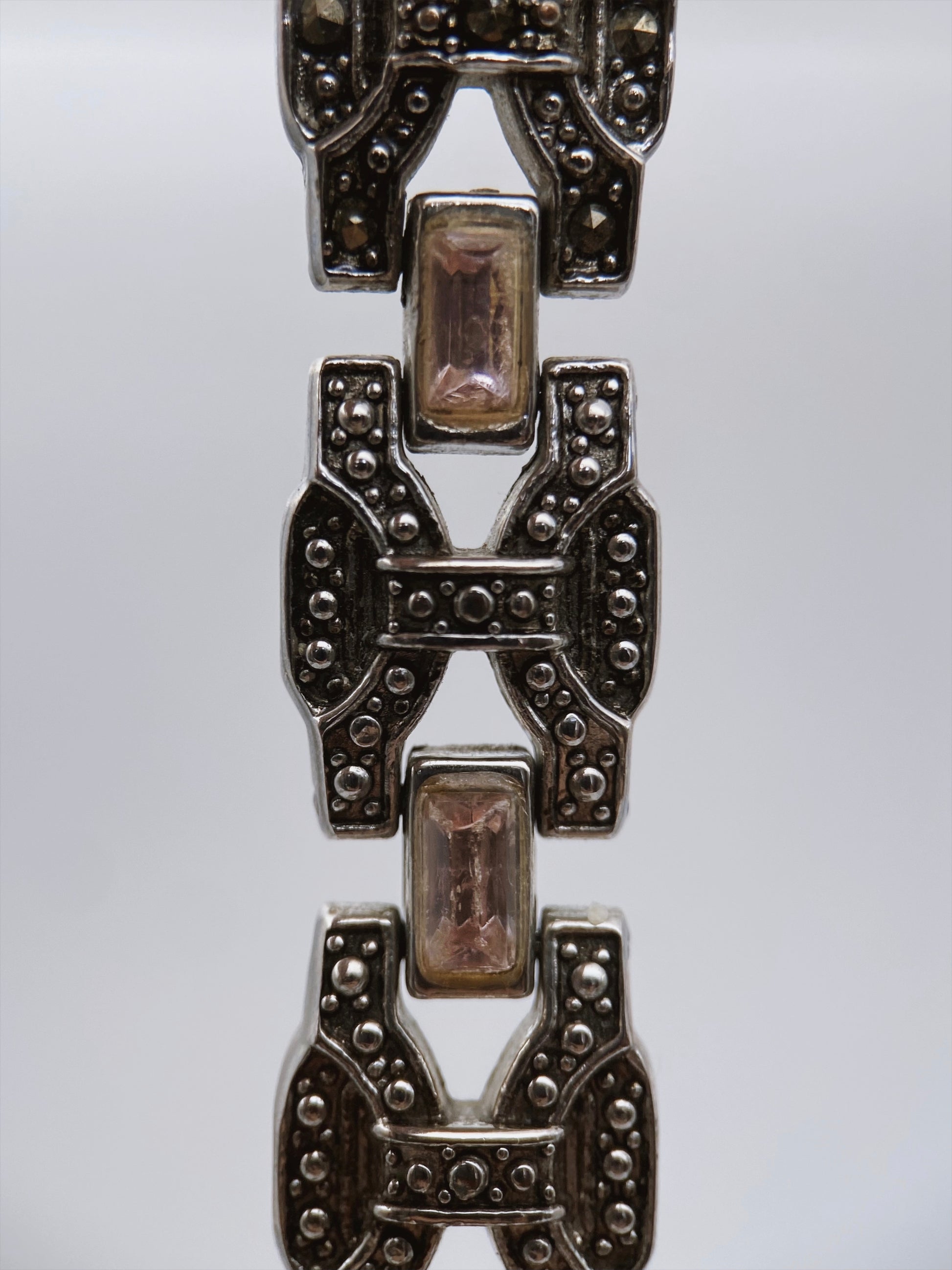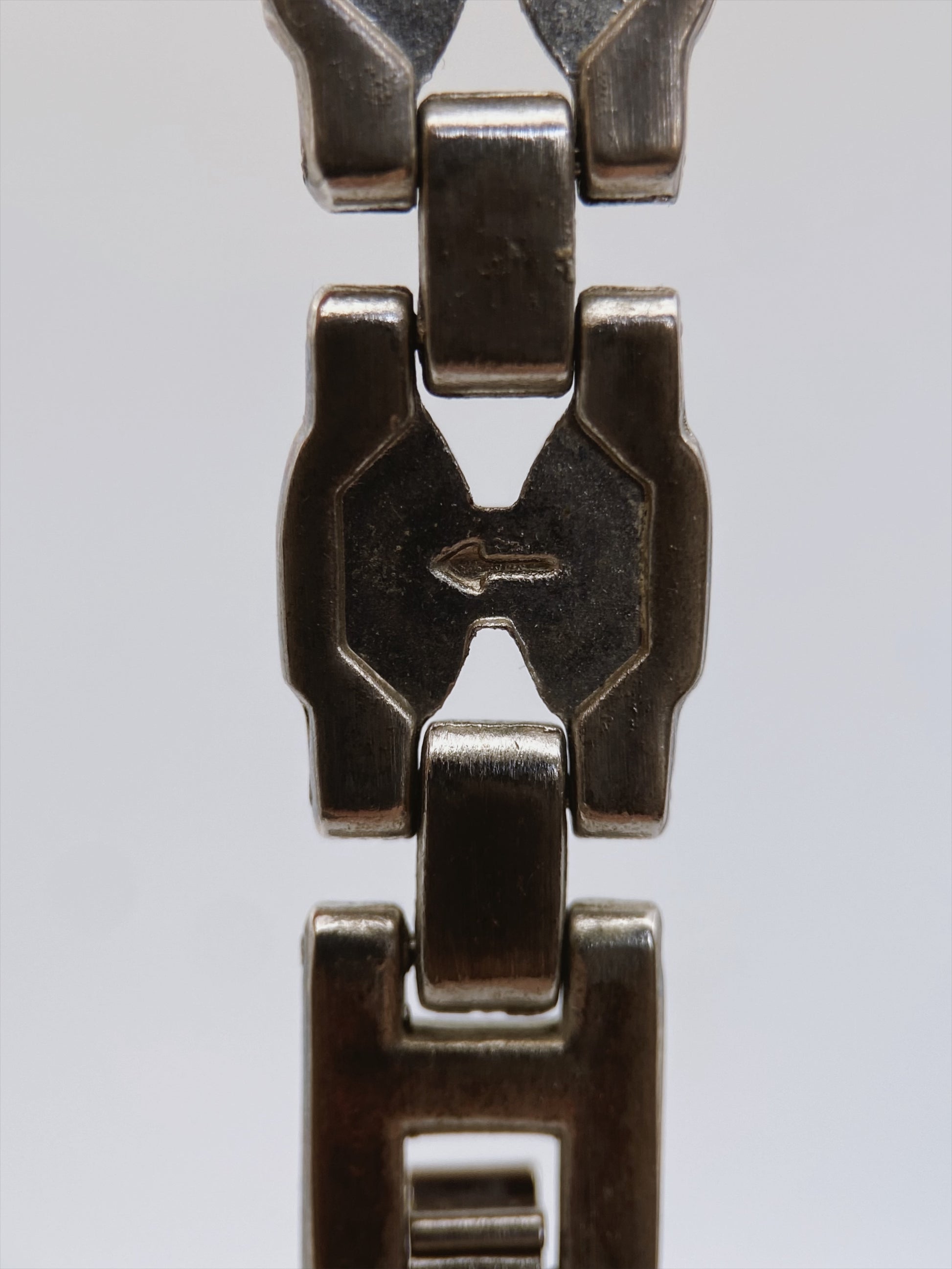 Tai moteriškas kvarcinis laikrodis „Saché“, dekoruotas markazitais ir stačiakampiais šviesiai rožiniais stiklo akmenimis. Laikrodžio korpusas stačiakampis, sidabro spalvos, su dekoratyviniu rėmeliu, puoštas blizgiais markazitais, suteikiančiais jam art deco įkvėptą eleganciją. Ciferblatas sidabro atspalvio, su arabiškais skaitmenimis ir užrašu „Saché Quartz“, rodyklės plonos, sidabro spalvos. Apyrankė sudaryta iš ornamentuotų segmentų, taip pat dekoruotų markazitais ir stačiakampiais rožiniais stiklo akmenimis, kurie priduoda subtilaus spalvinio akcento. Dangtelis iš nerūdijančio plieno („stainless steel back“), su užrašu apie japonišką mechanizmą („Japan Movt“) ir modelio kodu SAH215.