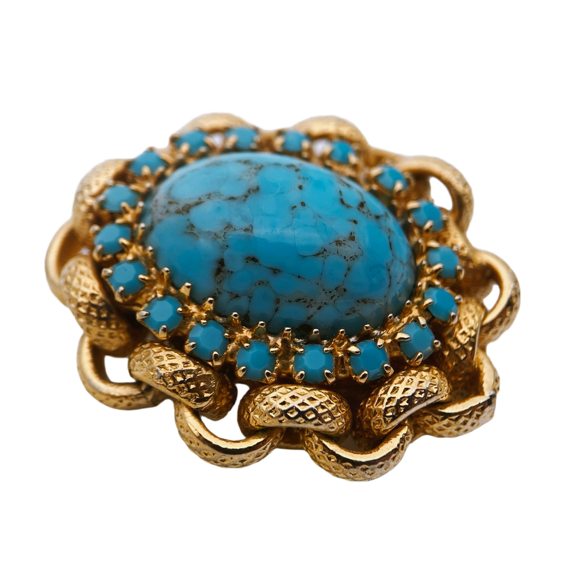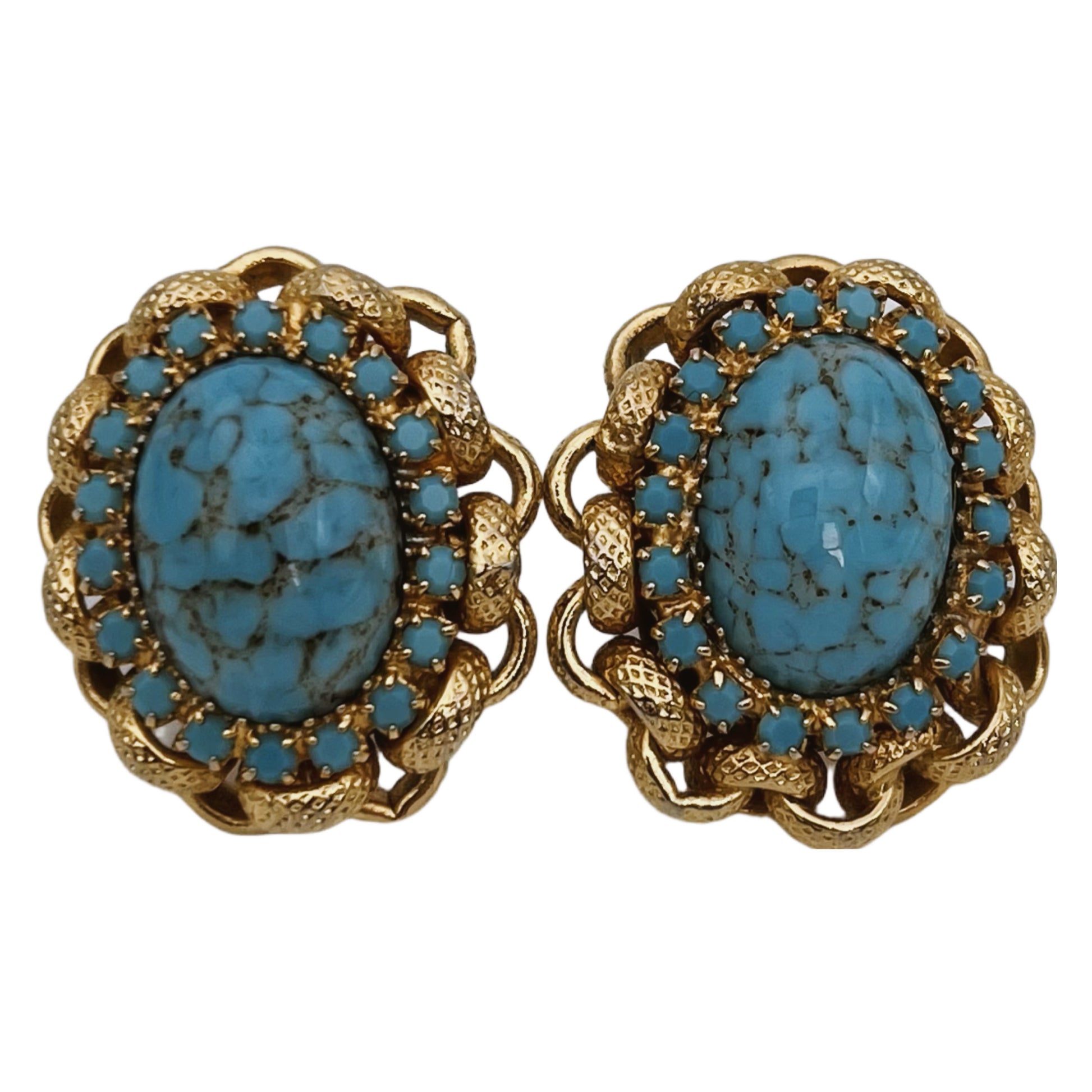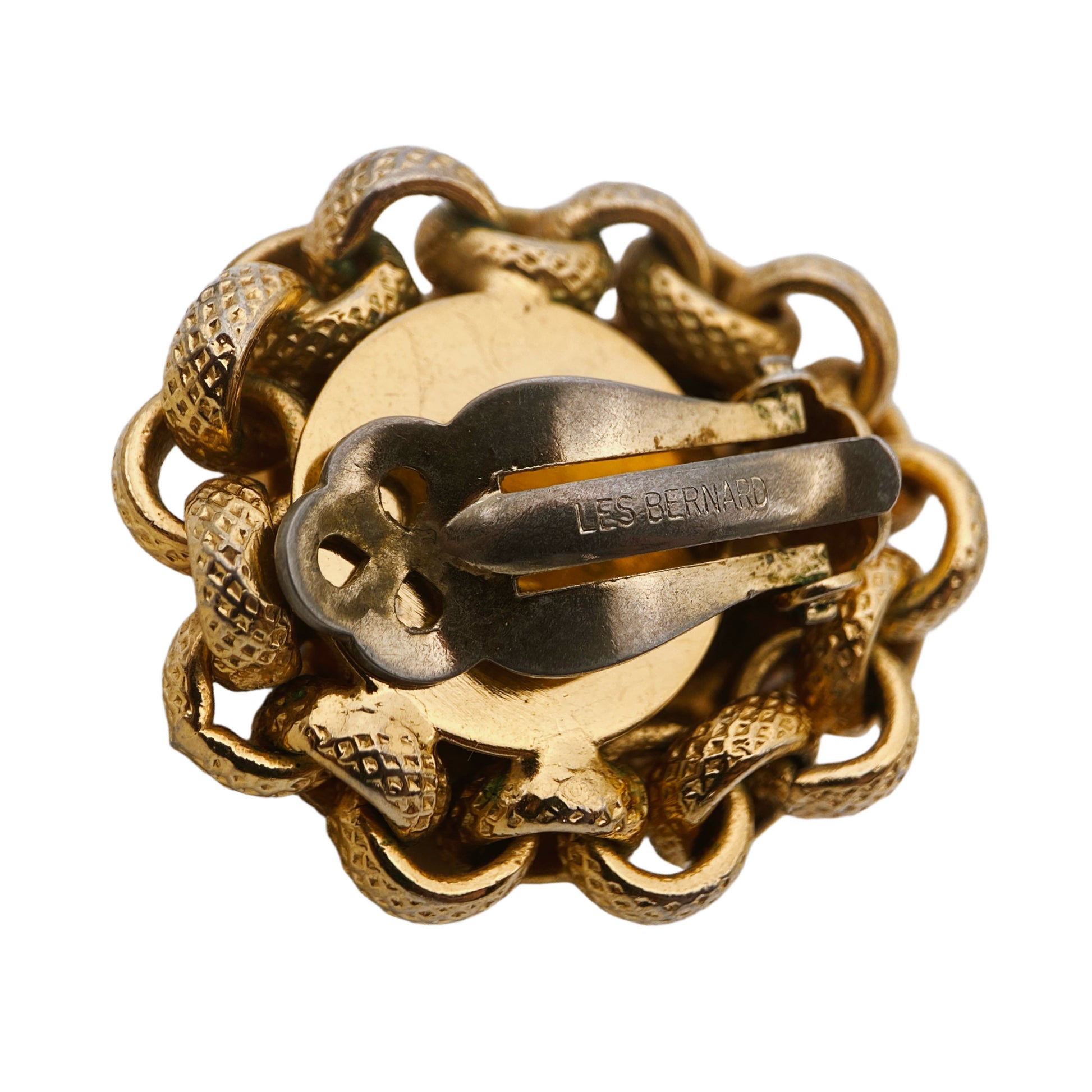 Šie auskarai yra Les Bernard ženklo – tai labai gerai žinoma ir vertinama JAV kostiuminės bižuterijos įmonė, veikusi nuo 1963 m. iki apie 1996 m. Šie auskarai puikiai atspindi jų kūrybos laikotarpį ir stilių. Dizainas: auksaspalvis, tekstūrinis metalas, imituojantis pynimą, dekoruotas centriniu dideliu „turkio“ imitacijos ovaliu akmeniu, apsuptu mažesniais turkio spalvos akmenukais. Šie auskarai greičiausiai pagaminti apie 1970–1980-uosius metus, remiantis: dizaino stilistika (barokinė, ryški, su gėliškais, pynimo motyvais) bei tipiniu Les Bernard klipsų mechanizmu bei ženklinimo stiliumi.
