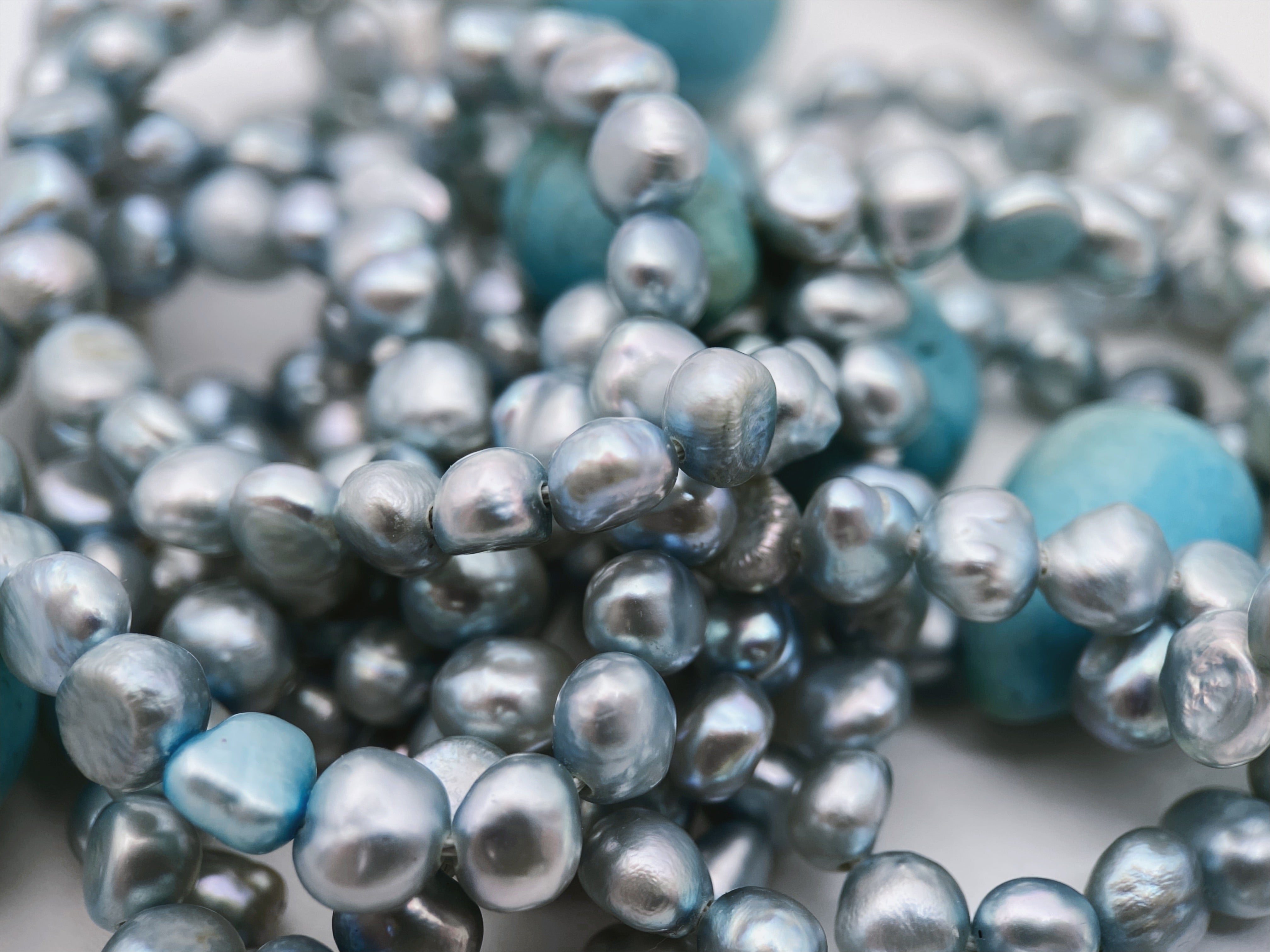 Sudėtis: barokinės formos gėlavandeniai perlai, magnezitas