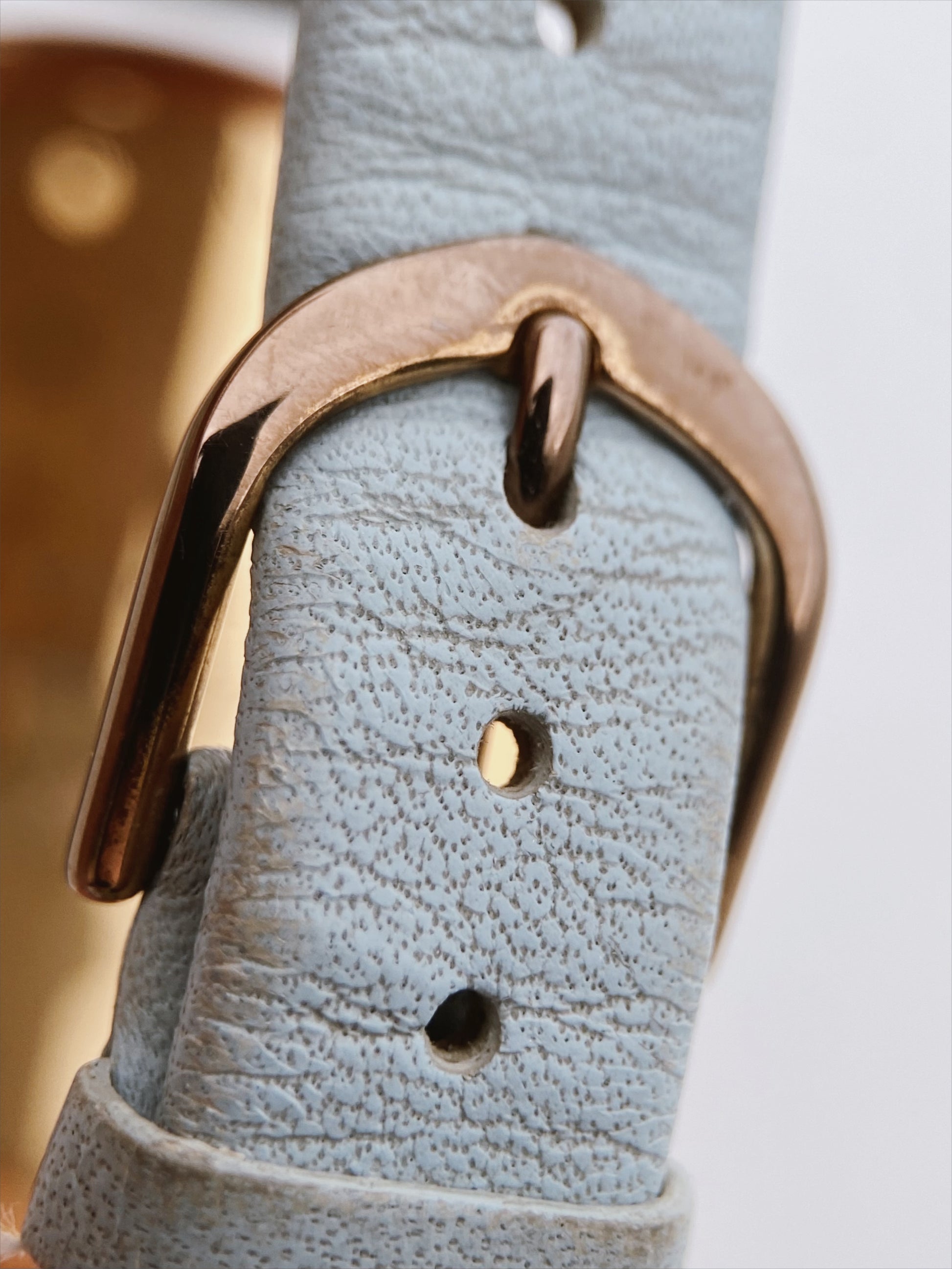 Išskirtinio dizaino laikrodis iš britų prekės ženklo “Olivia Burton” kolekcijos. Šis modelis pasižymi subtilia estetika ir romantišku koloritu – šviesiai rožinio aukso spalvos ciferblatas puikiai dera su šviesiai mėlynu natūralios odos dirželiu, pažymėtu logotipu. Ciferblatas - šviesiai rožinio aukso su romėniškais XII ir VI žymėjimais, mechanizmas - Quartz, Japan movement.